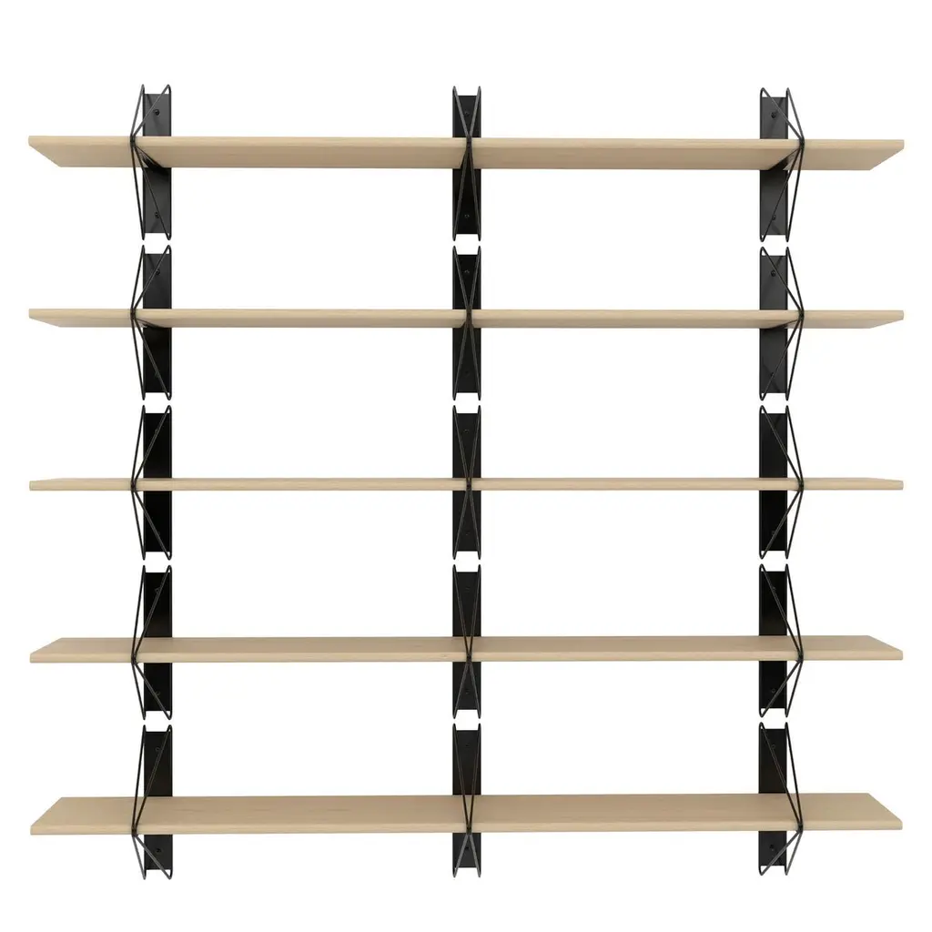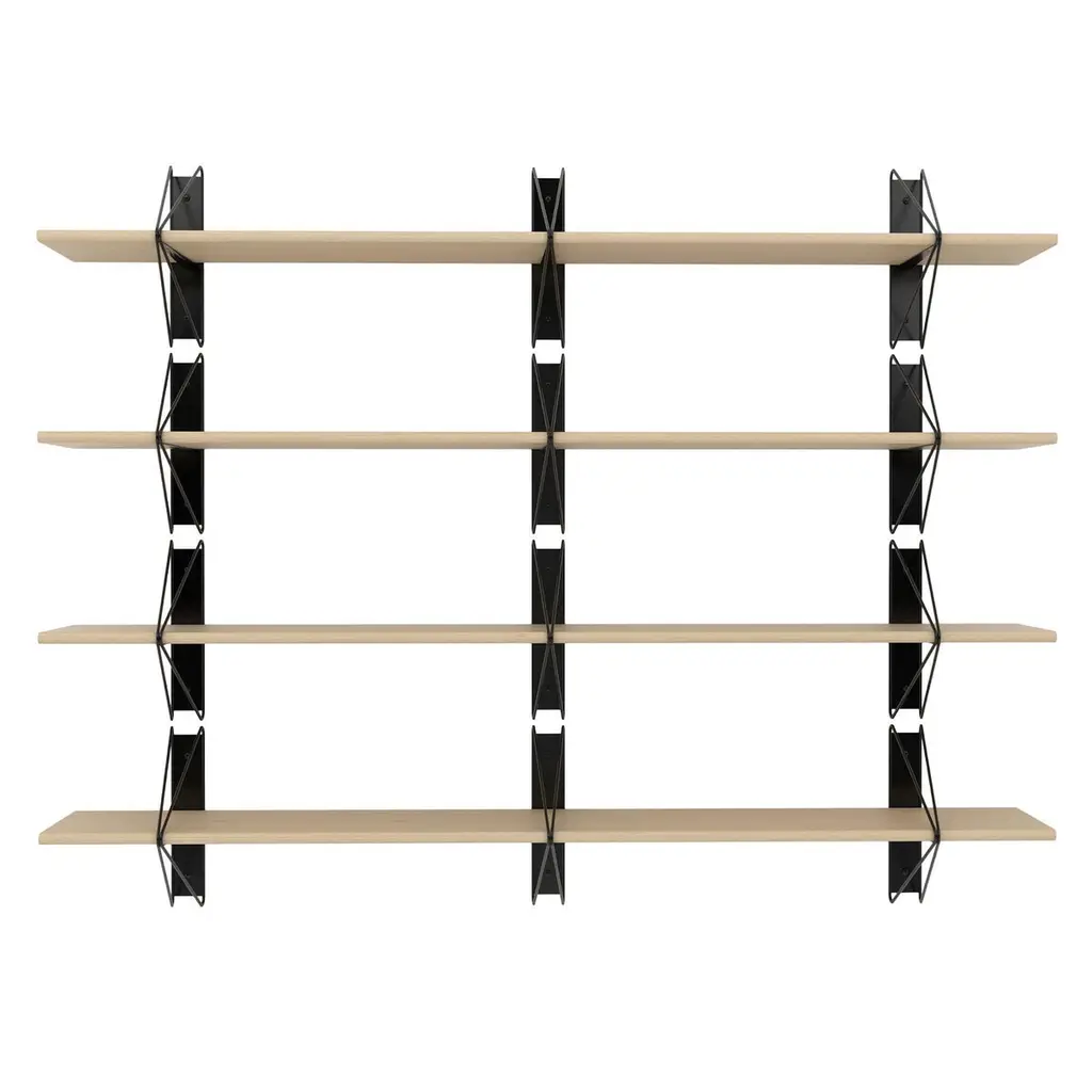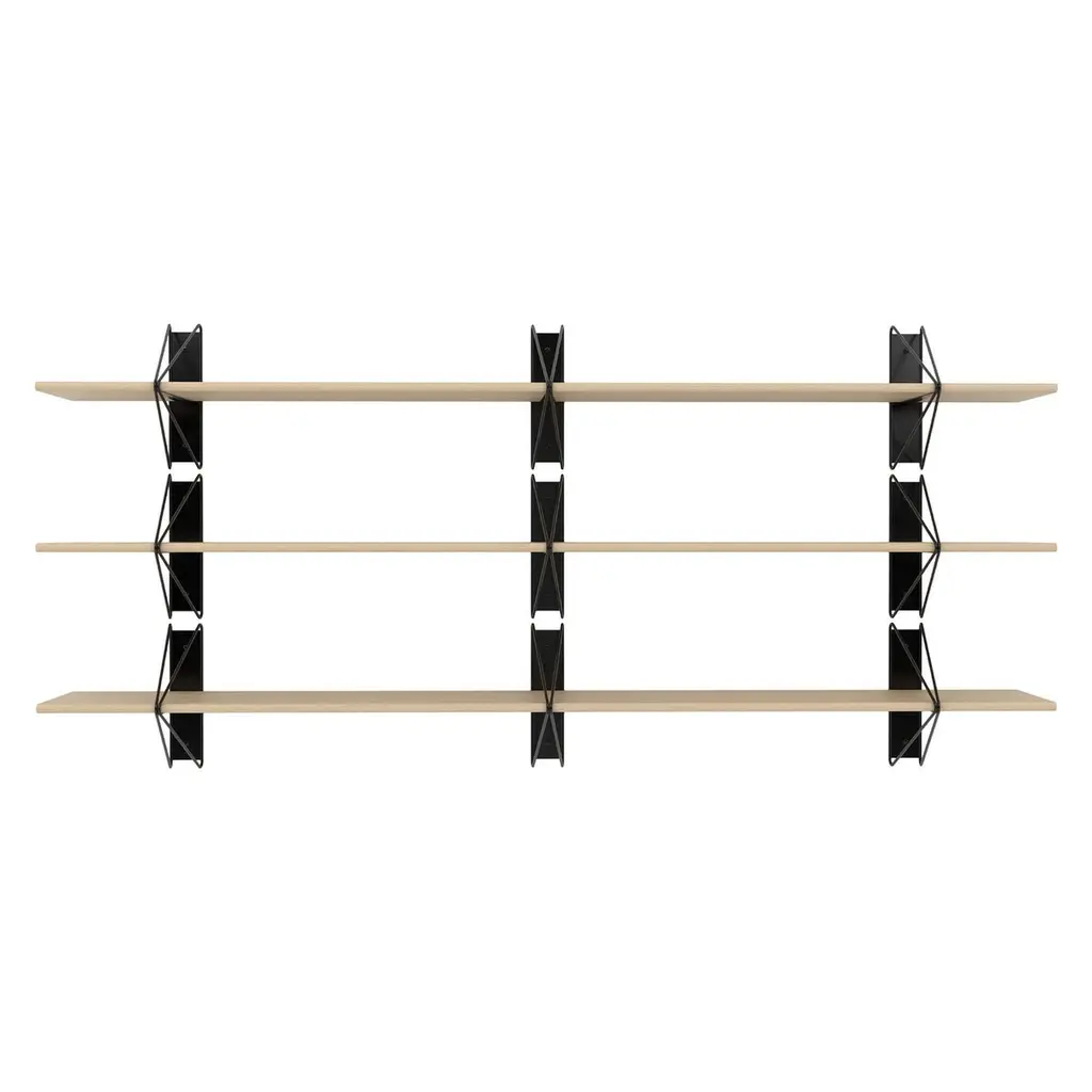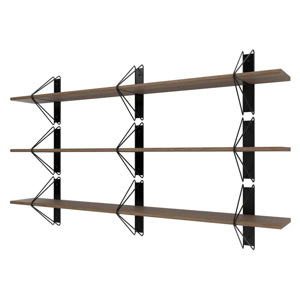 Price on this configuration includes 3 84" shelves and 9 brackets. This shelving system is really easy to customize: we offer multiple wood finishes, bracket finishes, and we can adjust the length on a per order basis. You can buy single shelves or use multiples as shown in the main image. Please send us a message if you'd like a quote on a particular size/finish.Modern minimalism meets Classic architectural construction in the strut shelving system. Inspired by the Manhattan bridge and construction techniques of early aircraft, the modular system is functional and flexible making it ideal for commercial and residential spaces alike. Offered in both powder coated and plated options, the polished simplicity and adaptability of the system is sure to support any interior effortlessly.