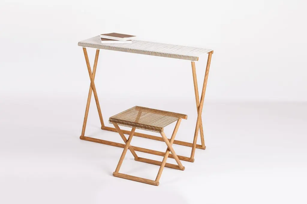 Set of 3 Trestle Collection by MingardoDimensions: D20 x W10 x H42,4 cmD96 x W80 x H32 cmD96 x W32 x H80 cm Materials: Nat. Or wengé oak wood structure. Satin nat. Brass/or copper rods top. IronAlso Available in different finishes.The tables of Trestle collection are composed by an oak wood folding structure (diameter 30-25 mm) realized with a natural or wengè finish, and a completely handmade top plan, made by a complex weave of metal rods curved and welded.Also available with the structure in varnished iron.On request, the top can be made out of with a plain metal sheet (2mm thick) epoxy powder coated.Mingardo Ilario founded Mingardo Blacksmith Workshop in 1970, after over twenty years’ experience in the metal processing field.The production was initially focused on simple blacksmith works for the construction industry. Over the time, it has become more refined, enabling the company to collaborate with internationally renowned companies and architects: from the first collaborations with architect Carlo Scarpa to the more recent commissions for Museo del Novecento in Milan, Parco della Musica in Florence, and Teatro Petruzzelli in Bari.Over the years, the Workshop has achieved great results, with the production of unique metal products, all hand-wrought by a highly skilled team of specialized artisans. Nowadays, it is highly regarded in the local artisan field for its high-end refined finishing touches and details, and for its know-how.