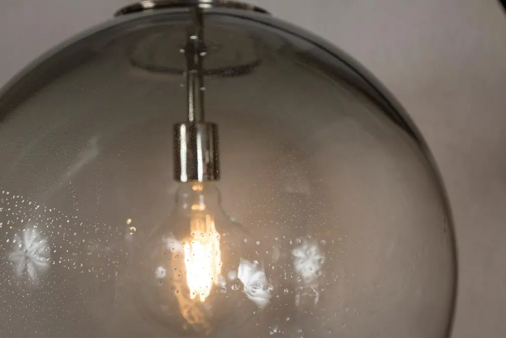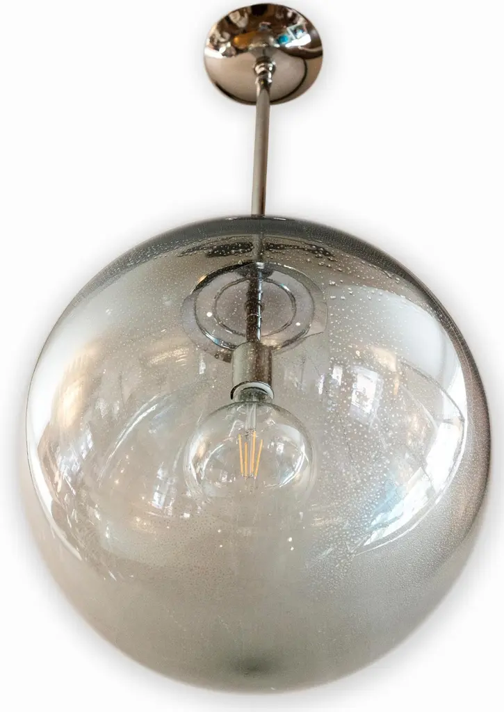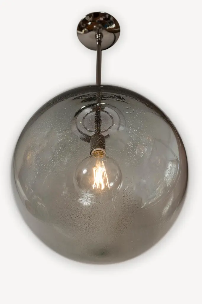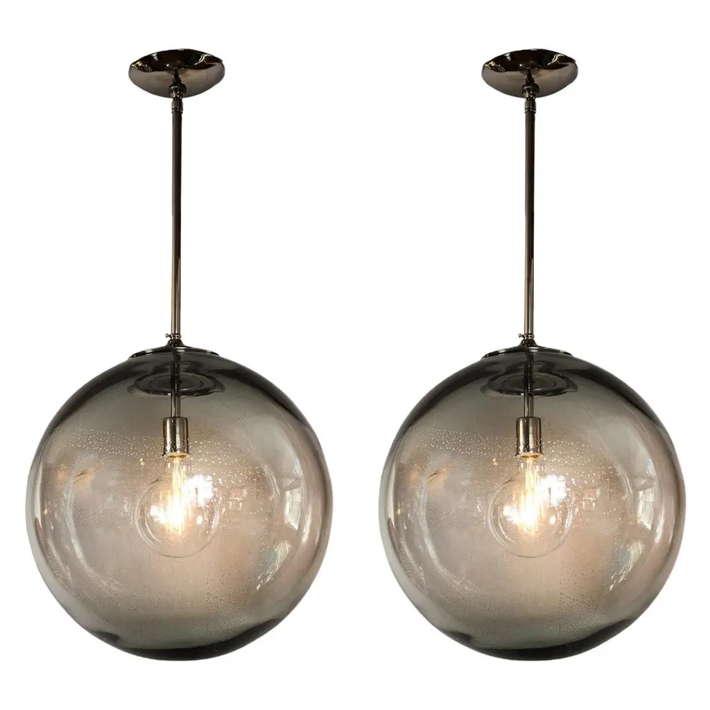 A wonderful set of 3 very large mouth blown globe shaped pendants in a light gray with silver. The silver offers a subtle texture with speckling and light overall shimmery quality upon illumination. Each globe while the same color are unique in its silver distribution.The frame is fabricated to your desired overall height and finish. The frame is custom fabricated in the US and shown in a polished nickel finish on brass. Sold as install ready and UL certified.Dating: Contemporary, Limited Edition, commissioned by L'AntiquaireOrigin: Murano, ItalyDimensions Glass 18" diameter, OAH shown 36"Condition: Very GoodWeight: approx 30lbs, the glass is heavy and blown thicklyPriced As Set Of 3