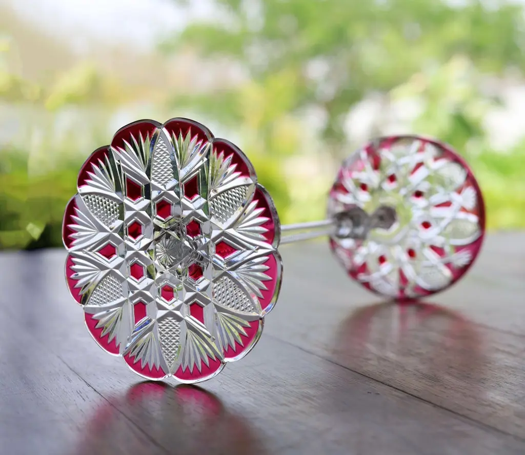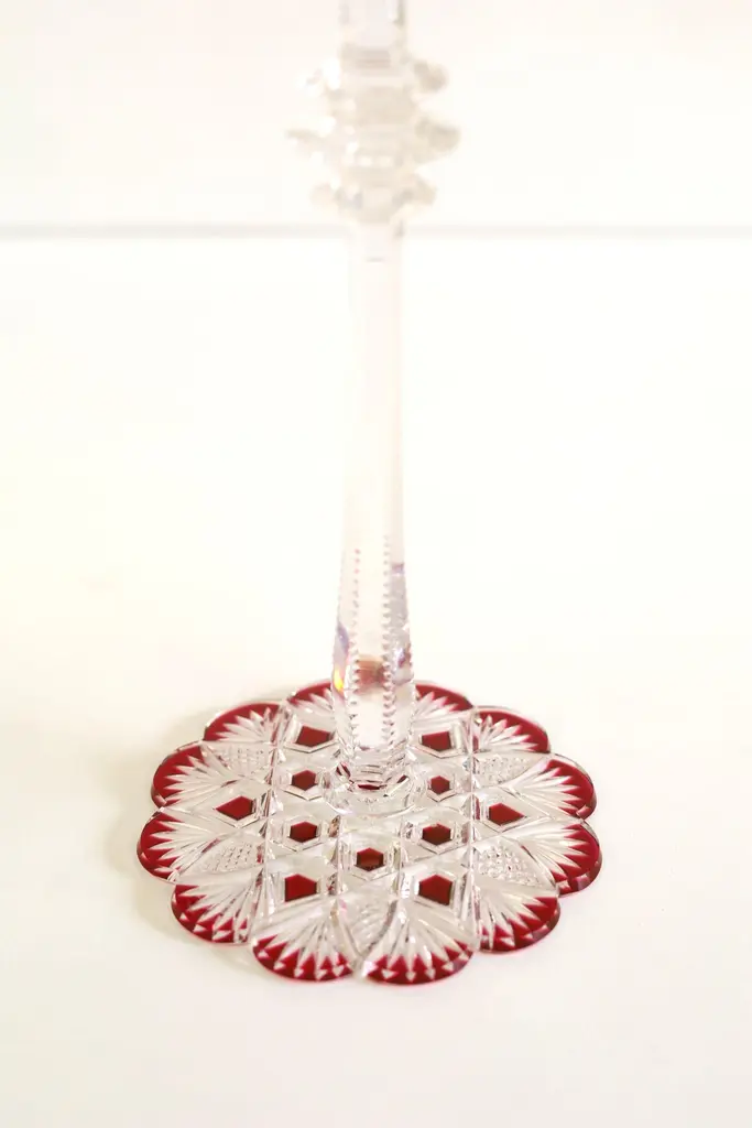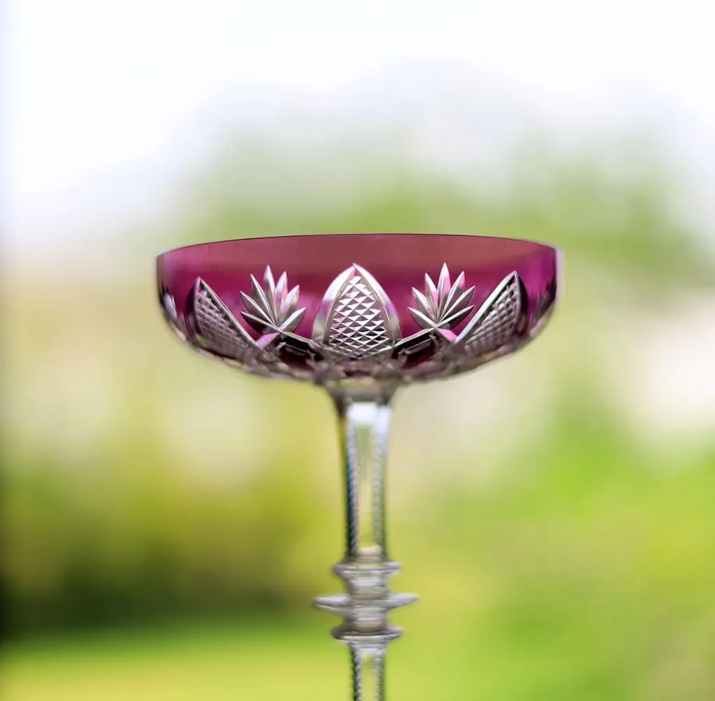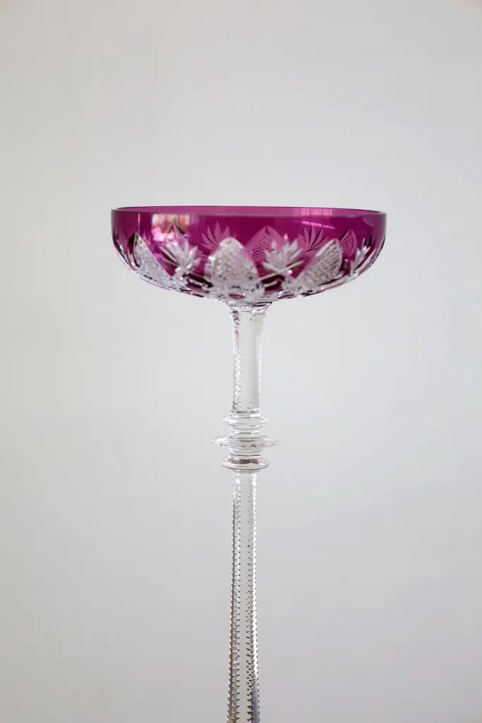 Created for Tsar Nicholas II, this clear crystal bowl - overlaid in coloured crystal with a high stem, a scalloped base, and diamond and palm leaf decorations - is spectacular. This exceptional set won over many aristocrats in the Imperial Court and is to this day a reflection of the House of Baccarat's excellence. Different colors available.Stamped and signed.Great condition probably never used.