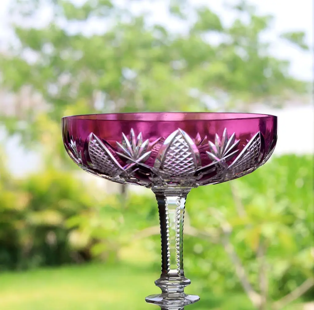 Created for Tsar Nicholas II, this clear crystal bowl - overlaid in coloured crystal with a high stem, a scalloped base, and diamond and palm leaf decorations - is spectacular. This exceptional set won over many aristocrats in the Imperial Court and is to this day a reflection of the House of Baccarat's excellence. Different colors available.Stamped and signed.Great condition probably never used.