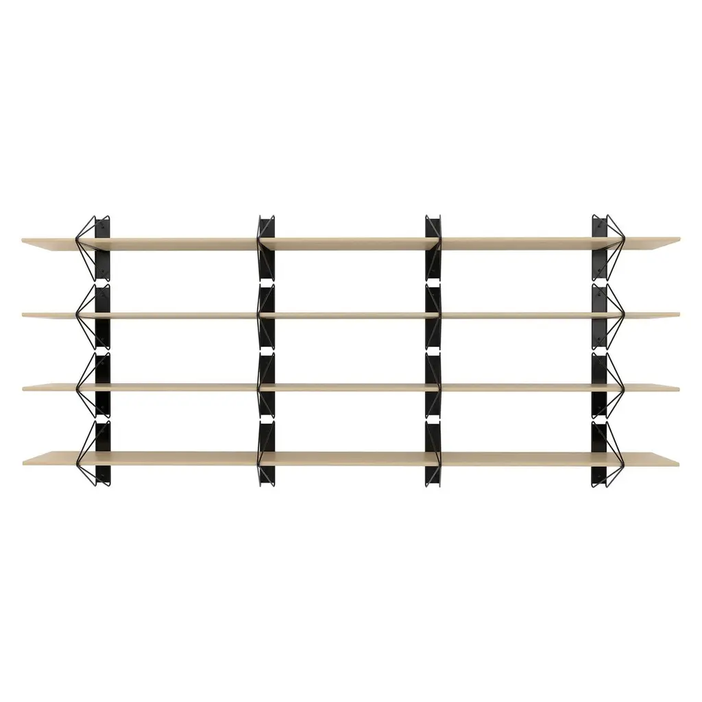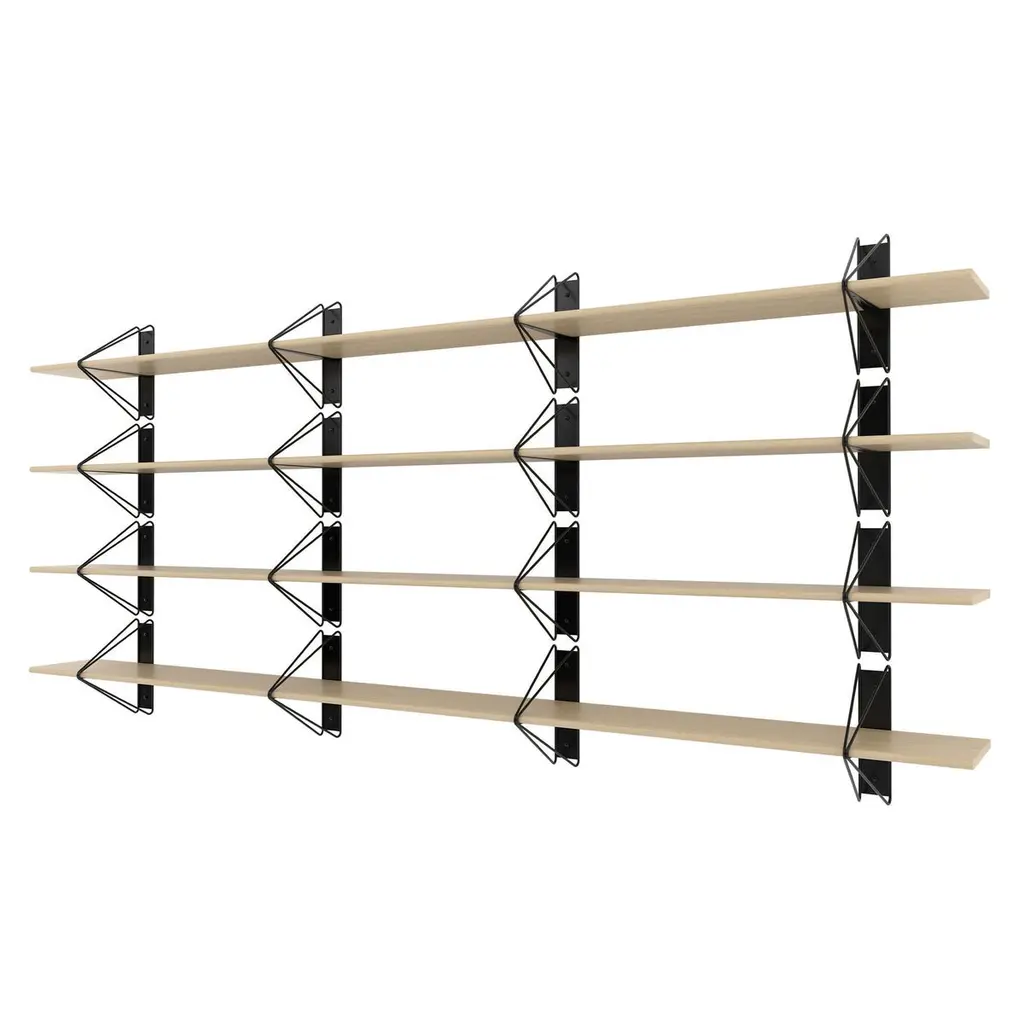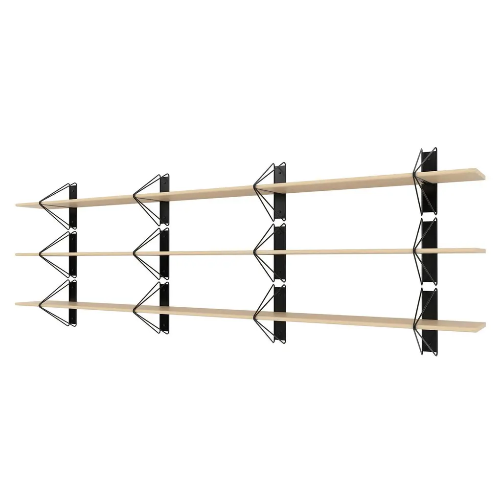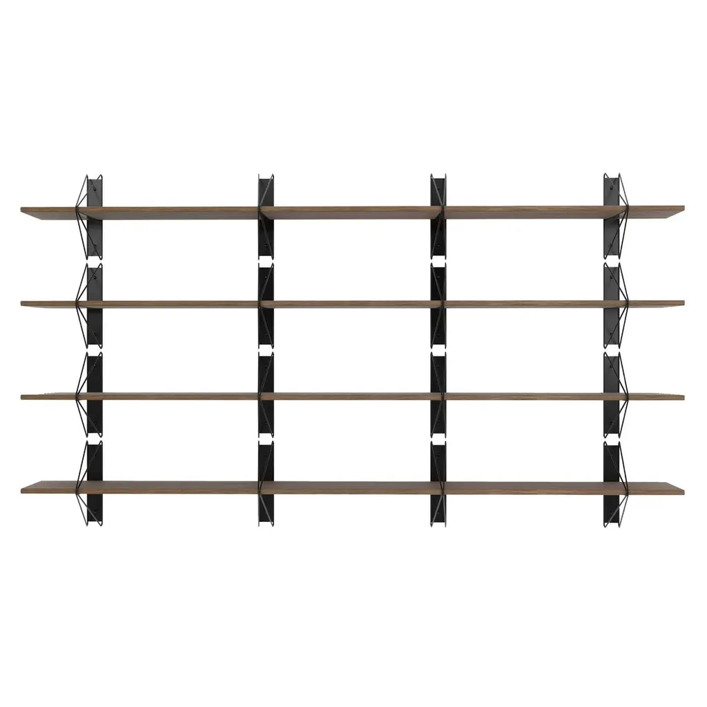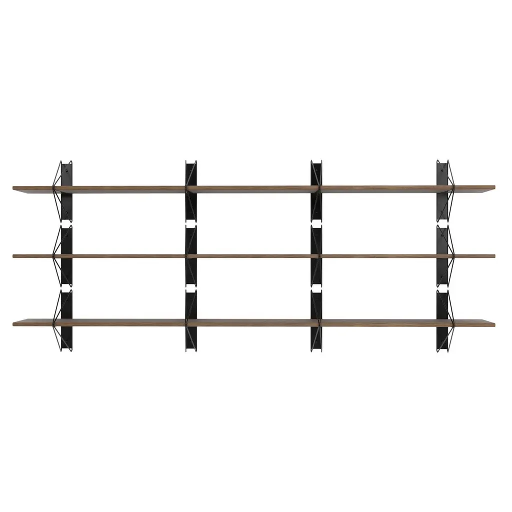 Price on this configuration includes 5 116" shelves and 20 brackets. This shelving system is really easy to customize: we offer multiple wood finishes, bracket finishes, and we can adjust the length on a per order basis. You can buy single shelves or use multiples as shown in the main image.Modern minimalism meets classic architectural construction in the strut shelving system. Inspired by the Manhattan bridge and construction techniques of early aircraft, the modular system is functional and flexible making it ideal for commercial and residential spaces alike. Offered in both powder coated and plated options, the polished simplicity and adaptability of the system is sure to support any interior effortlessly.