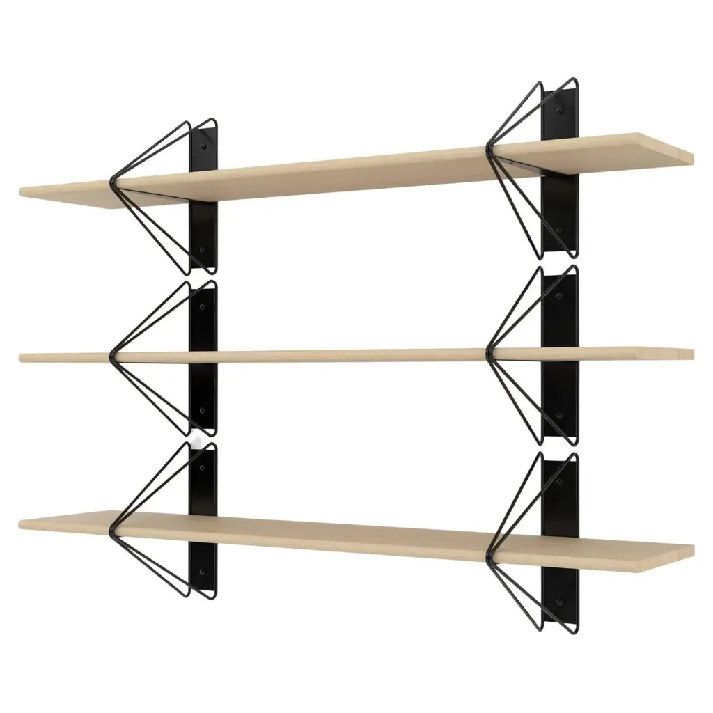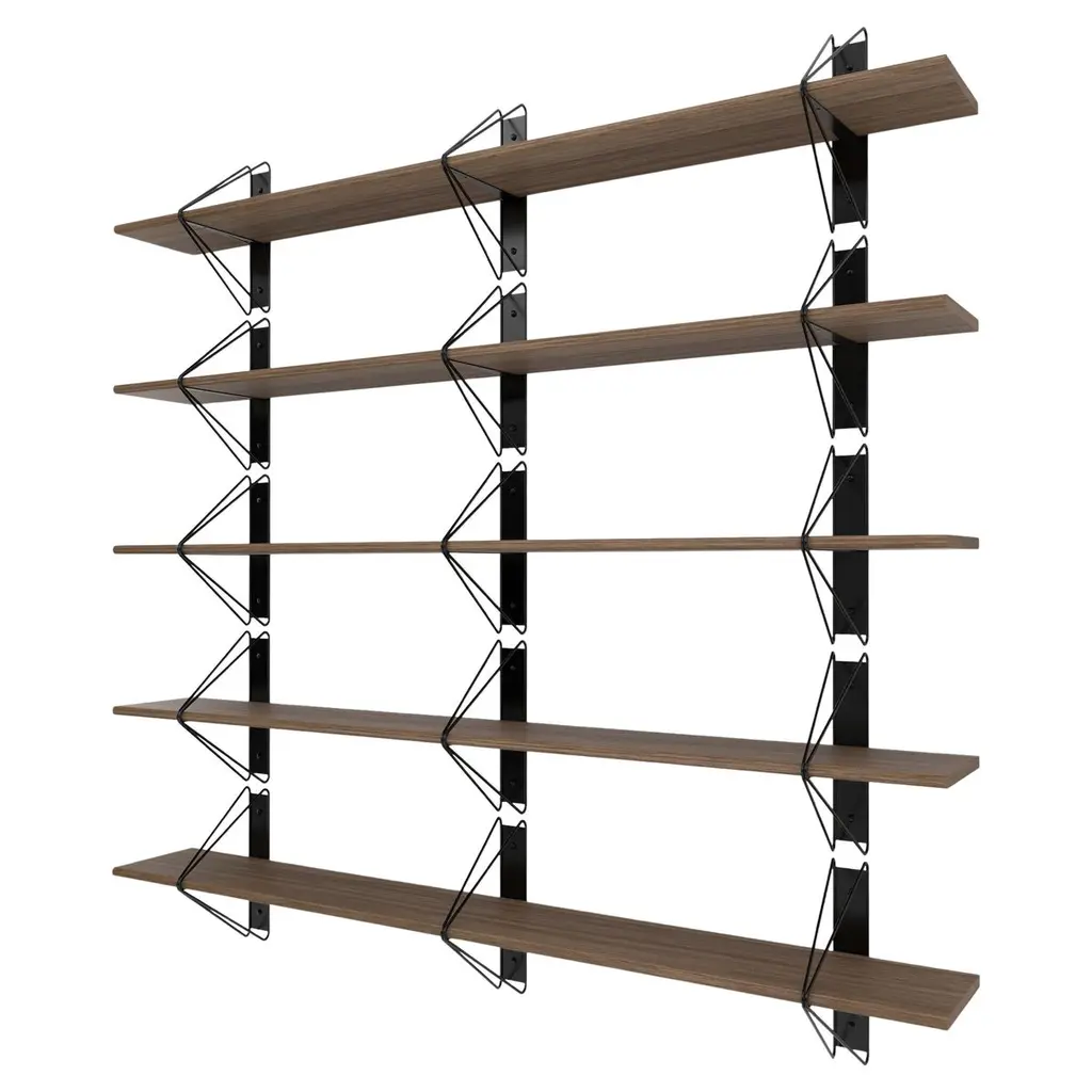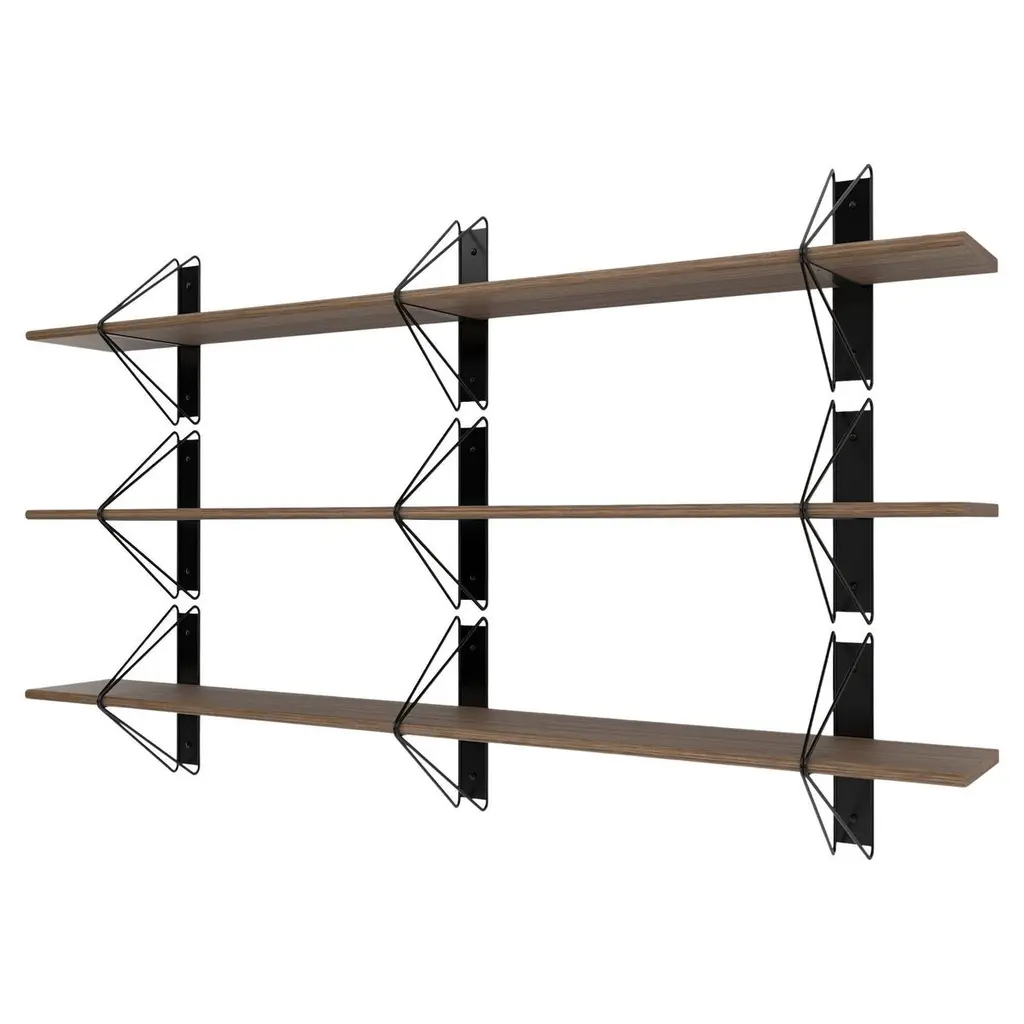 Price on this configuration includes 5 84" Shelves & 15 Brackets. This shelving system is really easy to customize: we offer multiple wood finishes, bracket finishes, and we can adjust the length on a per order basis. You can buy single shelves or use multiples as shown in the main image. Modern minimalism meets Classic architectural construction in the strut shelving system. Inspired by the Manhattan bridge and construction techniques of early aircraft, the modular system is functional and flexible making it ideal for commercial and residential spaces alike. Offered in both powder coated and plated options, the polished simplicity and adaptability of the system is sure to support any interior effortlessly.