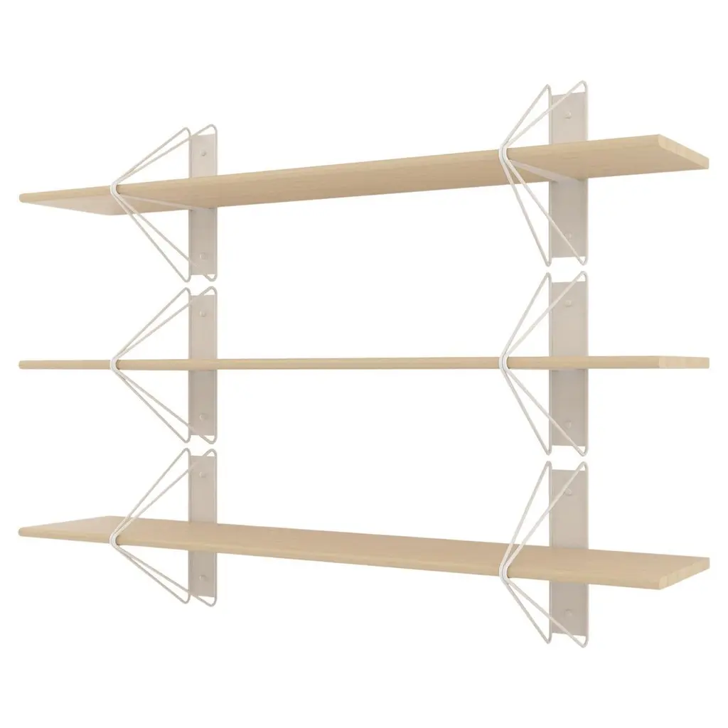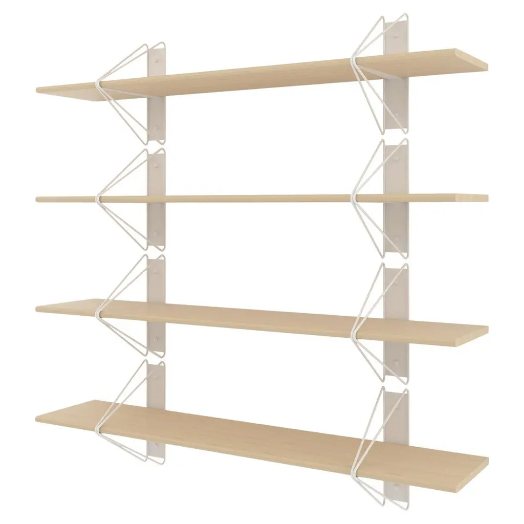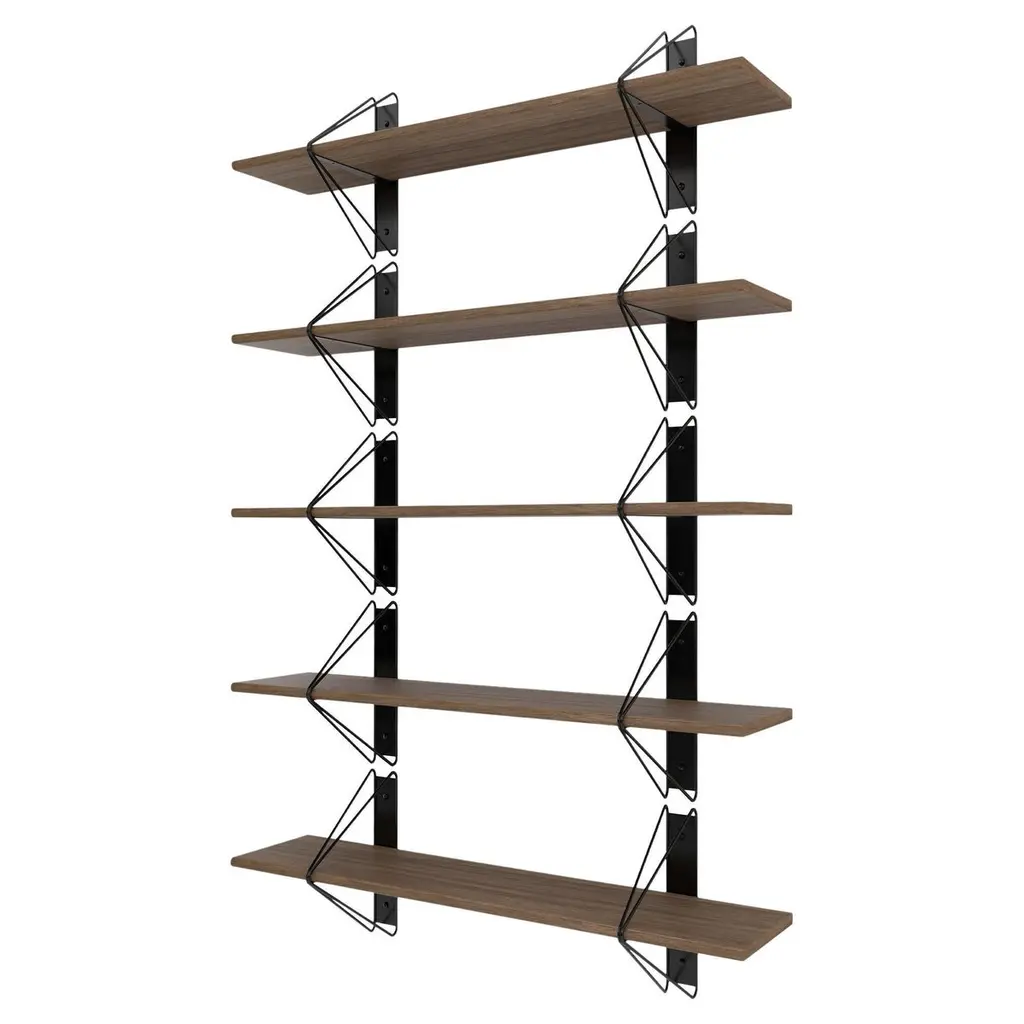 Price on this configuration includes 5 84" Shelves & 15 Brackets. This shelving system is really easy to customize: we offer multiple wood finishes, bracket finishes, and we can adjust the length on a per order basis. You can buy single shelves or use multiples as shown in the main image. Modern minimalism meets Classic architectural construction in the strut shelving system. Inspired by the Manhattan bridge and construction techniques of early aircraft, the modular system is functional and flexible making it ideal for commercial and residential spaces alike. Offered in both powder coated and plated options, the polished simplicity and adaptability of the system is sure to support any interior effortlessly.