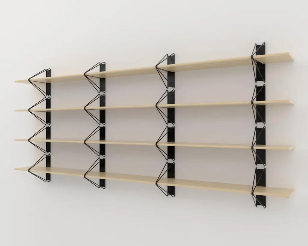 This includes 5 84" Shelves & 15 Brackets. This shelving system is really easy to customize: we offer multiple wood finishes, bracket finishes, and we can adjust the length on a per order basis. You can buy single shelves or use multiples as shown in the main image. Modern minimalism meets Classic architectural construction in the strut shelving system. Inspired by the Manhattan bridge and construction techniques of early aircraft, the modular system is functional and flexible making it ideal for commercial and residential spaces alike. Offered in both powder coated and plated options, the polished simplicity and adaptability of the system is sure to support any interior effortlessly.