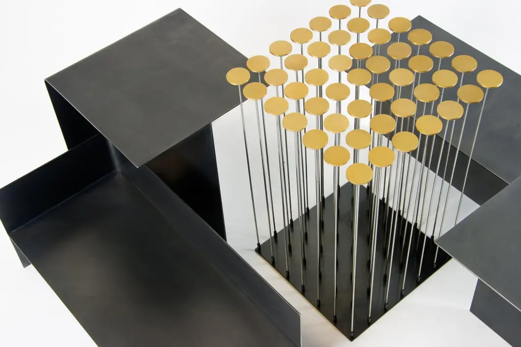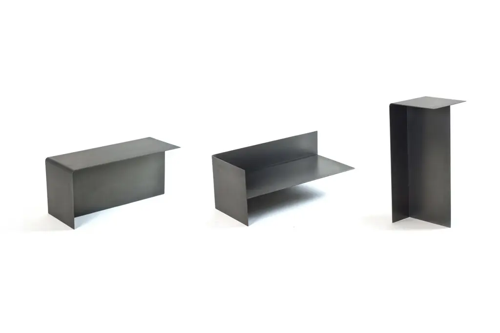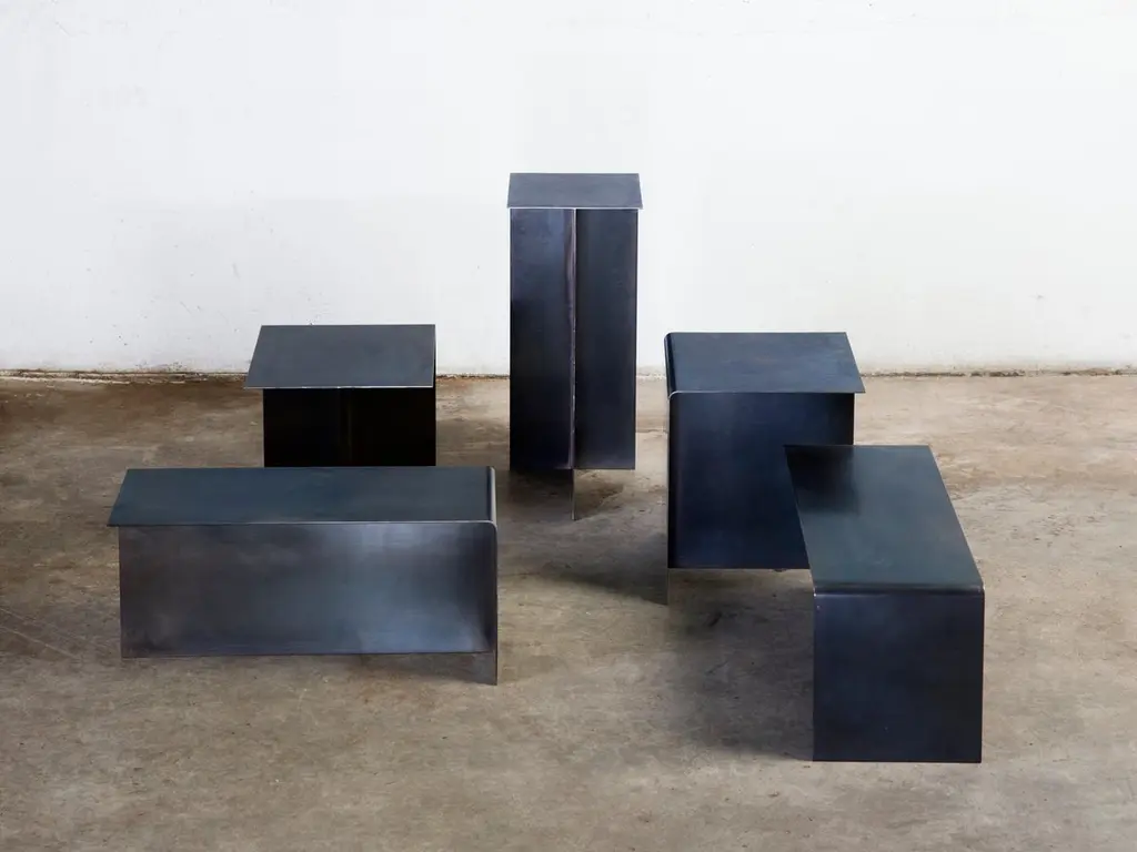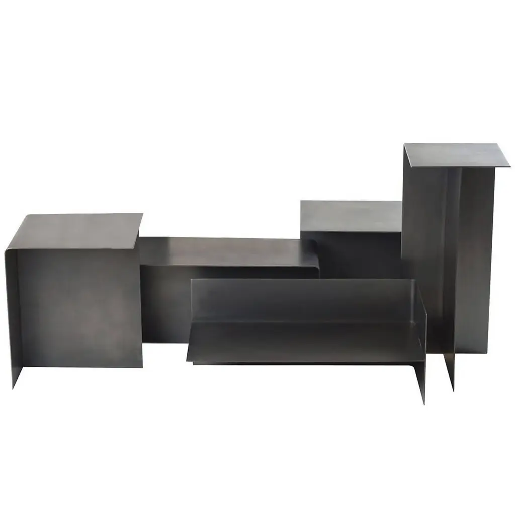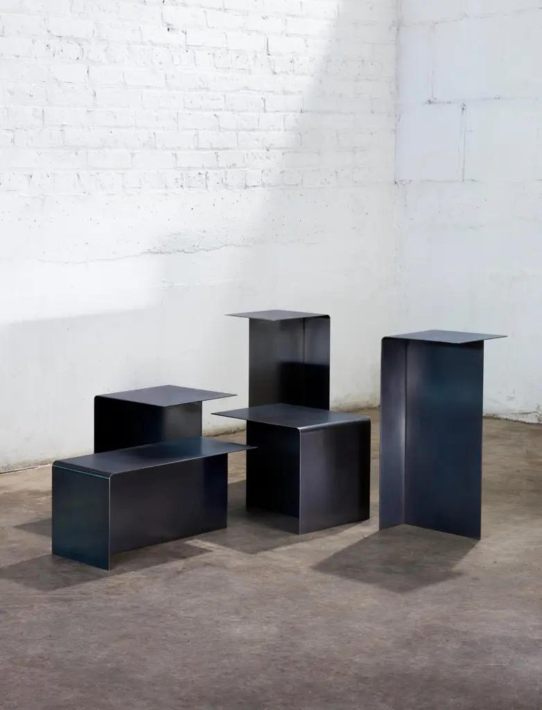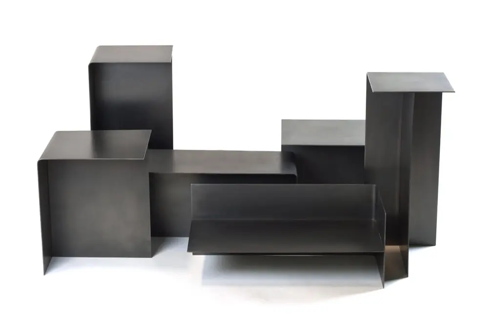 Set of 5 "T" tables by Gentner DesignDimensions: D 22.8 x W 25.4 x H 55.8 cm (tall),D 30 x W 30 x H 35.5 cm (short)Materials: darkened stainless steel3x Tall "T" table2 x Short "T" tableThe T Table Collection consists of two different sizes of t-shaped tables creating multidimensional surfaces that are ever changing to fit the user’s needs. Sold separately or as a collection, the T Tables fit are a flexible system as each size can be positioned in three different ways creating endless possibilities.Gentner DesignRooted in a language of sculpture, character defining details, and world renowned craftsmanship, the work is found at the crossroads of design and art.Established in 2011, the namesake furniture label is a rare combination of aesthetic dexterity and mastery of craft resulting in furniture and objects that are expressive, formal, and transcend materiality.The collection is based in metal and incorporates only natural materials such as leather, wood, and glass in unique ways, challenging our assumptions.Christopher GentnerChristopher Gentner, with a BFA in metalsmithing from the Cleveland Institute of Art and apprenticeships under sculptors and jewelers, together with dedication to craft, quickly developed his reputation nationally as a foremost authority of metal fabrication and furniture.One of his crowning achievements was the re-creation and fabrication of the Frank Lloyd Wright Robie House gates.These unique experiences are the foundation of his design philosophy which he employs in his own line of furniture, lighting, and objects.