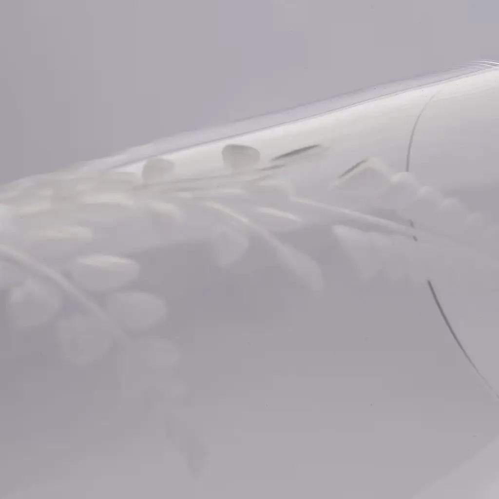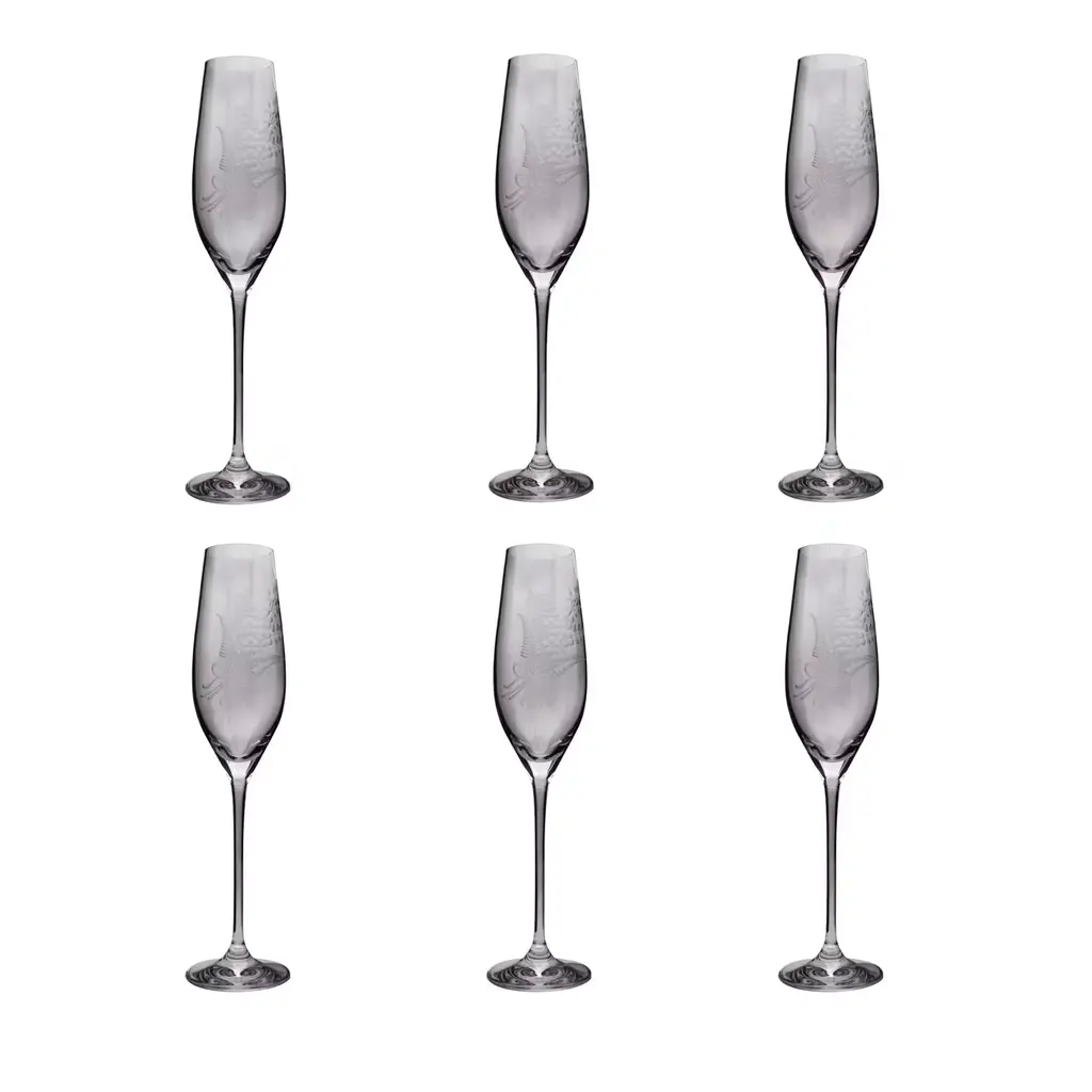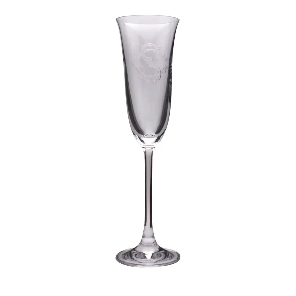 This exquisite set of champagne flute boasts a stunning decoration called "ramo dell'amicizia" (friendship branch). Traditional motif in the small town of Altare, in Liguria, where master artisan Vanessa Cavallaro works. This floral, pattern rendered in exquisite details and stunning texture, depicts a bunch of forget-me-not flowers. This charming decoration was etched on the glass using the wheel and graces the elongated bowl of the flute, which has a capacity of 210 ml.