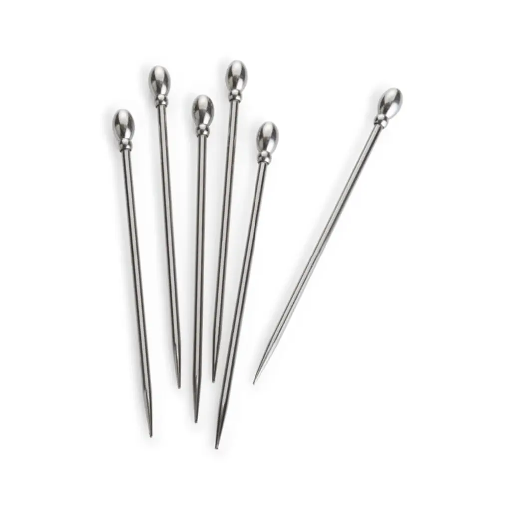 Sleek, sophisticated picks spear your favorite canapes, cocktail snacks or bar garnishes with style. This set of six substantial stainless steel cocktail picks easily pierces harder foods. To unify your barware collection, add one of our stainless steel cocktail shakers, ice buckets and bar tool sets.