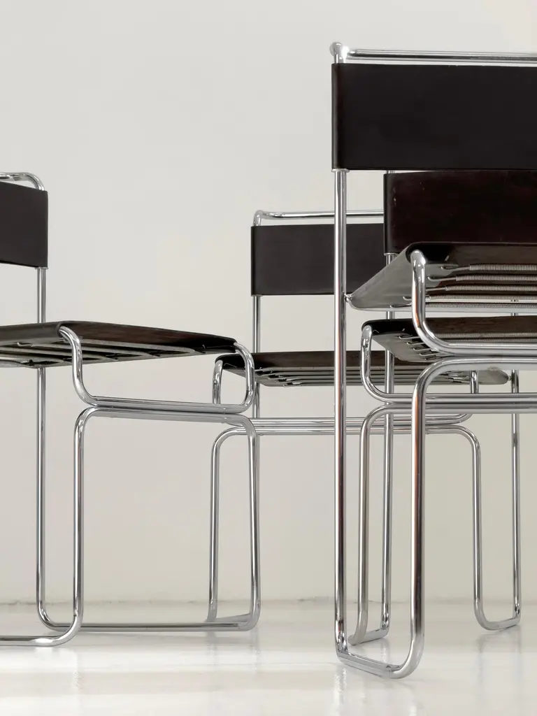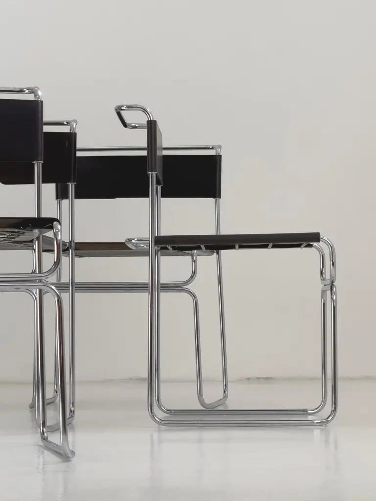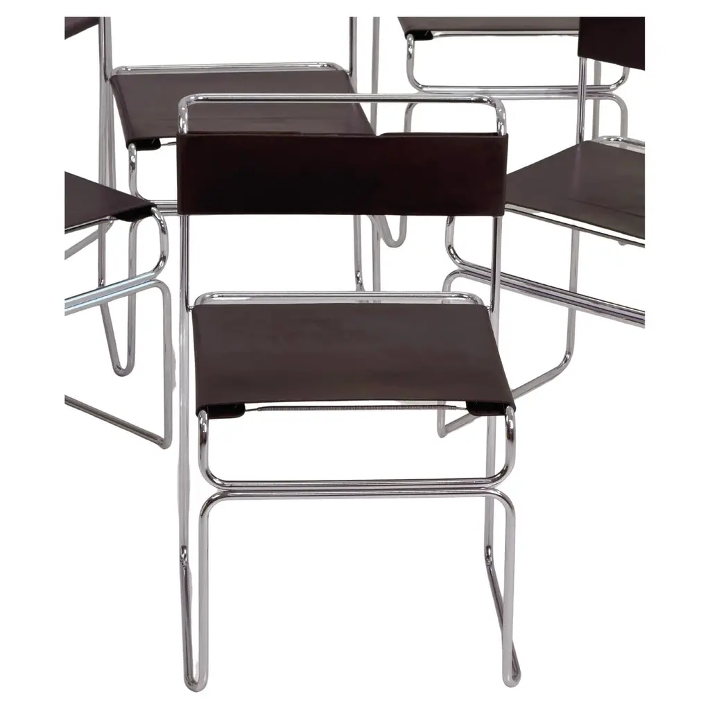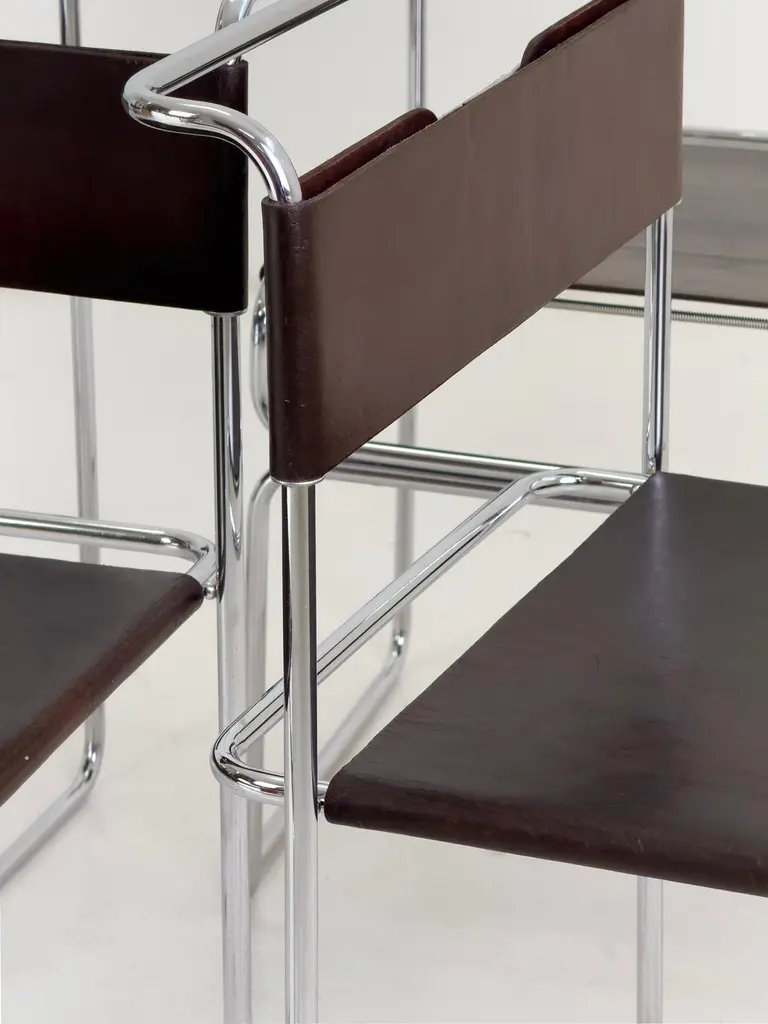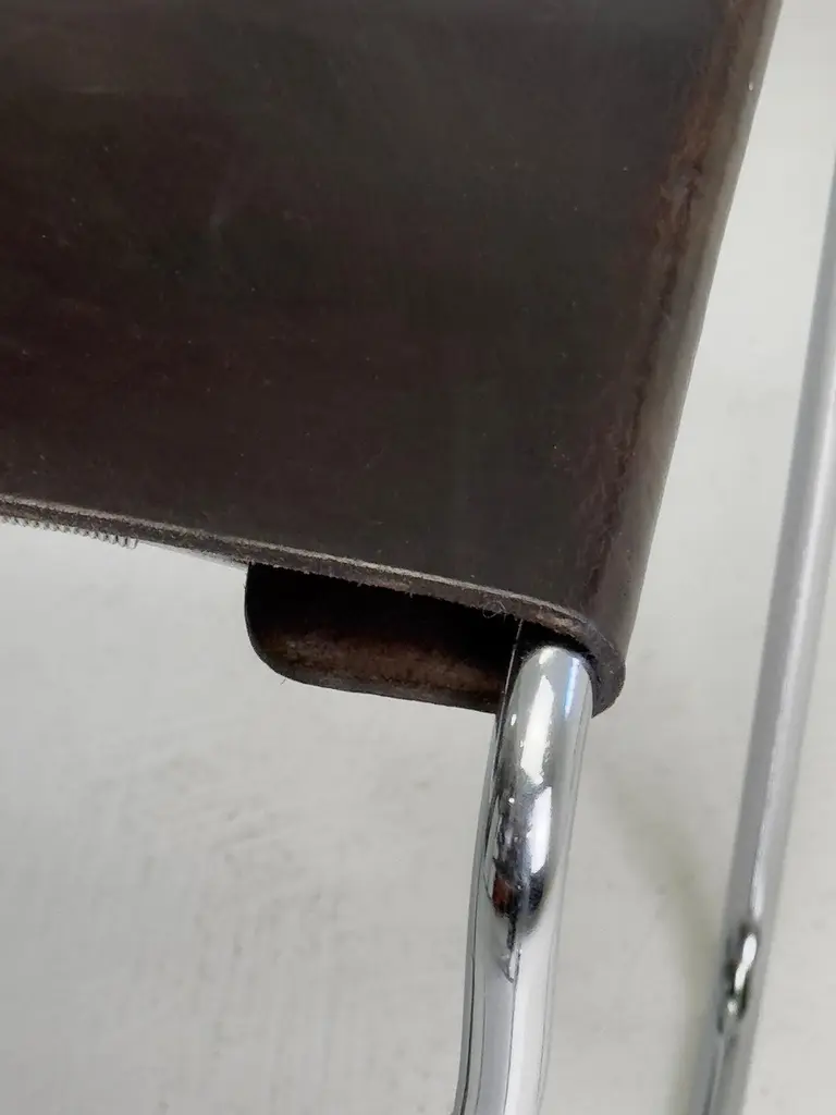 Set of 6 Libellula chairs in original dark brown leather, designed by G. Carini for Planula, Italy, 1970sThe “Libellula” chairs embody the visual lightness and refined rigor of 1970s Italian design. Objects created to endure, they carry the poetry of essential forms and the memory of time: fifty years of life imprinted in their leather, yet ready to tell new stories around the table.This is a set of 6 chairs designed by G. Carini for Planula, Italy, 1970s. The tubular chrome-plated steel frame is in excellent condition, retaining its original shine thanks to professional cleaning. The seat and backrest, in original dark brown leather, have been carefully restored, preserving the authentic traces of daily use. These natural signs of age testify to their long history without compromising their integrity — today the chairs are in good condition, solid and full of character.