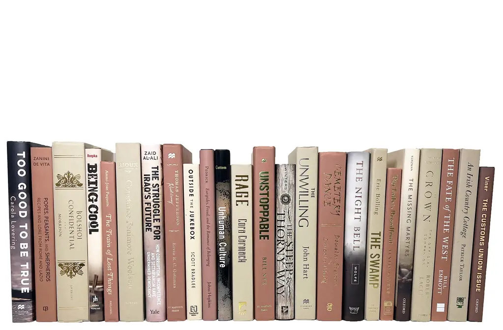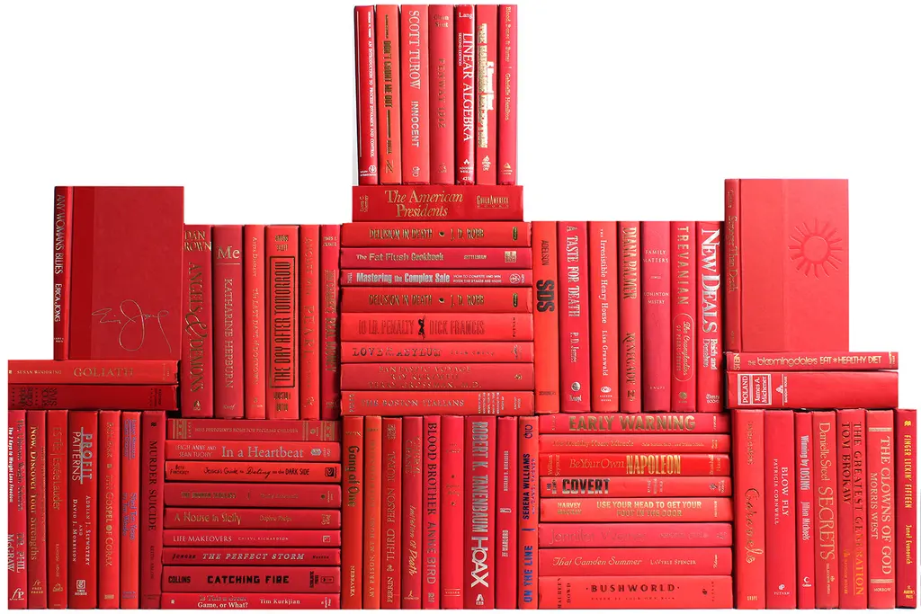The Modern Grove Book Wall features seventy-five contemporary books in warm and vibrant shades of orange to create a beautifully patterned blend of decorative books. Tangerine and persimmon hued books include a diverse variety of literary works, period novels and topical texts with moderate overall wear - suitable for reading and modern book decor. Hardcover volumes published 1970 - present. Actual titles may vary from those pictured.