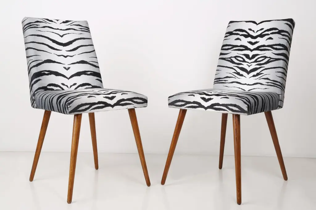 A beautiful chairs produced in the 1960s after a complete upholstery and refreshing of the woodwork, very comfortable and stabile model. The whole is covered with high-quality animal print zebra velvet (color 06). This is a part of "into the wild" collection. We can prepare sets of 2, 4, 6, 10, or 12 chairs too.