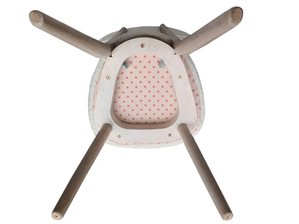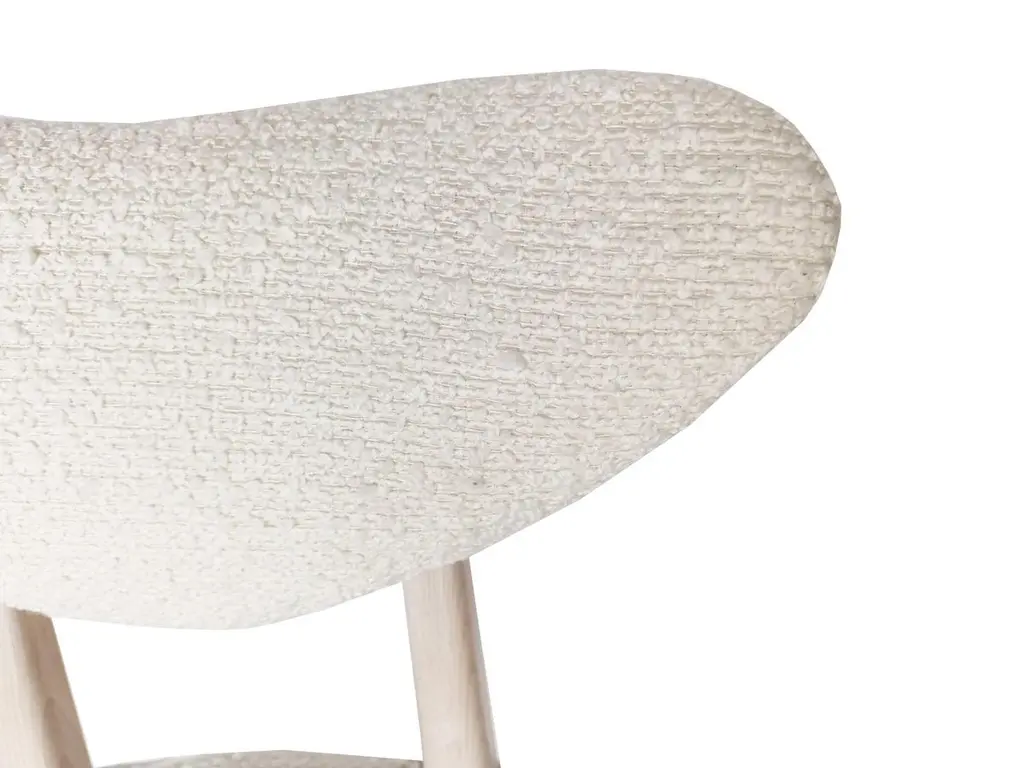 Chair type A5828. Colloquially called "heart" in amazing black fabric. The furniture was designed by Helena and Jerzy Kurmanowicz. They were produced in Radomsko Woodworking Factory and we thoroughly renovated them. The construction is made of beech wood dyed with water stain brown. The chairs are protected with acrylic varnish with a satin glow. Color of wood in this option is biel.About the fabric:Alba is a trendy bouclé furniture fabric with characteristic, large, irregular loops. The combination of expressive texture and subdued, natural colours (warm shades of white, beige, grey, graphite) allows for creating surprising texture contrasts in monochrome interiors inspired by earth tones. Alba looks particularly impressive on furniture with slightly curved or simple forms, without quilting or stitching – it is sufficiently interesting in itself and does not require additional upholstery treatments. Pleasant to the touch and soft, it helps to create an atmosphere of cosiness and warmth in the interior. Alba is also very practical in everyday use – minor snags (e.g., made by your cat's claws) disappear in its rich texture.Martindale: 50 000 cyclesComposition: Acrylic 5% Polyester 95%We can prepare also smaller or bigger sets of 2, 4, 6, 10 or more chairs in different wood and fabric color. Please check the last pictures with color samples.Here set of 8 chairs is available.