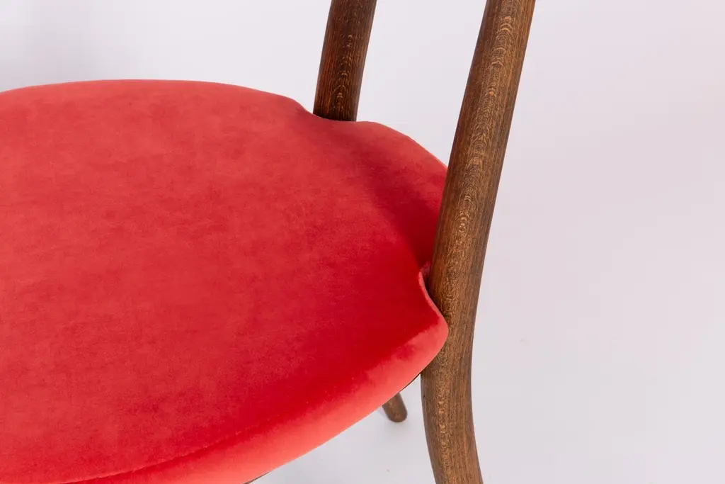 A set of 8 chairs type A5828. Colloquially called "heart". The furniture was designed by Helena and Jerzy Kurmanowicz. They were produced in Radomsko Woodworking Factory and we thoroughly renovated them. The construction is made of beechwood dyed with water stain brown. The chairs are protected with acrylic varnish with a satin glow. The upholstery fabric was produced in the Clean boo technology and has water-repellent properties. This means that the fabric limits the absorption of liquids. Spilled liquid on the surface will form balls. The chairs have undergone a complete carpentry and upholstery renovation. Seats covered with high-quality red velvet (color 2232). ABRASION RESISTANCE Category A (60,000 cycles). We can prepare also bigger sets 2, 4, 6 or more chairs in different wood and velvet color.