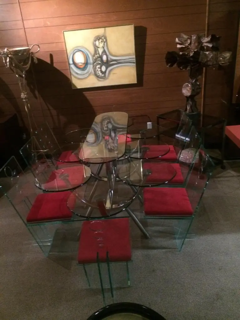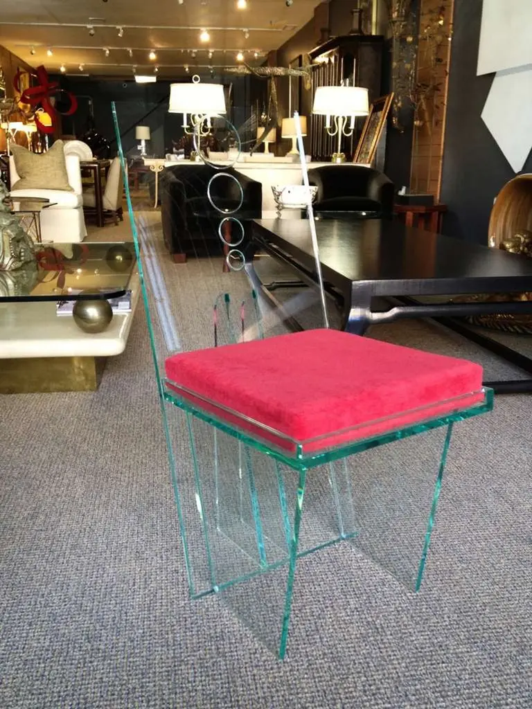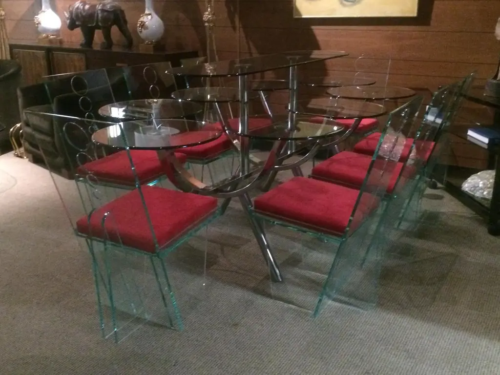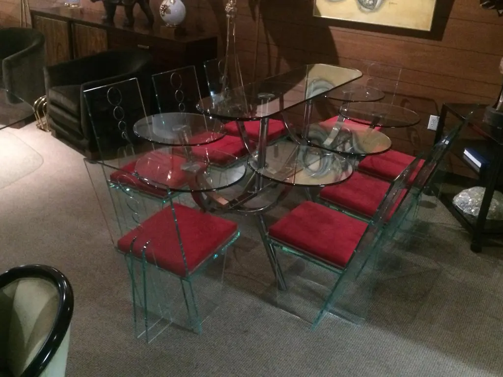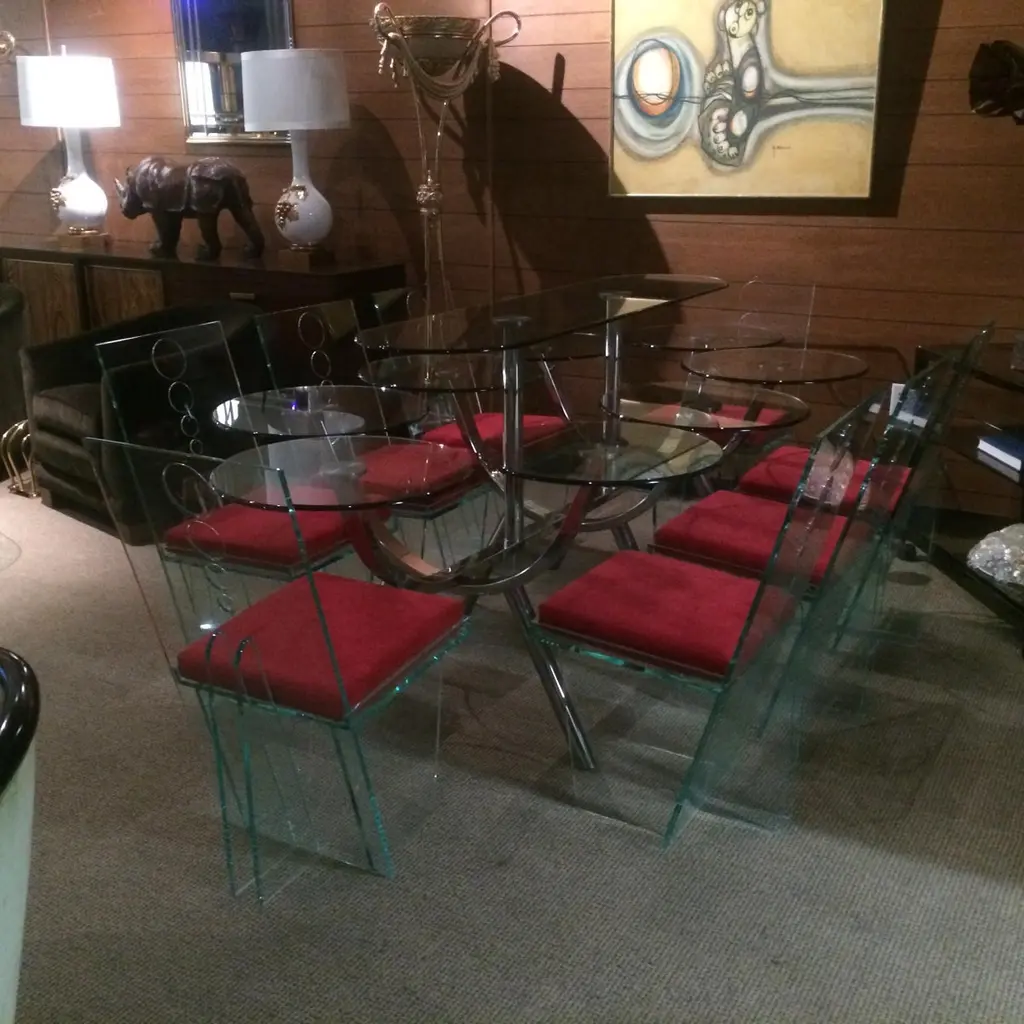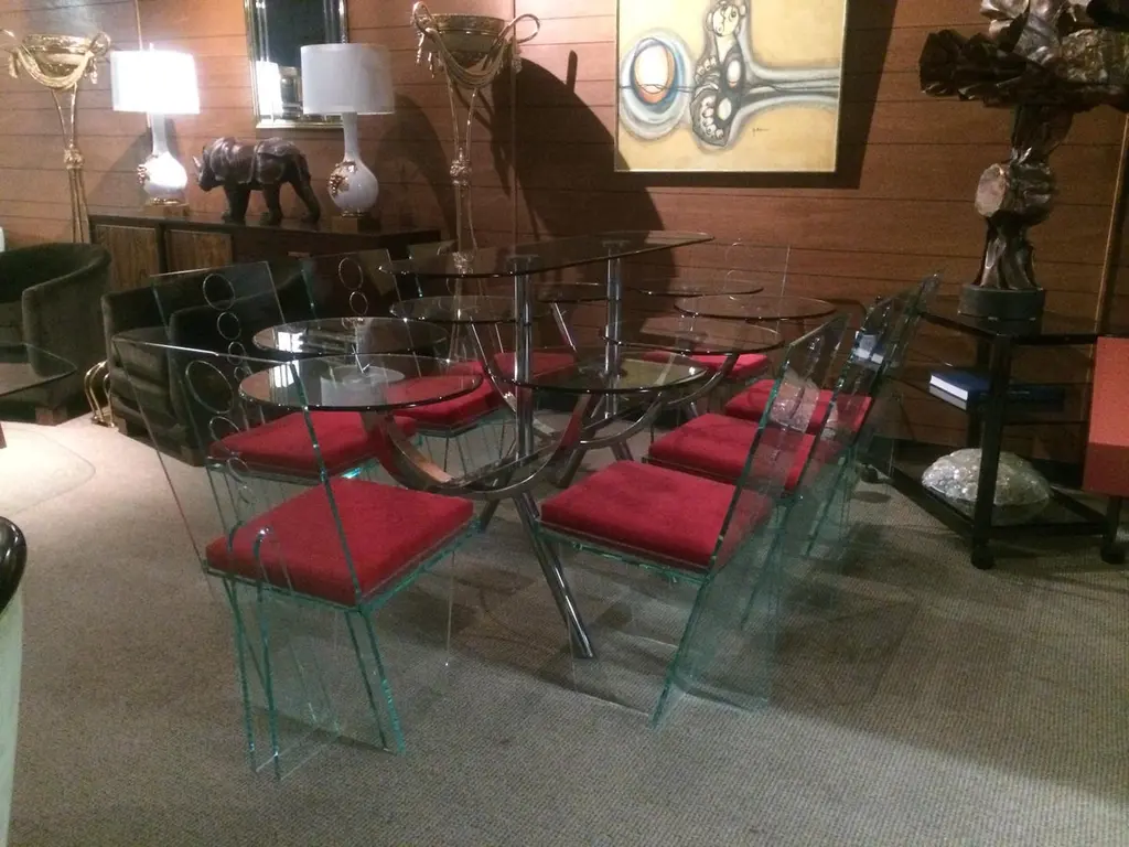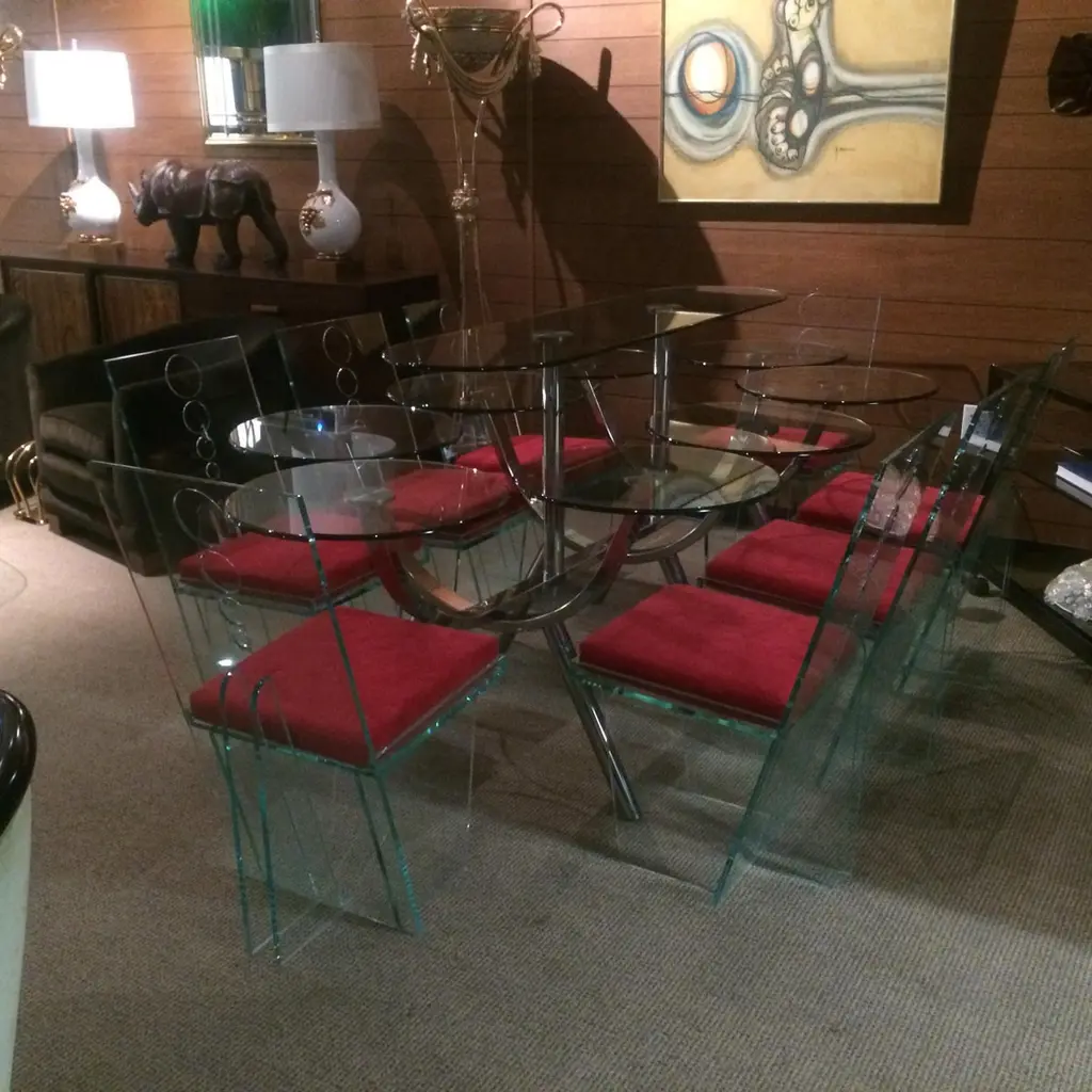 The price is per chair not for the whole set.Set of eight "Wisteria" Lucite chairs designed by Charles Hollis Jones designed in 1968.The chairs are in excellent condition and the seats can be upholstered in COM.The current seats are in white fabric not red.Measurements: 16.0" wide 22.0" deep 35.0" high.If you are coming to our showroom to see a piece please call ahead of time because due to our large inventory some items are available by appointment only.All of our sales are final, no returns, no refunds, no exchanges, no exceptions.