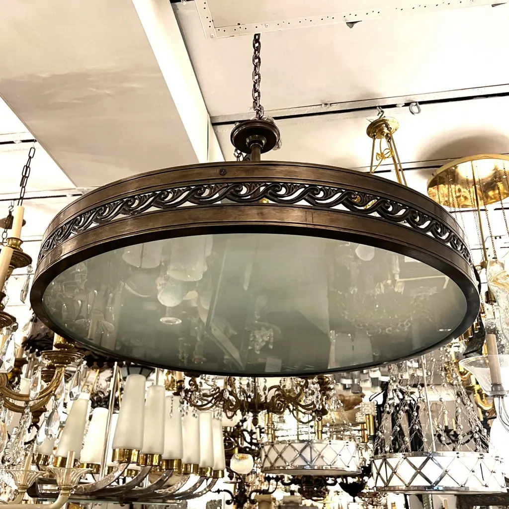 A set of three circa French patinated bronze semi-flush lights fixtures with frosted glass inset. Sold Individually.Measurements:Diameter 39"Minimum drop: 9" (adjustable)