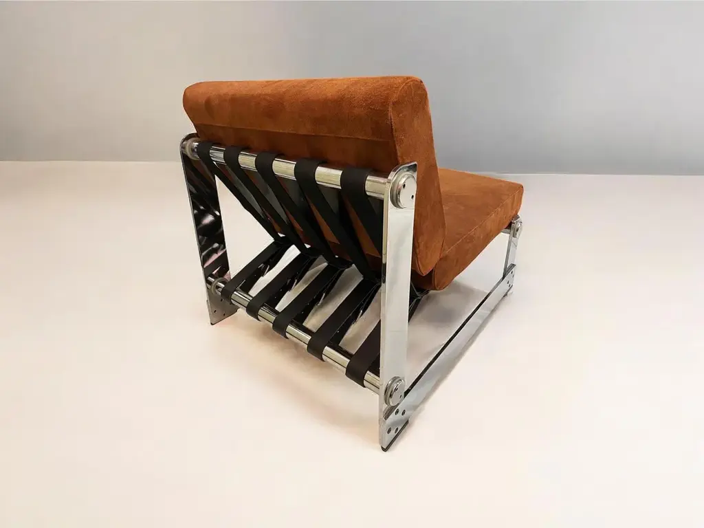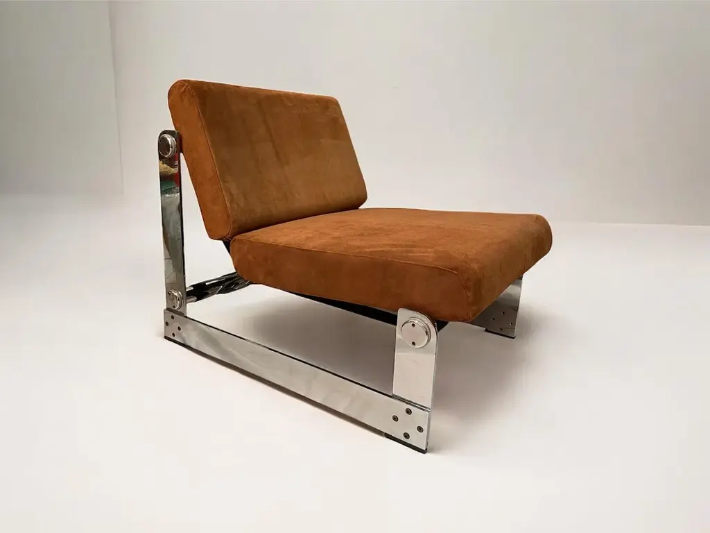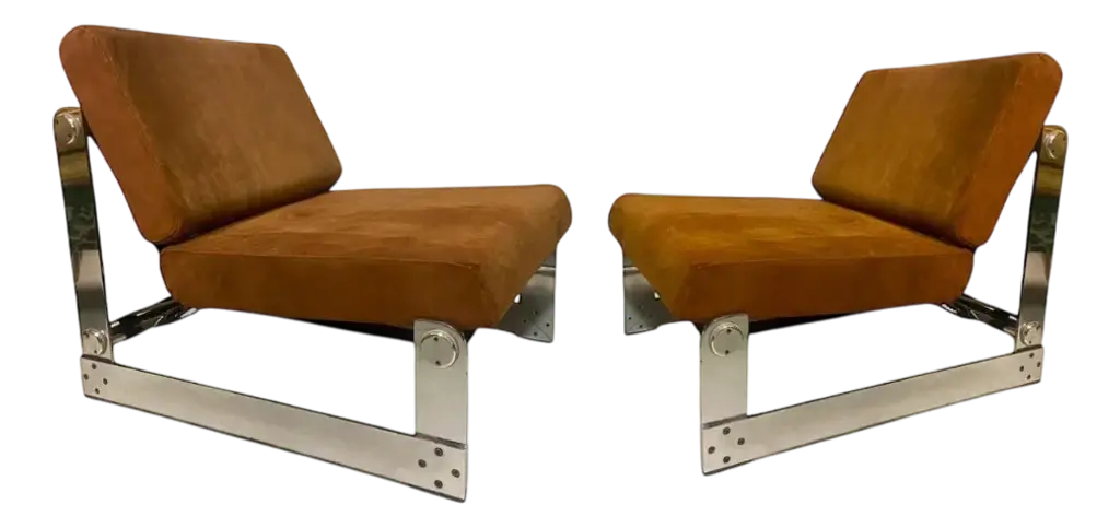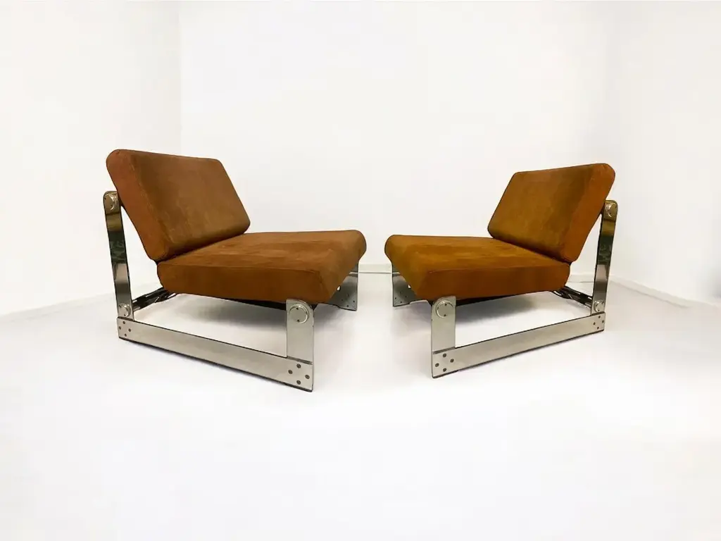 Showcasing the meticulous work of French designer Gilles Bouchez, this set of two lounge chairs from 1972 is an iconic representation of mid-century modern design. Crafted by Airborne, a respected French furniture company, these chairs embody the spirit of innovation typical of the 70s. The chairs’ cushions are upholstered in beige suede leather, lending them a plush, luxurious look. The filled cushions ensure a pleasure and comfort seating experience. While the robust chromed metal structure reinforces the durability of the chairs while adding an industrial touch. The blend of rustic leather and sleek metal creates an intriguing contrast, showing Bouchez's ability for mixing materials and aesthetics. This pair of chairs mirror the appeal of vintage design while remaining suitable for contemporary spaces. Whether gracing a company lounge or a home living room, these 1972 Airborne chairs by Gilles Bouchez are a versatile addition to any interior design theme. The set, which means 2 lounge chairs, weigh 12Kg. The item is preserved in perfect condition. This piece is attributed to the mentioned designer/maker. It has no attribution mark and no official proof of authenticity, however it is well documented in design history. I take full responsibility for any authenticity issues arising from misattribution