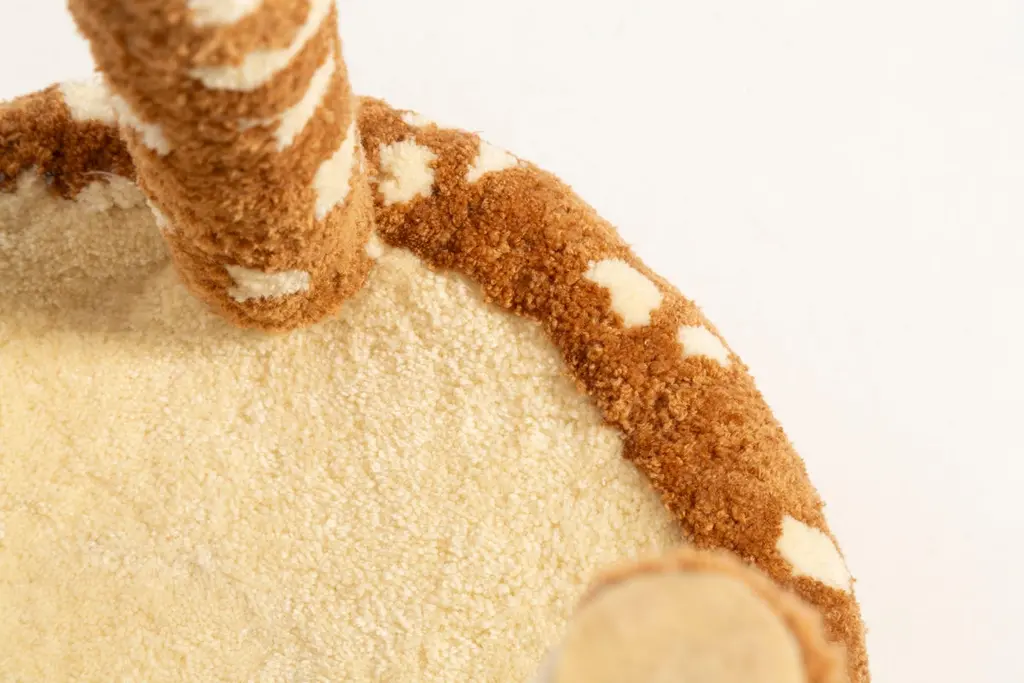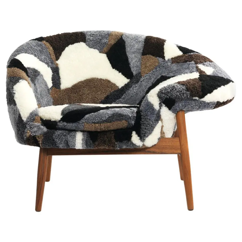 Beautiful chair type 1020 colloquially called "shell" produced by the Slupsk centre of furniture industry in the 1960s in Poland. Here in set with stool.About the fabric:Seat and back is hand tufting brown, white and camel wool. Absolutely hand made technic. Every chair is unique and can be a bit different. They are extremely comfortable. We can prepare this chair and stool in another tufting colors. Waiting time is 3-4 weeks. Please ask for more information. The curves that agitate the ground and the color combinations pay homage to the more playful and hypnotic side of this majestic creature.Composition: 100% woolChair and stool are stable and very shapely.