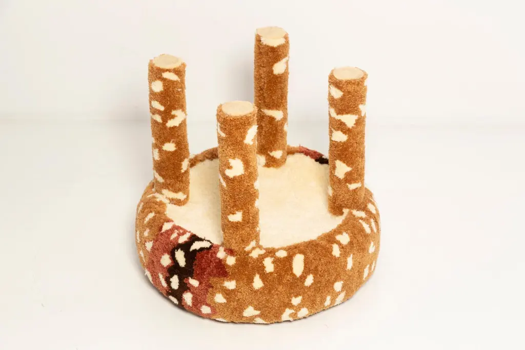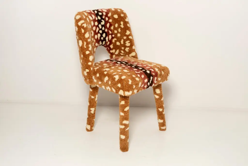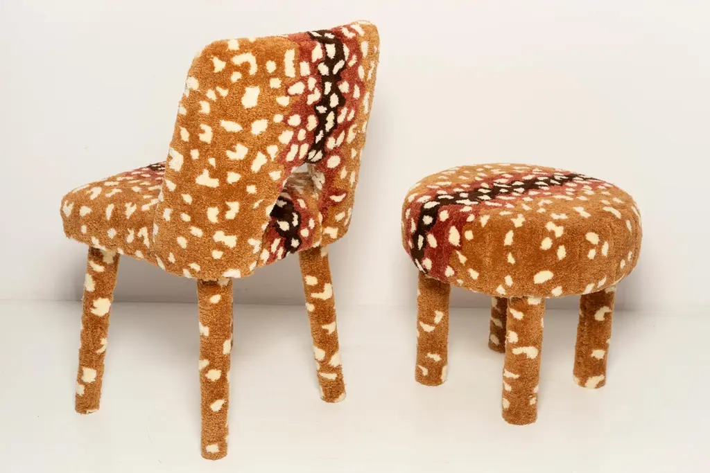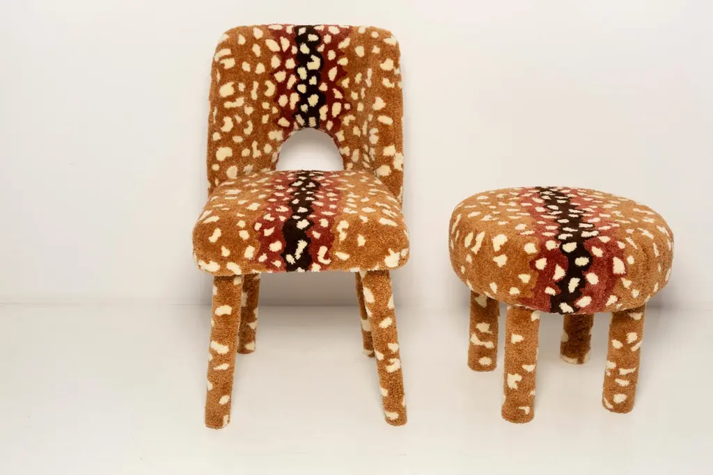 Set Of Mid Century Hand Tufting Roe Deer Bambi Wool Chair And Stool, Europe