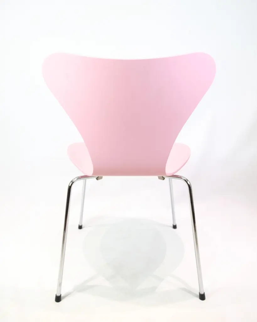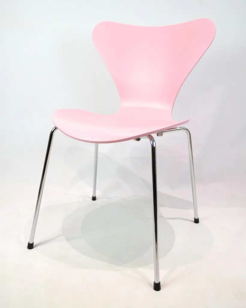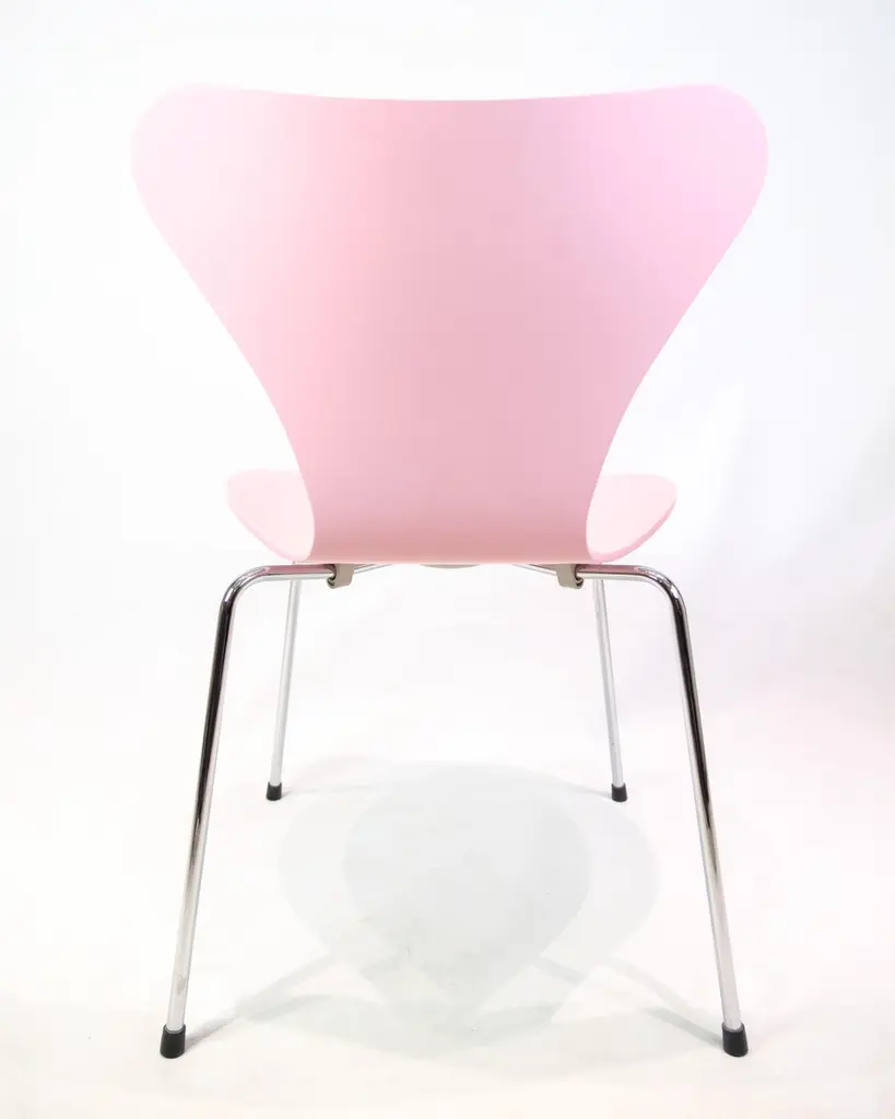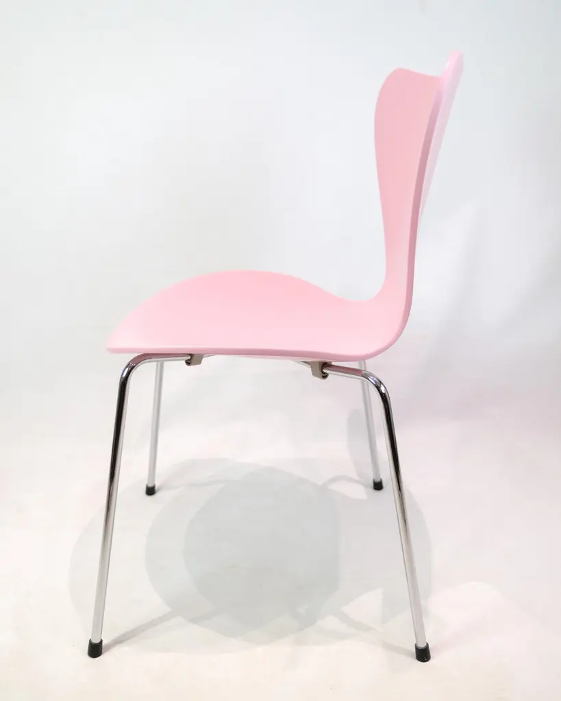 Set of 6 Seven chairs model 3107 in a pink lacquer. Designed by Arne Jacobsen and manufactured by Fritz Hansen.Arne Jacobsen (1902–1971) was one of Denmark's most important architects and designers. Model 3107 was designed in 1955 and is produced by Fritz Hansen – a leading furniture manufacturer known for uncompromising quality and modern design. The Seven chair is a further development of Jacobsen's laminated shell chair and is today an icon in both private and professional spaces.Designer: Arne JacobsenModel: 3107 / SevenManufacturer: Fritz HansenYear: 1990sColor: PinkMaterial: Molded veneer, chrome-plated framesWe have more in stock, please ask for quantity.Dimensions: H:78cm W:50cm D:41cm SH:43cm