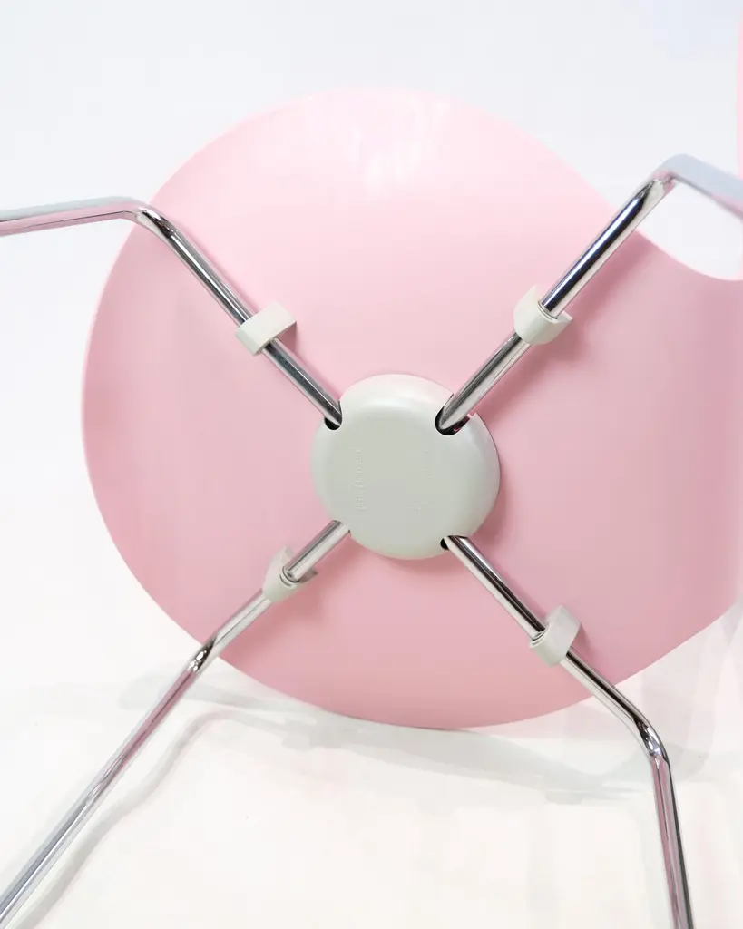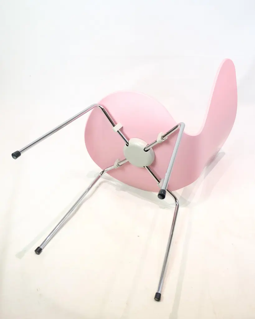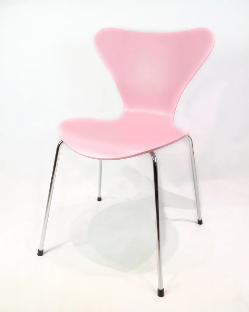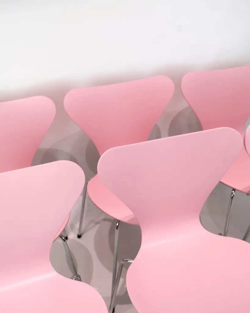 Set of 6 Seven chairs model 3107 in a pink lacquer. Designed by Arne Jacobsen and manufactured by Fritz Hansen.Arne Jacobsen (1902–1971) was one of Denmark's most important architects and designers. Model 3107 was designed in 1955 and is produced by Fritz Hansen – a leading furniture manufacturer known for uncompromising quality and modern design. The Seven chair is a further development of Jacobsen's laminated shell chair and is today an icon in both private and professional spaces.Designer: Arne JacobsenModel: 3107 / SevenManufacturer: Fritz HansenYear: 1990sColor: PinkMaterial: Molded veneer, chrome-plated framesWe have more in stock, please ask for quantity.Dimensions: H:78cm W:50cm D:41cm SH:43cm