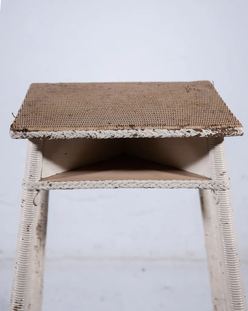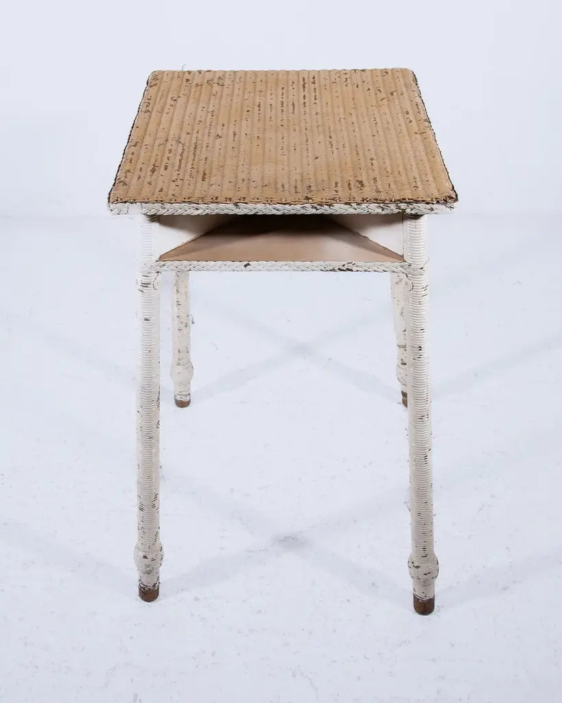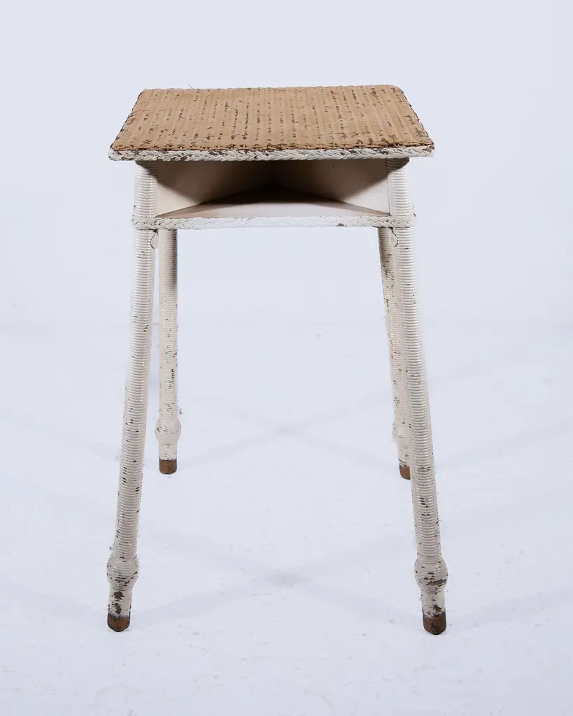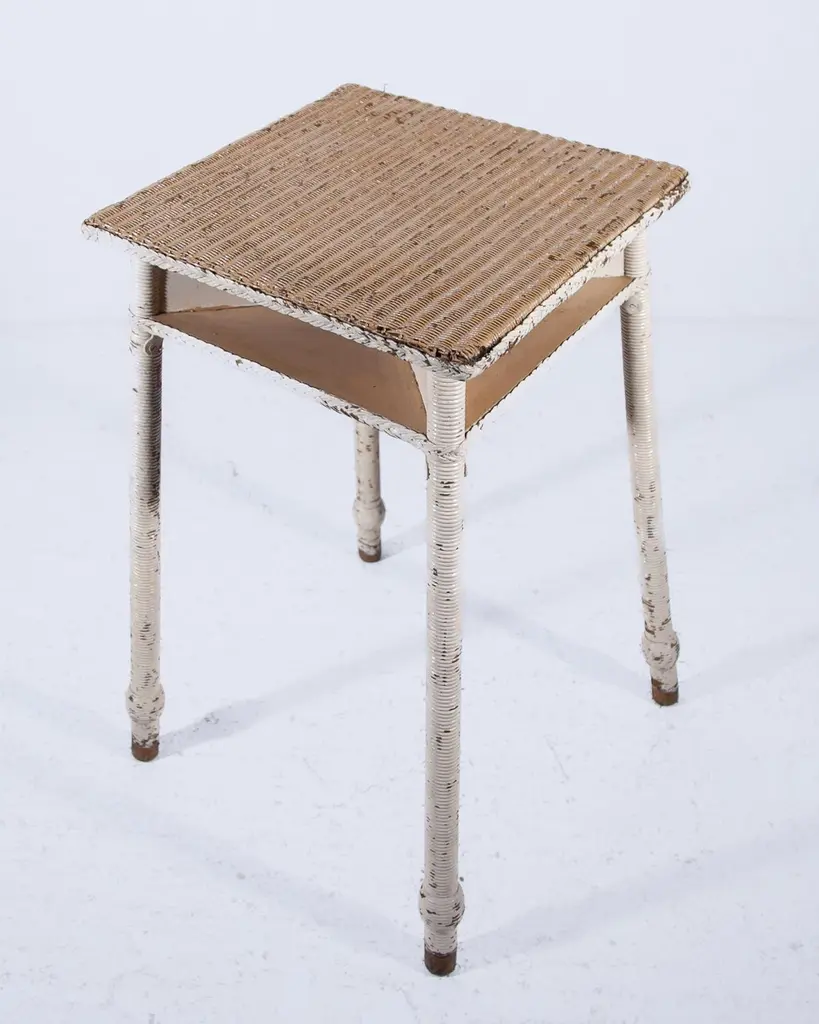 A lovely looking Set of Two Antique Lloyd Loom Sofa Tables Art Deco, Woven Wicker Lloyd Loom Wicker Entry Tables. Dimensions: Table four legs and top display-Width 48cm/height 73cm-Table display middle Width.50cm/height 62cm.A model from Lusty Lloyd Loom in its design with those well shaped curved legs and little shapely feet. Not only great looking but also useful and placeable and smaller shelfs.Condition is good - it enjoyed a historic repaint in an aged off white, but looks fine.