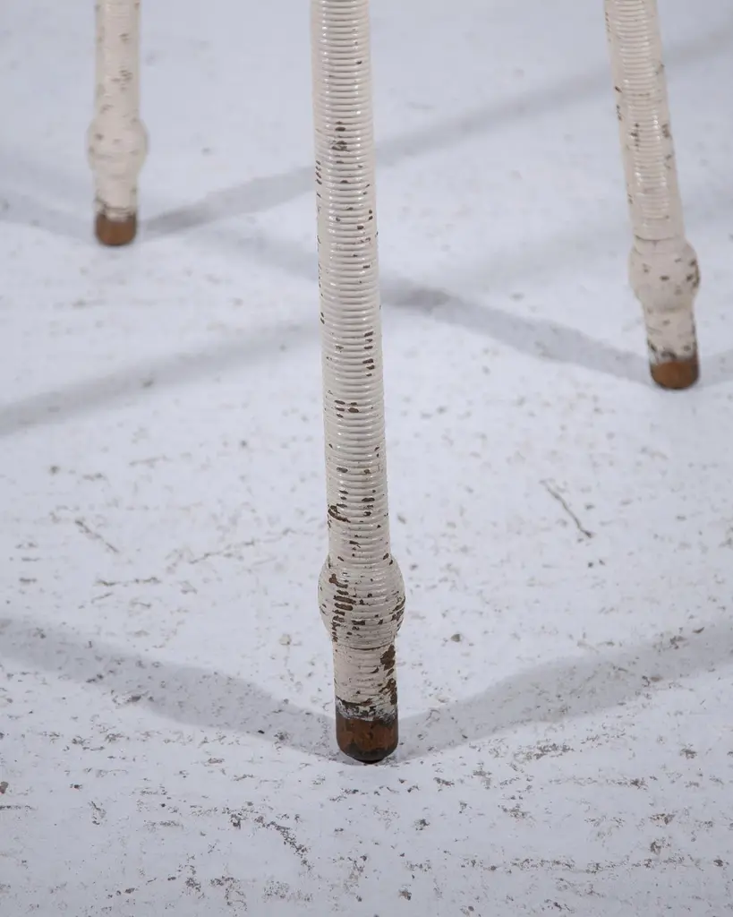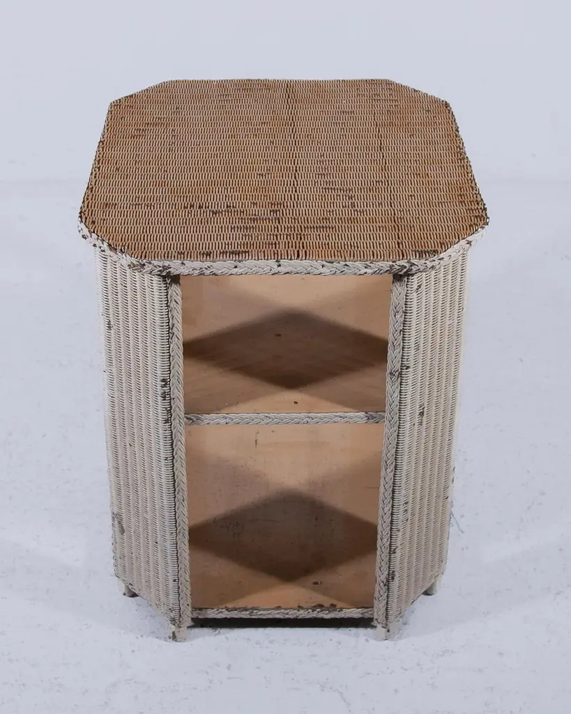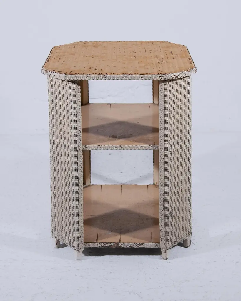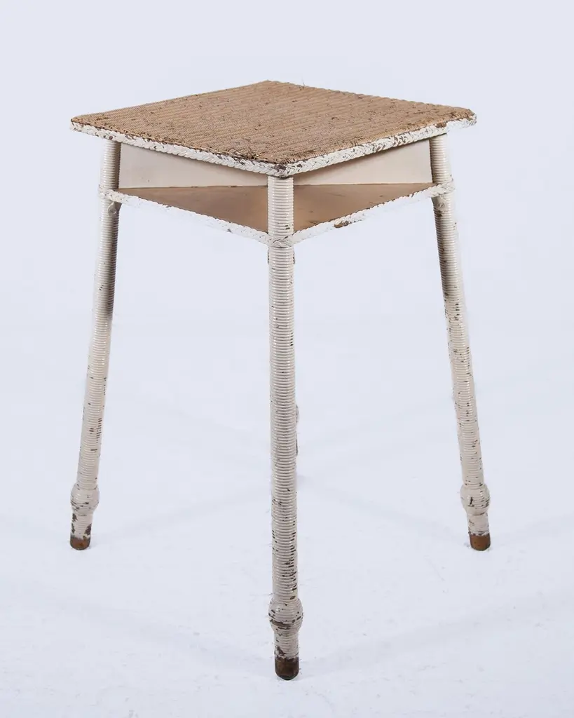 A lovely looking Set of Two Antique Lloyd Loom Sofa Tables Art Deco, Woven Wicker Lloyd Loom Wicker Entry Tables. Dimensions: Table four legs and top display-Width 48cm/height 73cm-Table display middle Width.50cm/height 62cm.A model from Lusty Lloyd Loom in its design with those well shaped curved legs and little shapely feet. Not only great looking but also useful and placeable and smaller shelfs.Condition is good - it enjoyed a historic repaint in an aged off white, but looks fine.