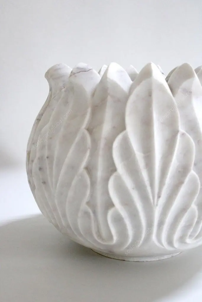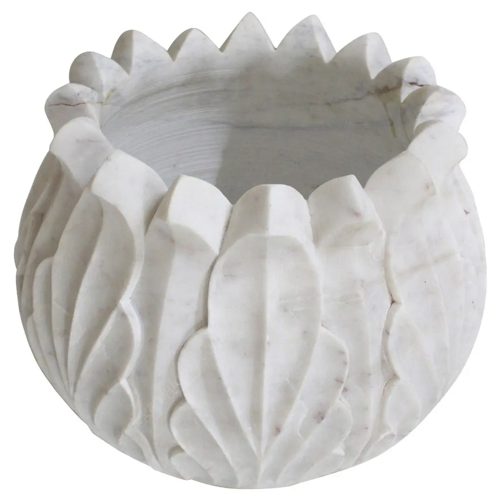 Hand carved out of a single block of marble, perfect for outdoors.Lotus pots in white marbleSize- 17" x 17" x 14"HMaterials - white marble, hand-carved, semi matt finishedBuyer Cancellation-The cancellation charge is 25% which increases to 50% if the production is started.Prices do not include shipping from India (for custom orders) or our MN warehouse (items from stock). That will be additional.