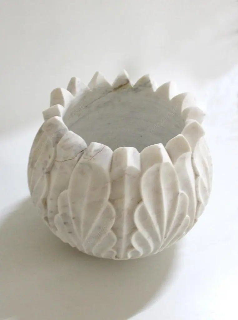 Set Of Two Lotus Pots In White Marble Handcrafted In India By Stephanie Odegard