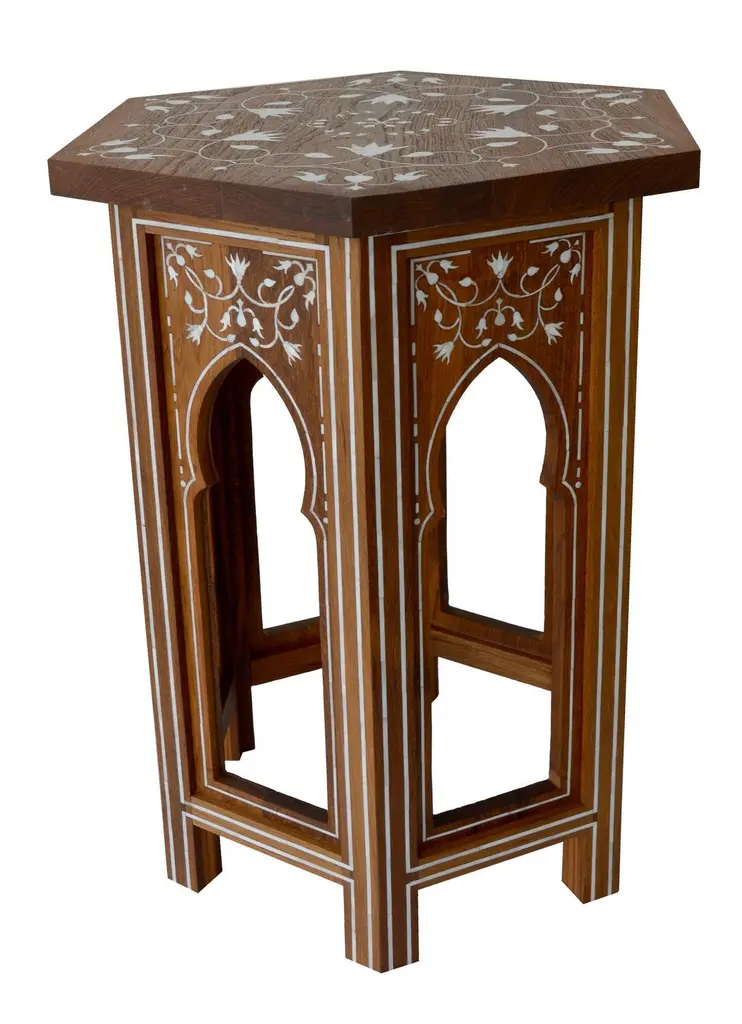 Inspired by the Mehraab element of Indian architecture, this simple design from Stephane Odegard's Udaipur Atelier, uses the intricate mother of pearl work on the top and the mehrabs on a hexagonal teak wood table.Set of Two Mehraab Table in MOPSize- 16"x16"x18"HMaterials - Hexagonal Teak wood, Mother of Pearl Work, Hand Carved, Polished, Semi Matt finished.Buyer Cancellation-The cancellation charge is 25% which increases to 50% if the production is started.Prices do not include shipping from India (for custom orders) or our MN warehouse (items from stock). That will be additional.