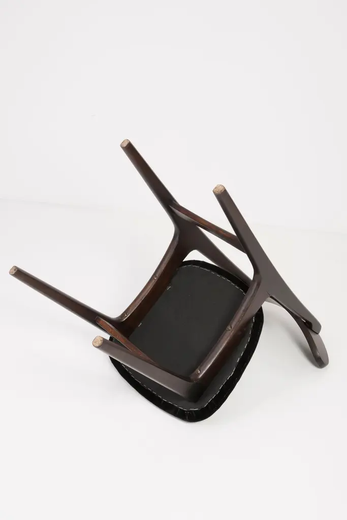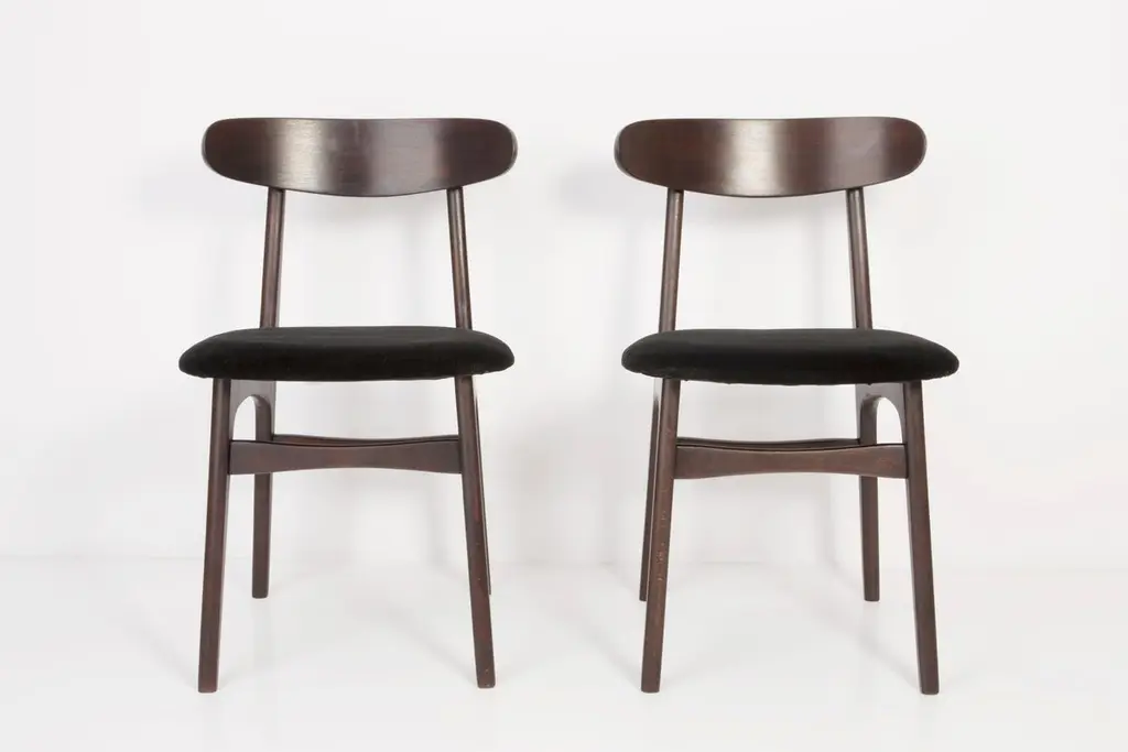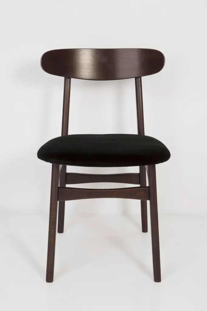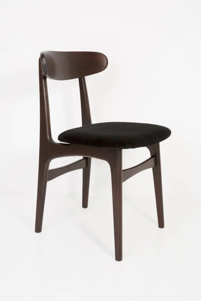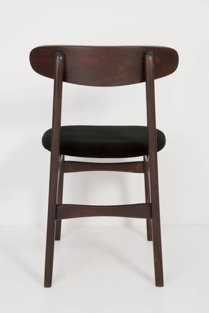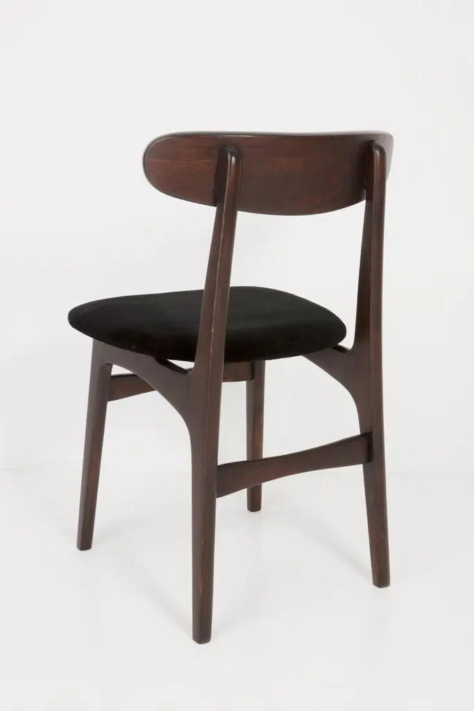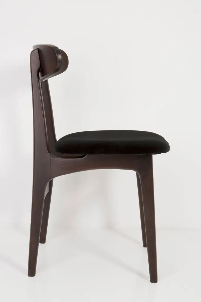Chairs designed by Prof. Rajmund Halas. Made of beechwood. The set is after a complete upholstery renovation, the woodwork has been refreshed. Seat is dressed in black, durable and pleasant to the touch velvet fabric. Chair is stabile and very shapely. They was produced in former furniture factory in Goleniów in the 1960s. We can prepare this set in every color of wood and fabric also in bigger sets. Please check the last picture with velvet color samples.