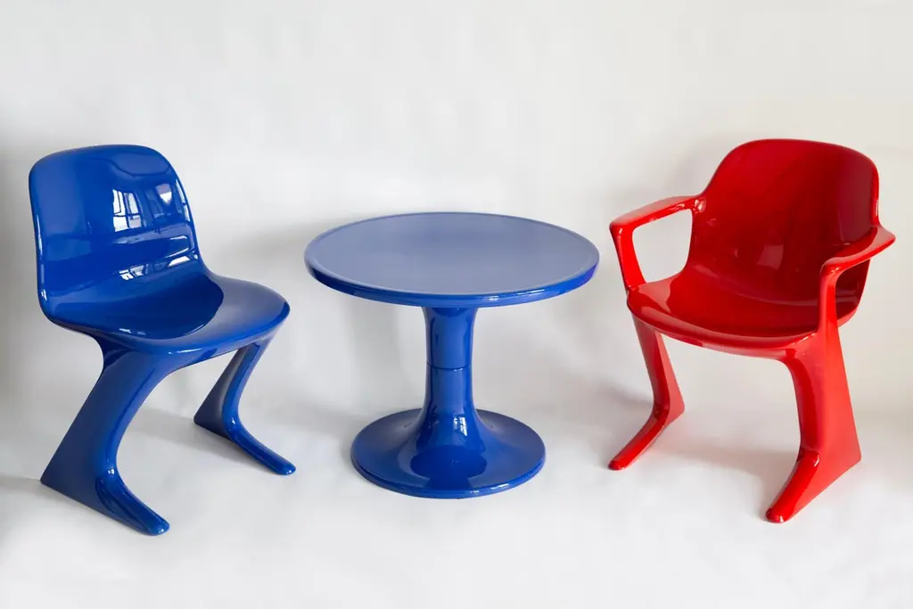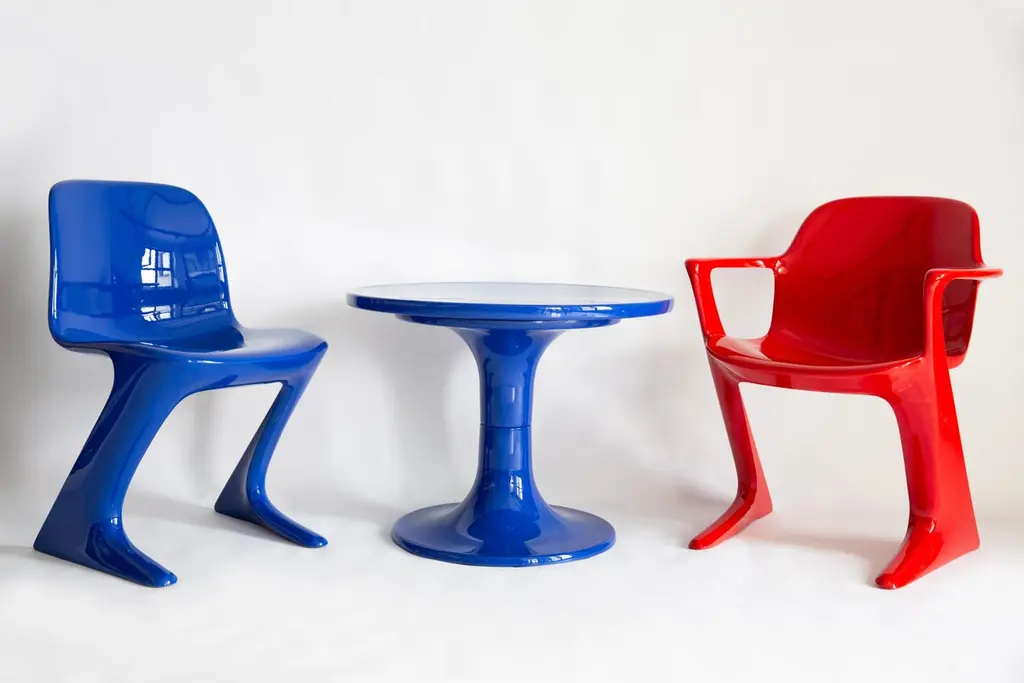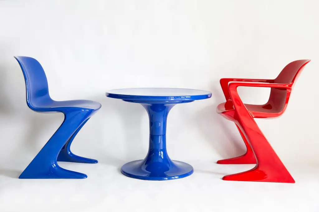 The z.stuhl chair, designed by Ernst Moeckl (1931-2013) in the 1970s, is a cantilever chair made of polyurethane, which is available with and without armrests. In the vernacular, the chair is known by its geometry-related names such as "squatting man", "kangaroo" and "Z-chair". German Version of the Panton chair. Also called kangaroo chair or variopur chair. Produced in eastern Germany.Chairs are after full renovation, new glossy blue and red lacquer. For this chairs we used RAL 5002 ultramarine blue color and Red one. This model is extremely comfortable! Beautiful organic shape make them timeless and fits to every interior. We can prepare also set of 6 or 8 or more, also in another RAL/Pantone color. Here set of 2 chairs is available. No table included.