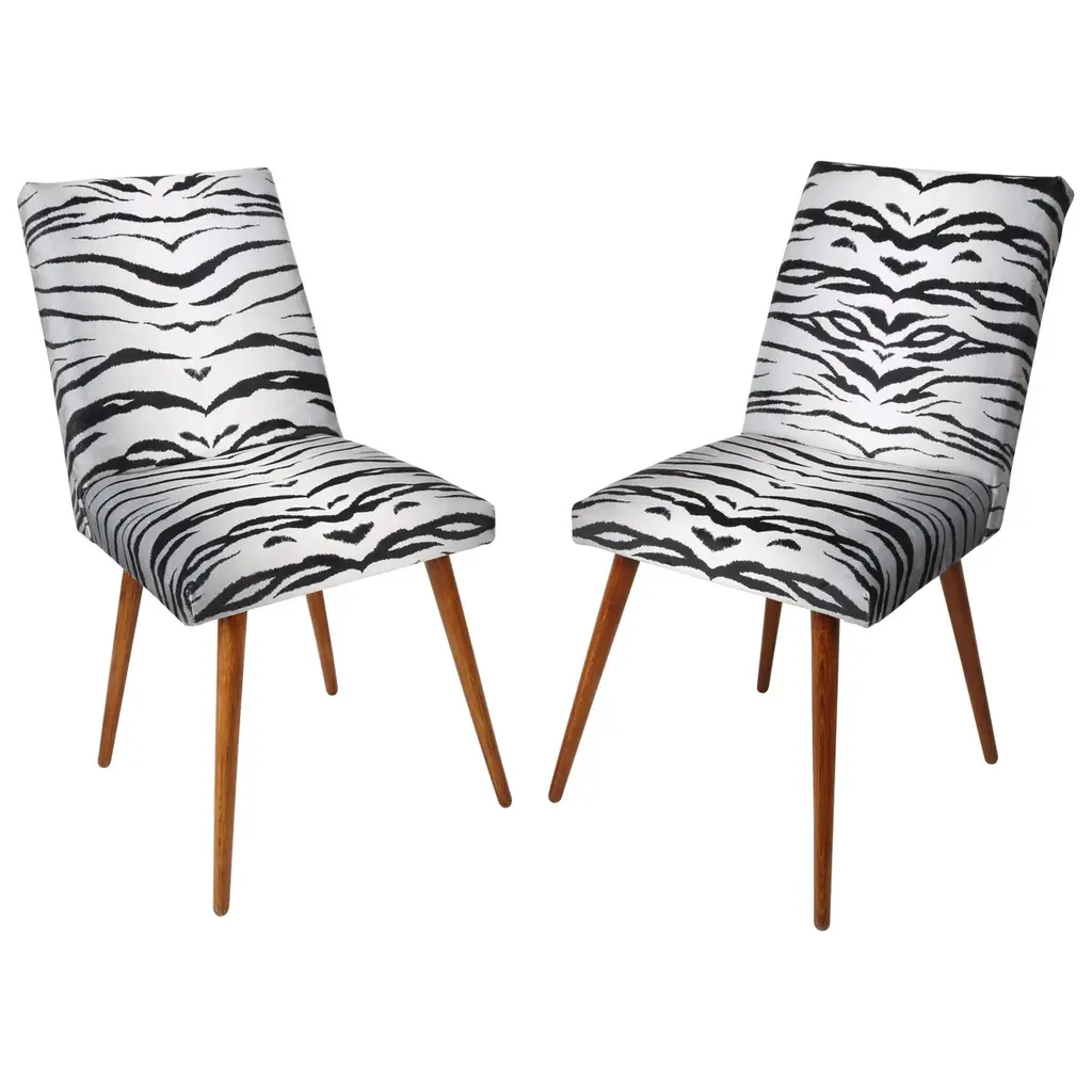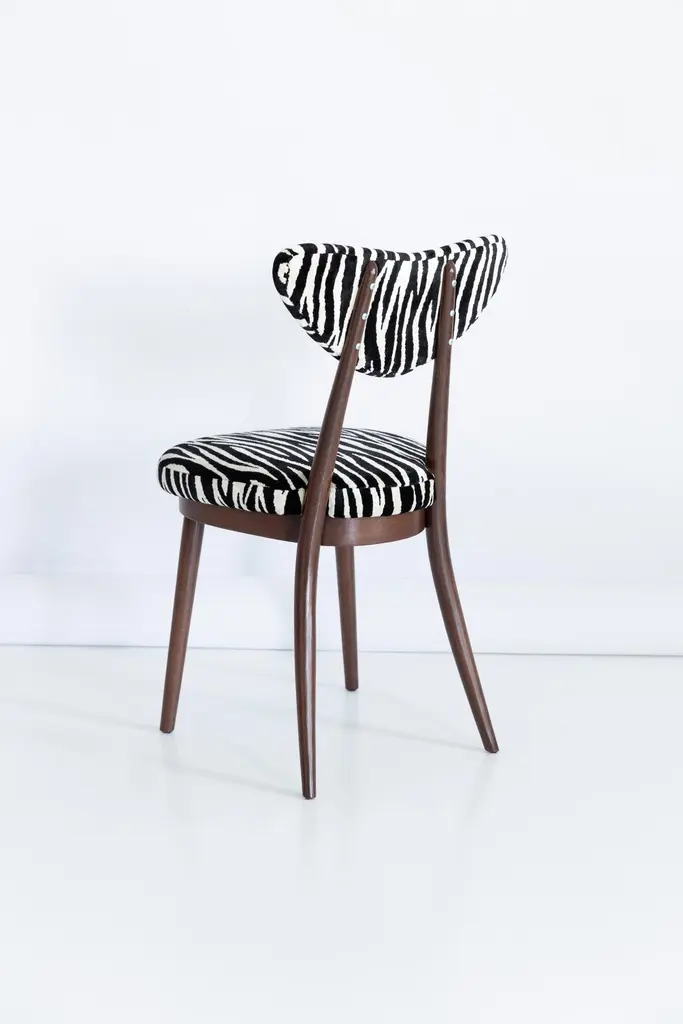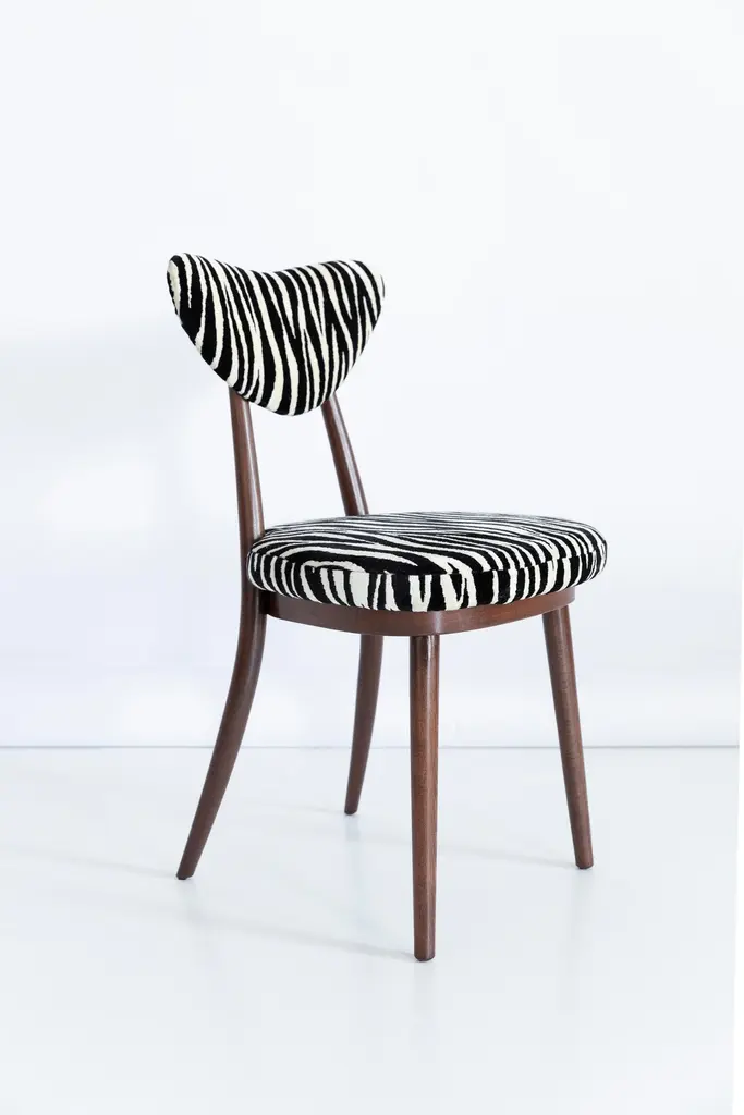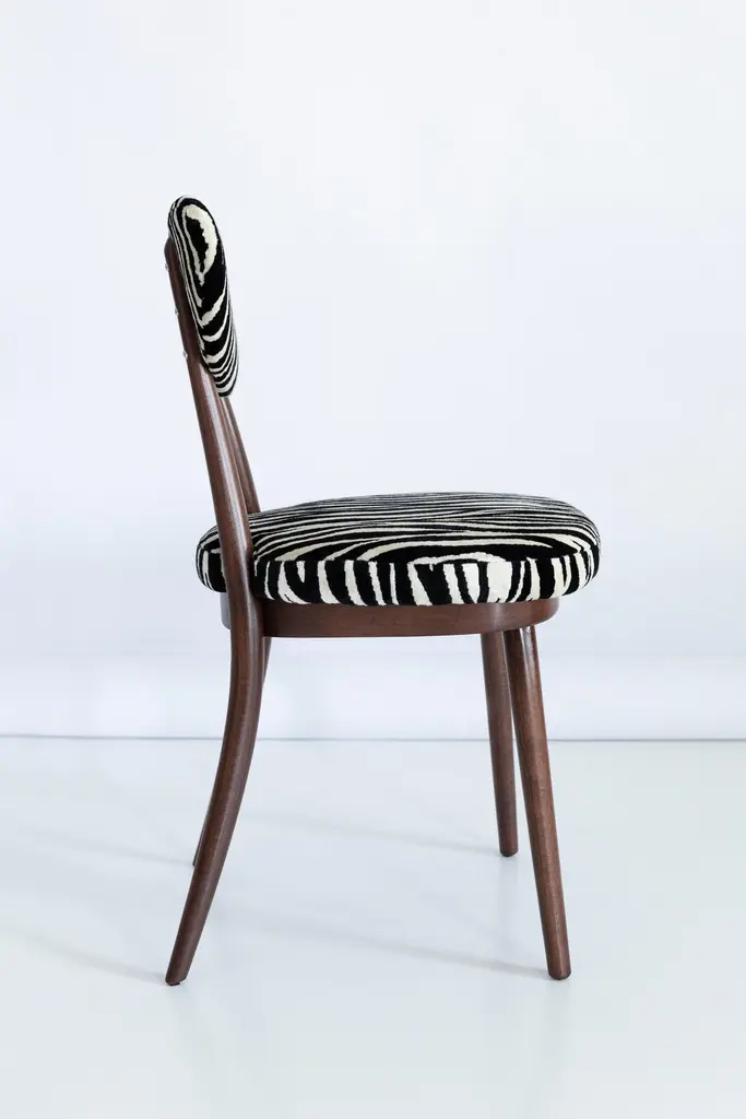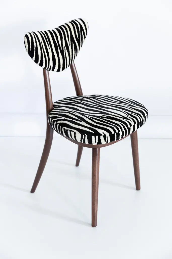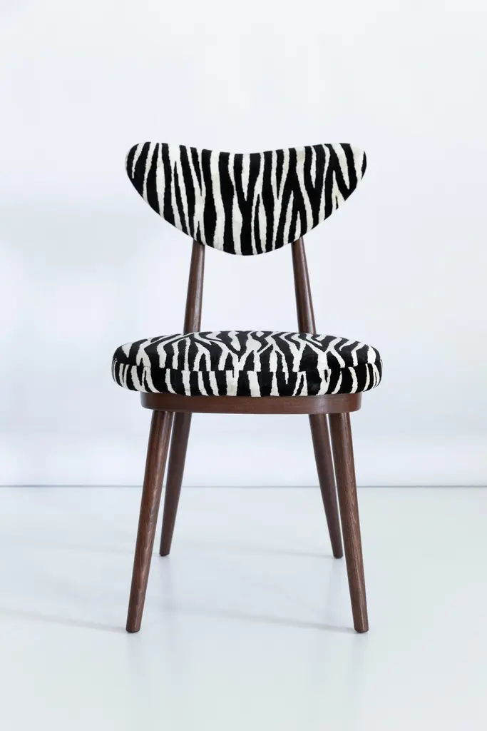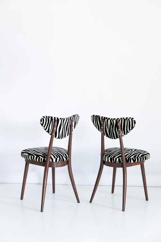 A set of 2 chairs type A5828. Colloquially called "heart" in amazing Zebra fabric. The furniture was designed by Helena and Jerzy Kurmanowicz. They were produced in Radomsko Woodworking Factory and we thoroughly renovated them. The construction is made of beech wood dyed with water stain brown. The chairs are protected with acrylic varnish with a satin glow. Fabric, a collection of soft, viscose plush fabrics. They are an excellent choice for upholstery furniture for expressive and characterful interiors in the Art Deco, colonial, vintage or boho chic style. Abrasion Resistance Category A (30,000 cycles). Ingredients: polyester 7%, viscose 93%.We can prepare also smaller or bigger sets of 4, 6, 8 or more chairs in different wood and fabric color.