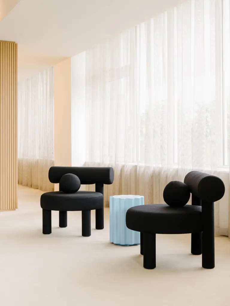 New NOOM furniture collection is dedicated to the 100th anniversary of the founding of the Bauhaus School in Germany. Ideas of functionalism and conciseness, the combination of Craft and art, buildings and objects formed by a composition of simple geometric shapes, are still relevant. NOOM furniture is a tribute to the great thinkers who formed the modernist principles and brought them to life. The designer has “gathered” the shape of this chair from balls and cylinders. A round pillow and an ottoman appeal to interact: to pump, to play, to bubble.All products in the collection are called by names of famous modernist artists and architects.Designer: Kateryna SokolovaMaterials: Textile, foam rubber, wood, plywoodFabrics: Available in a wide range of fabrics by request.Dimensions of one low chair: H 71 cm x W 75 cm x D 75 cm