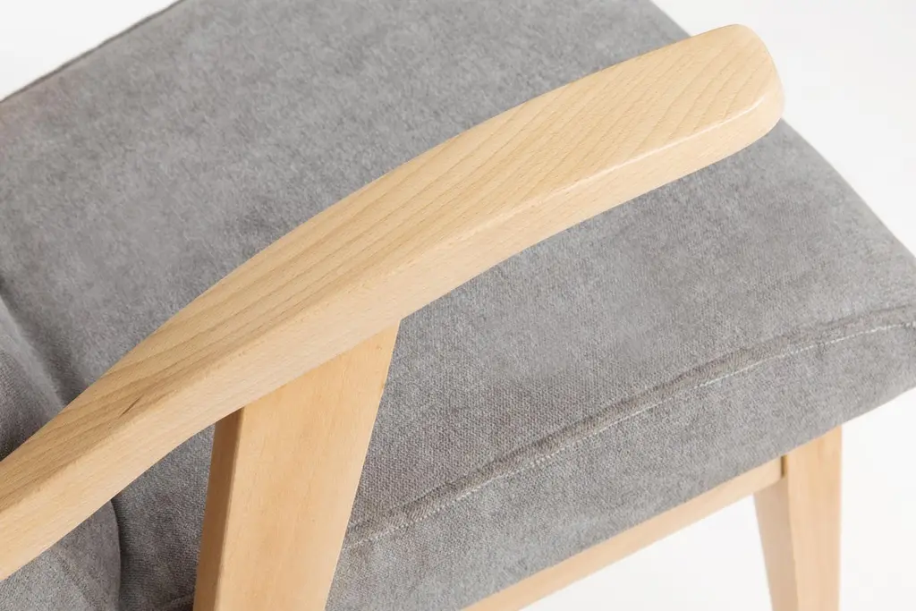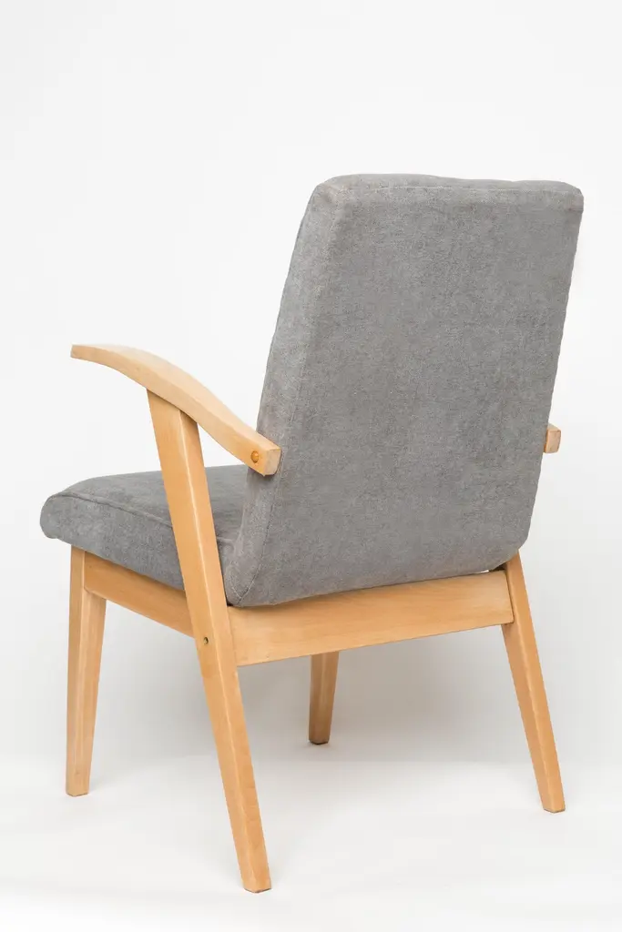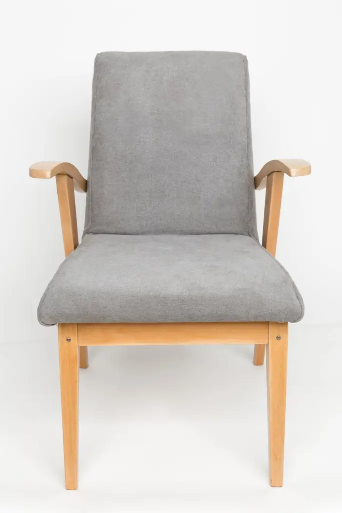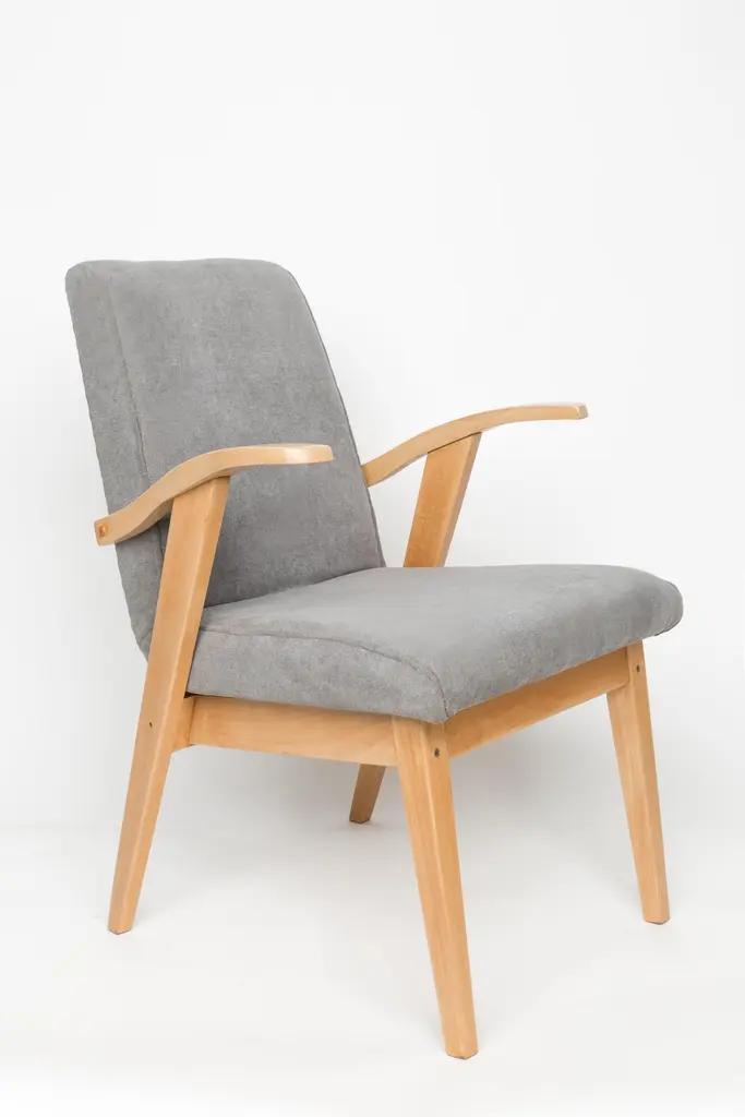 Armchair designed by Mieczyslaw Puchala in a Classic edition. Light wood combined with a gray fabric gives it elegance and nobility. The chair has undergone a full carpentry and upholstery renovation. The wood is in excellent condition - finished with matte varnish. Produced in the 1960s in Poland. We can prepare this set in every wood and fabric color.