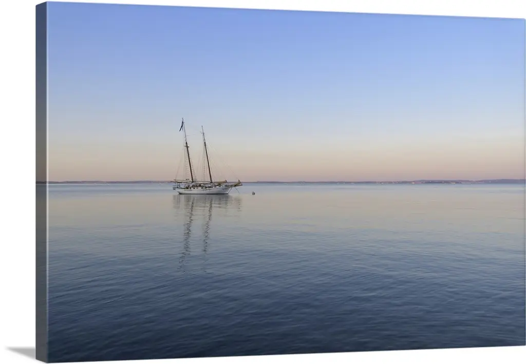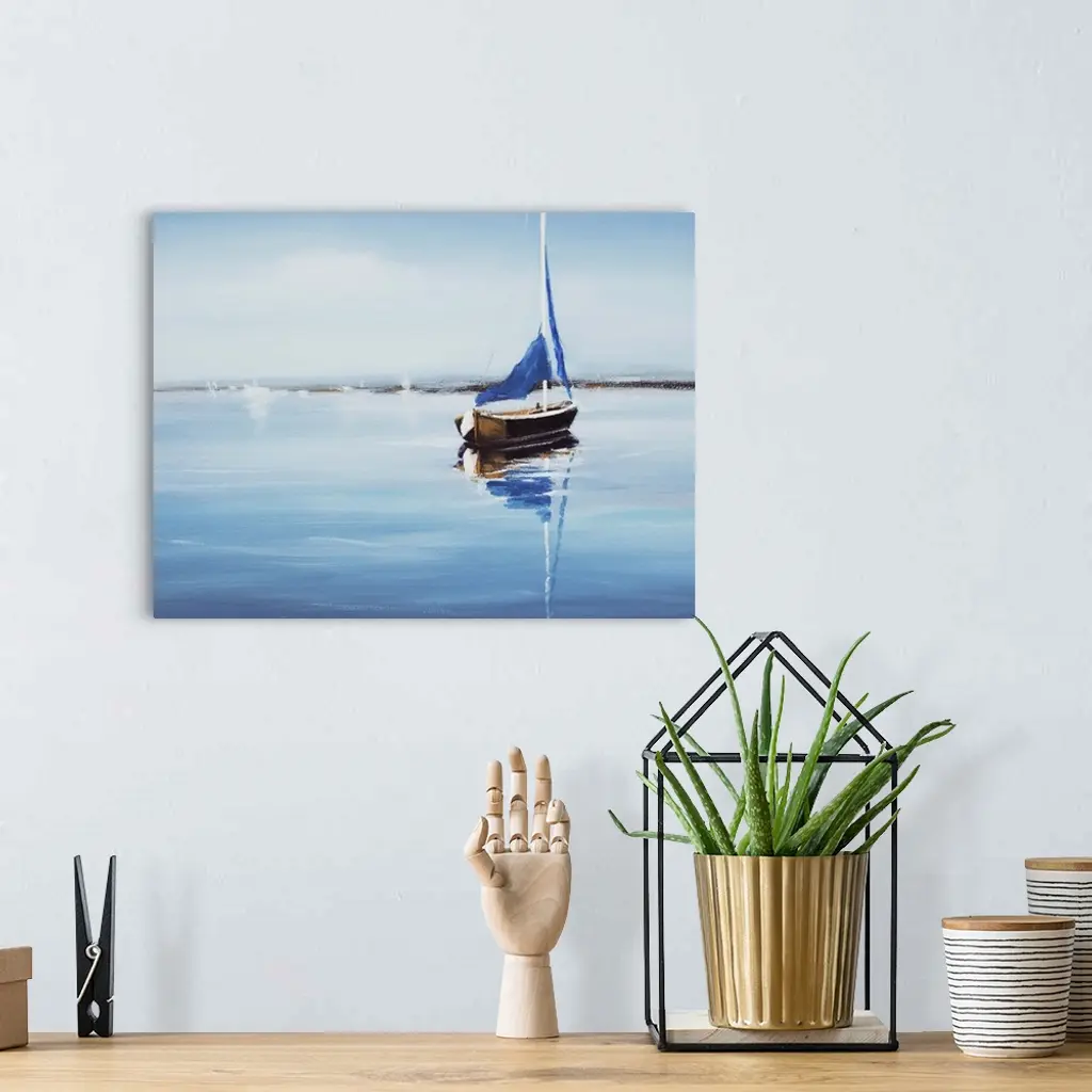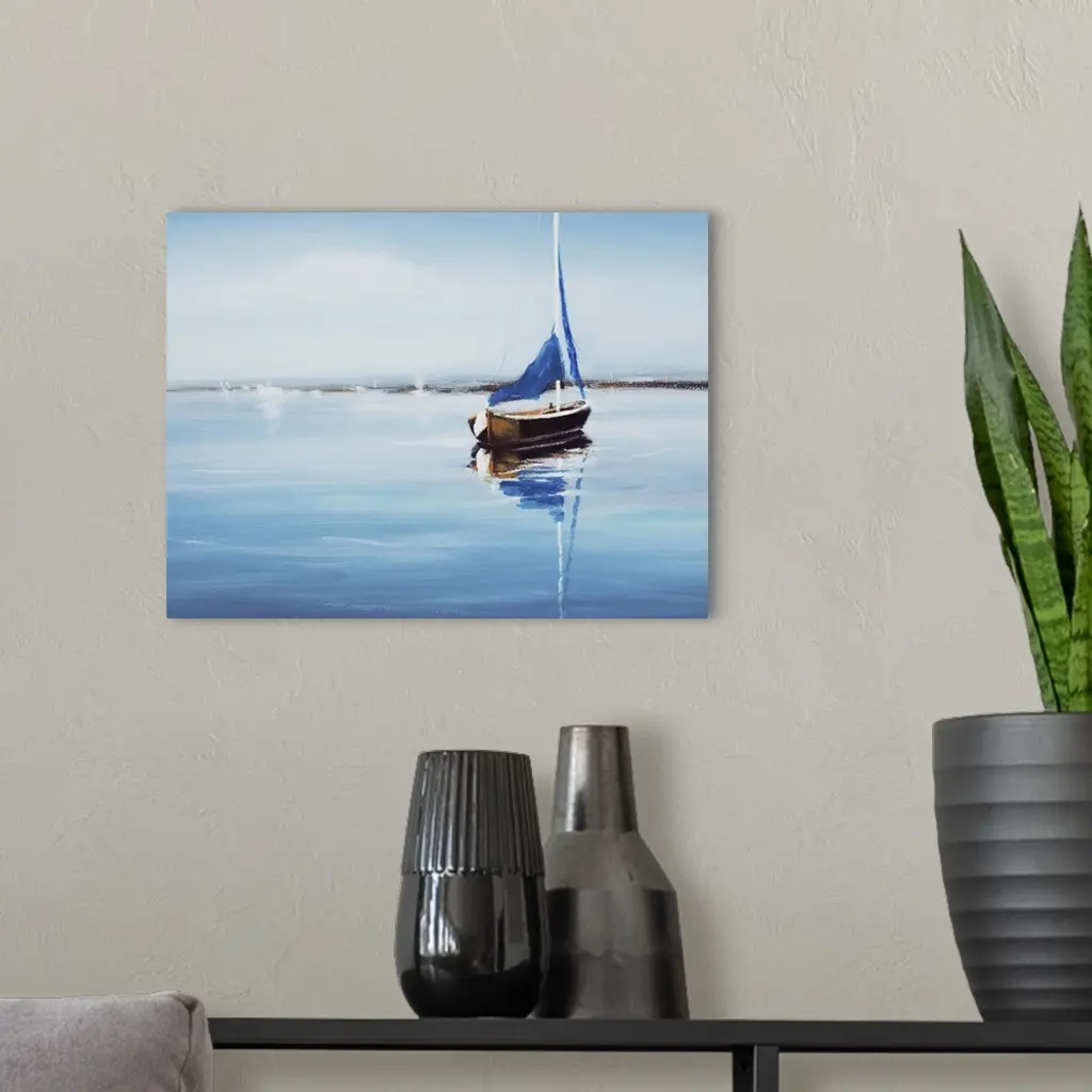 Contemporary art print of a sail boat on crystal blue water.
