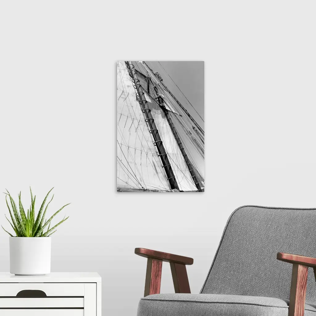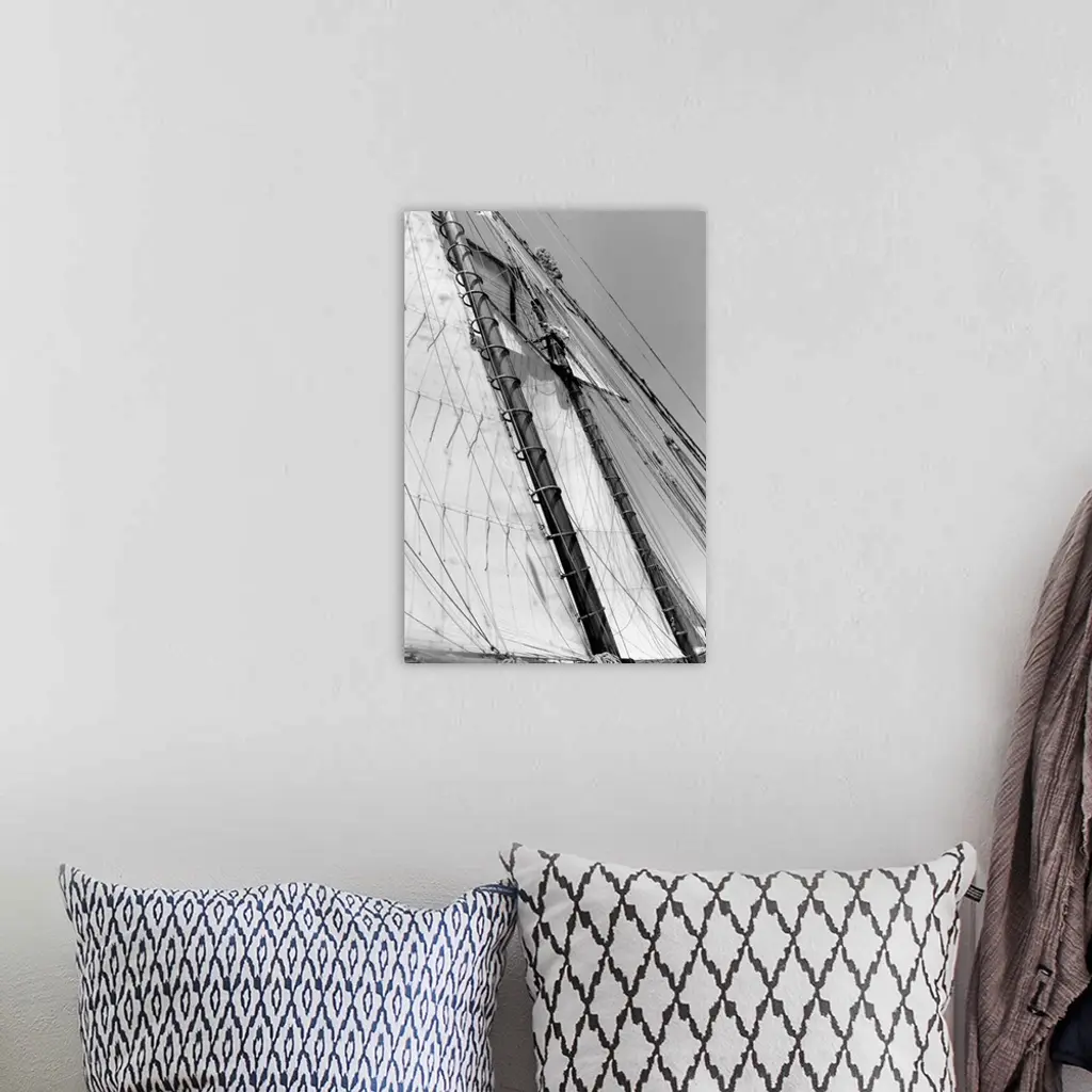 Black and white photograph of details of a sailboat.