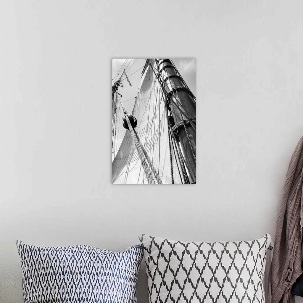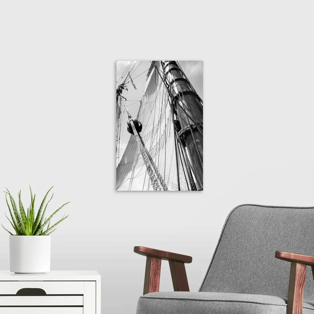 Black and white photograph of details of a sailboat.