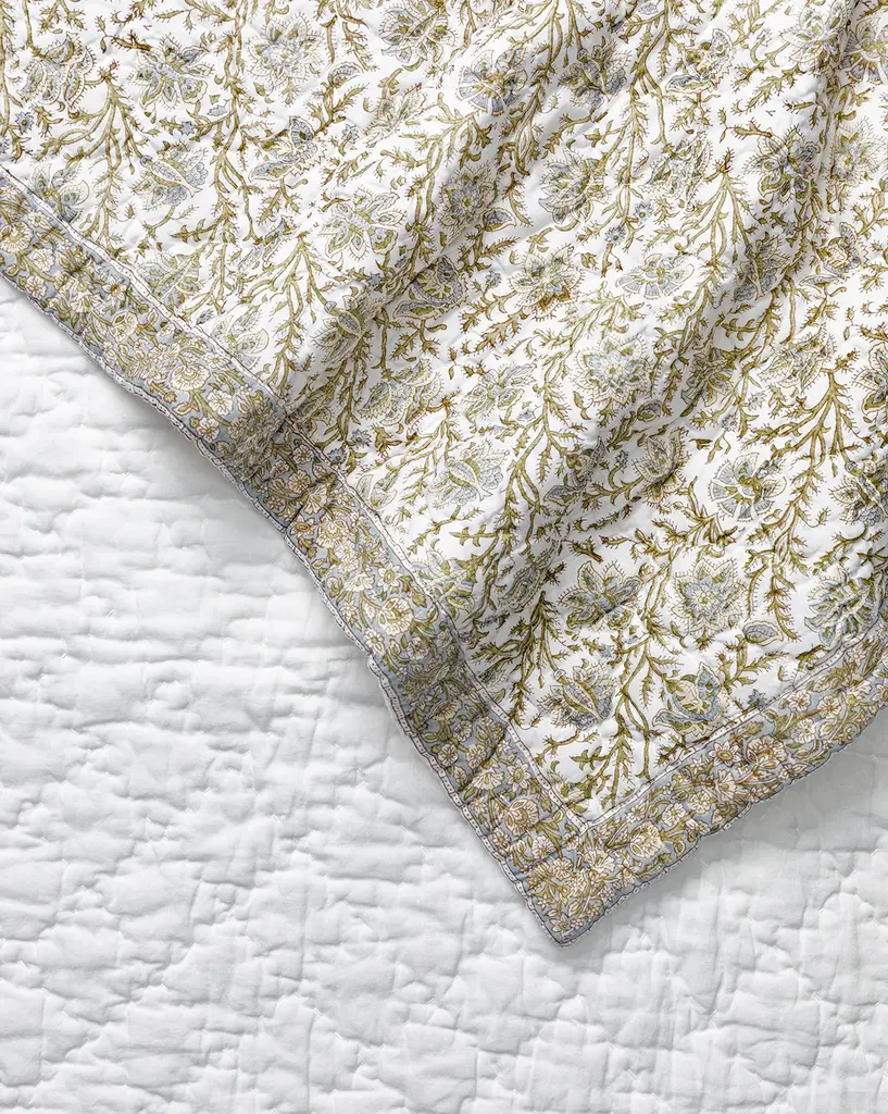 Bring softness and subtle charm to your child's room with the Seton Kids Block Print Quilt. Featuring calming, earthy tones and an intricate block-printed floral motif, this quilt offers cozy comfort and artisanal quality that feels timeless and inviting a piece they'll love for years to come.