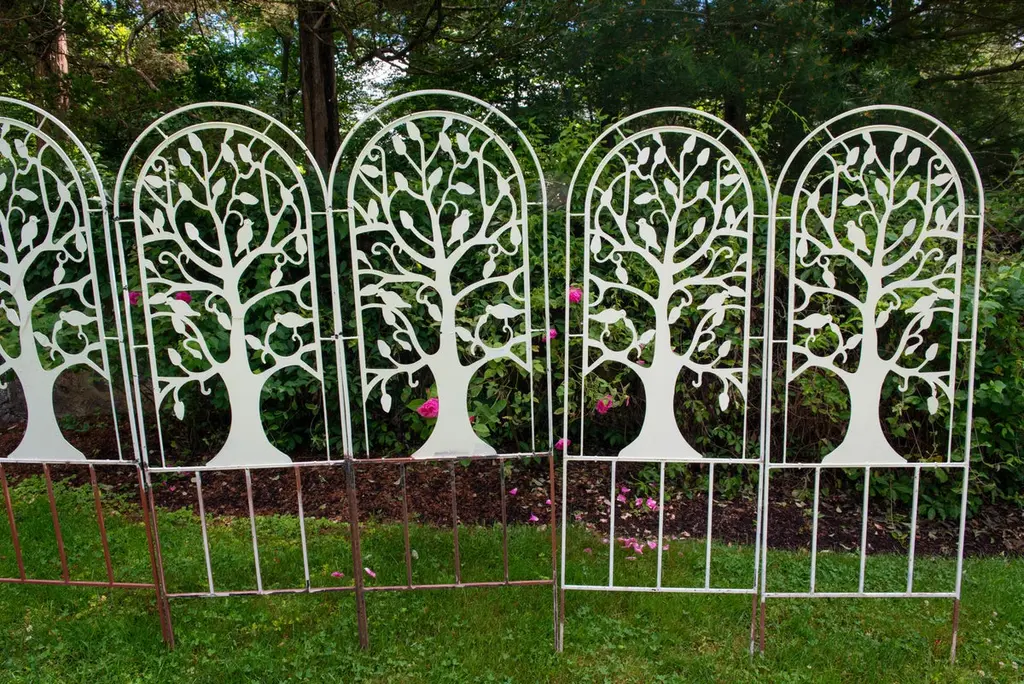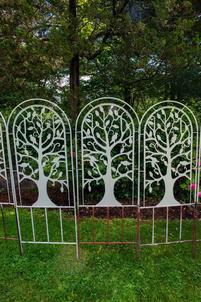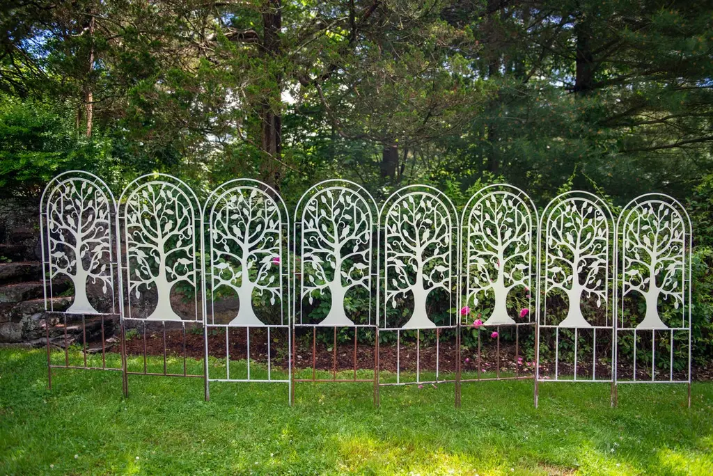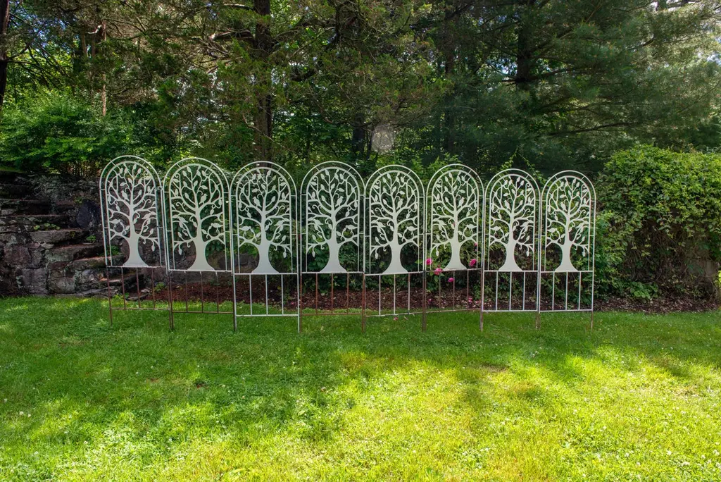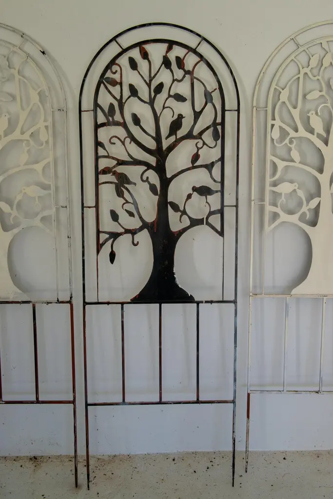 Sold and priced as a set of seven trellises. Three sets of seven metal garden tree and bird trellises are available. Create your own garden or garden room dramatic background with these arched tree and bird trellises. Each tree is adorned with three birds. Each trellis is self- supporting with earth anchoring rods. Use your imagination. Buy one, two, or three sets. Seven, fourteen, or twenty-one pieces.
