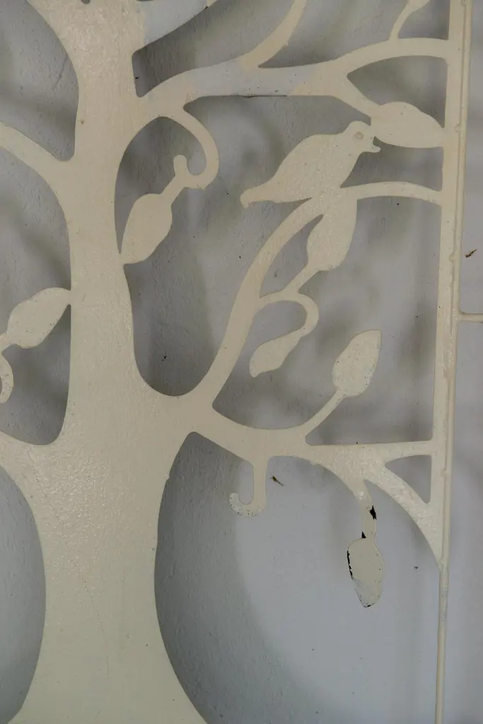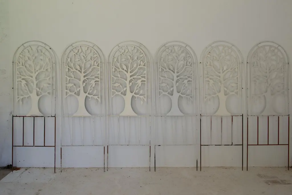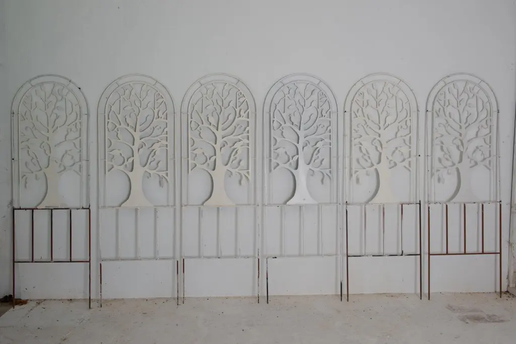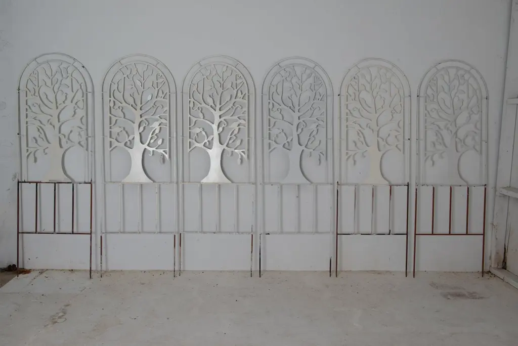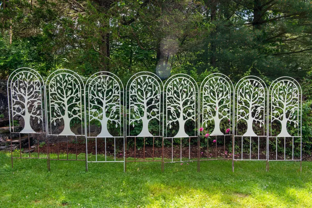 Sold and priced as a set of seven trellises. Three sets of seven metal garden tree and bird trellises are available. Create your own garden or garden room dramatic background with these arched tree and bird trellises. Each tree is adorned with three birds. Each trellis is self- supporting with earth anchoring rods. Use your imagination. Buy one, two, or three sets. Seven, fourteen, or twenty-one pieces.
