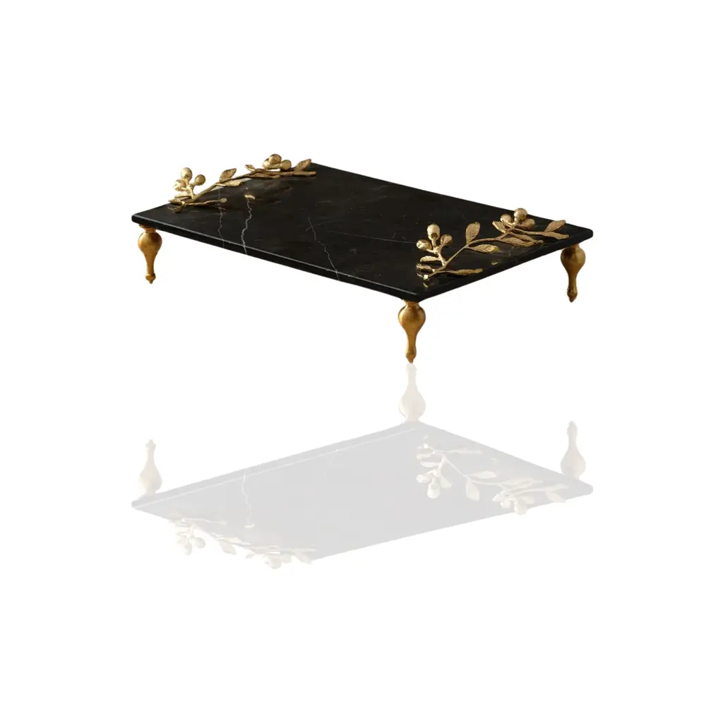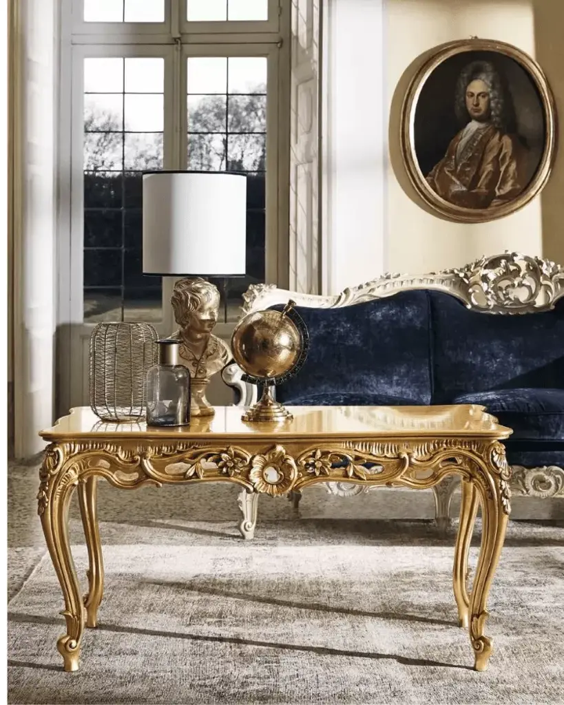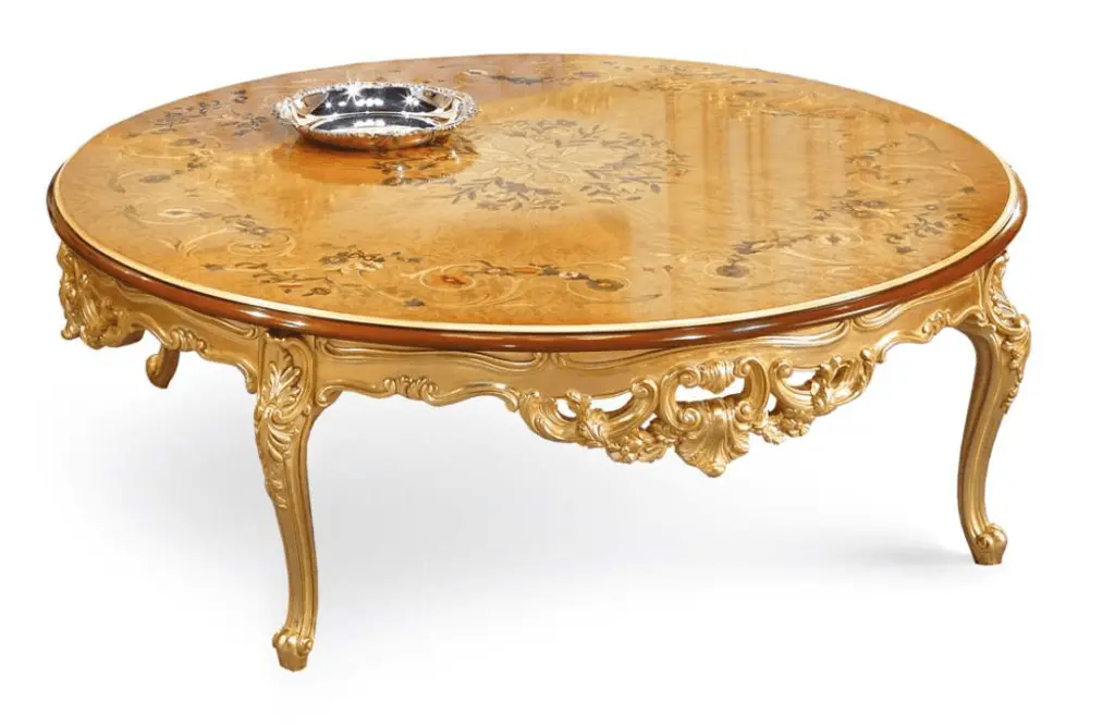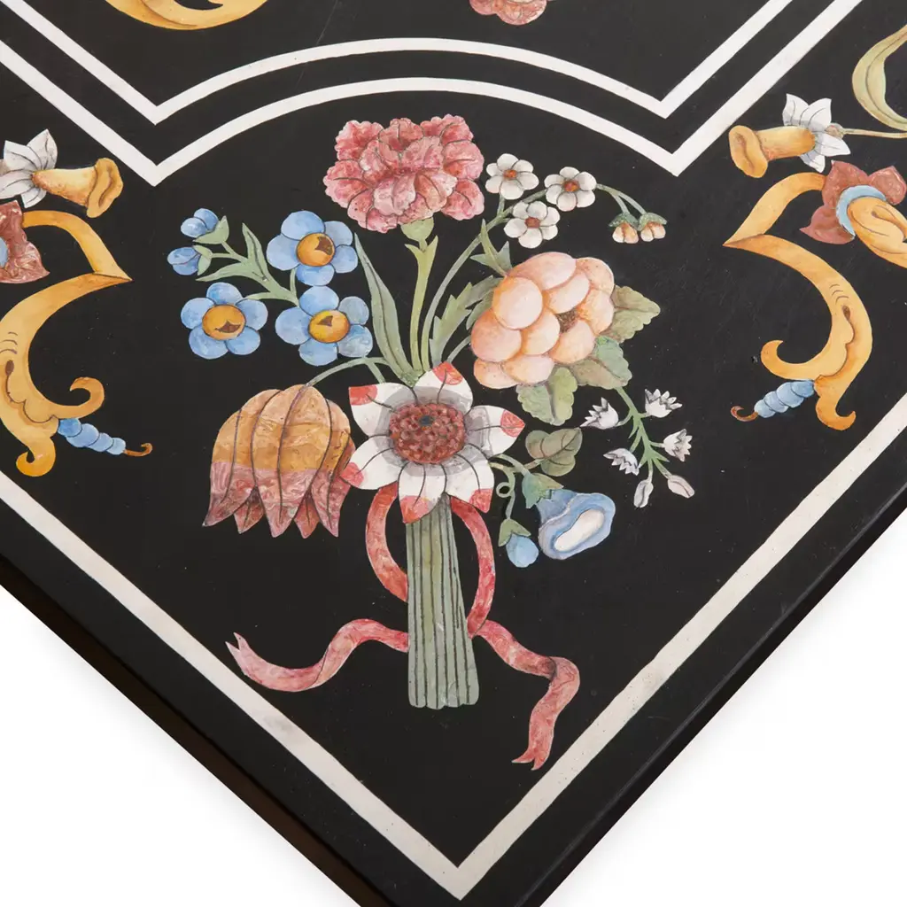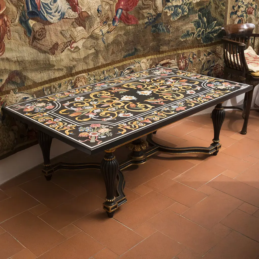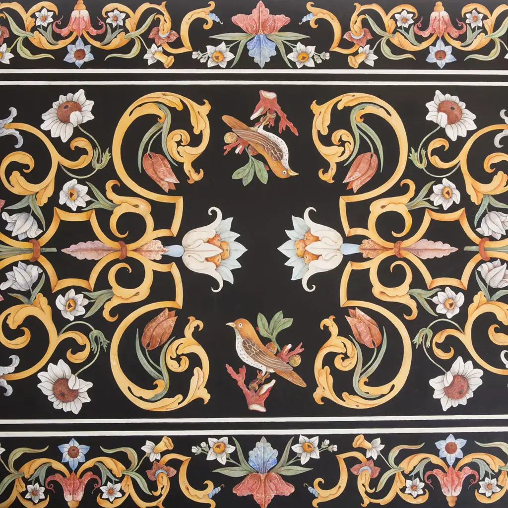 Richly-decorated table top made of black slate featuring a coral flower and yellow bird motif in a polychrome scagliola inlay inspired by an 18th-century original. The polished finishing and the flawless carved wood support add to this ornate masterpiece.