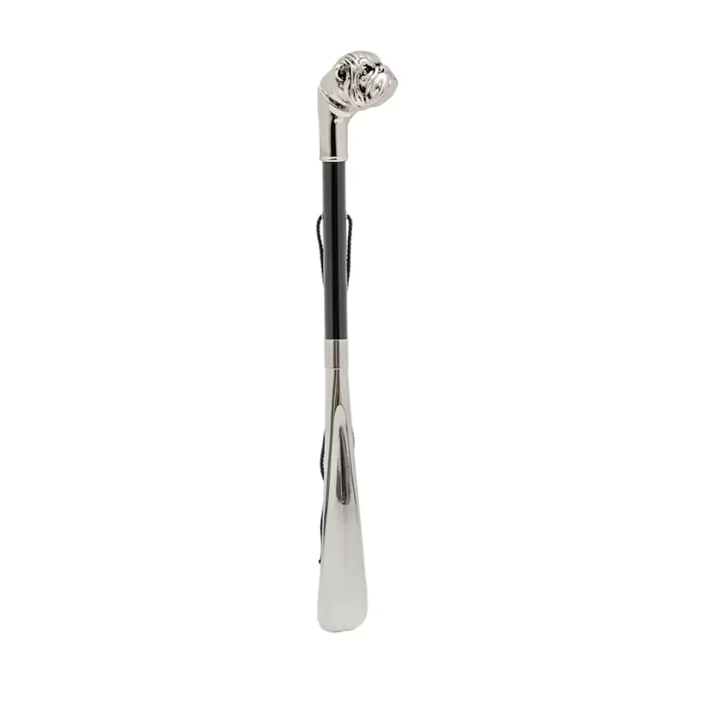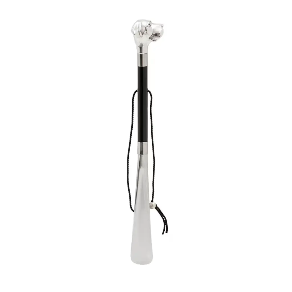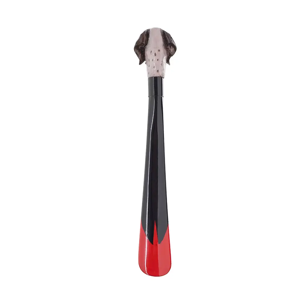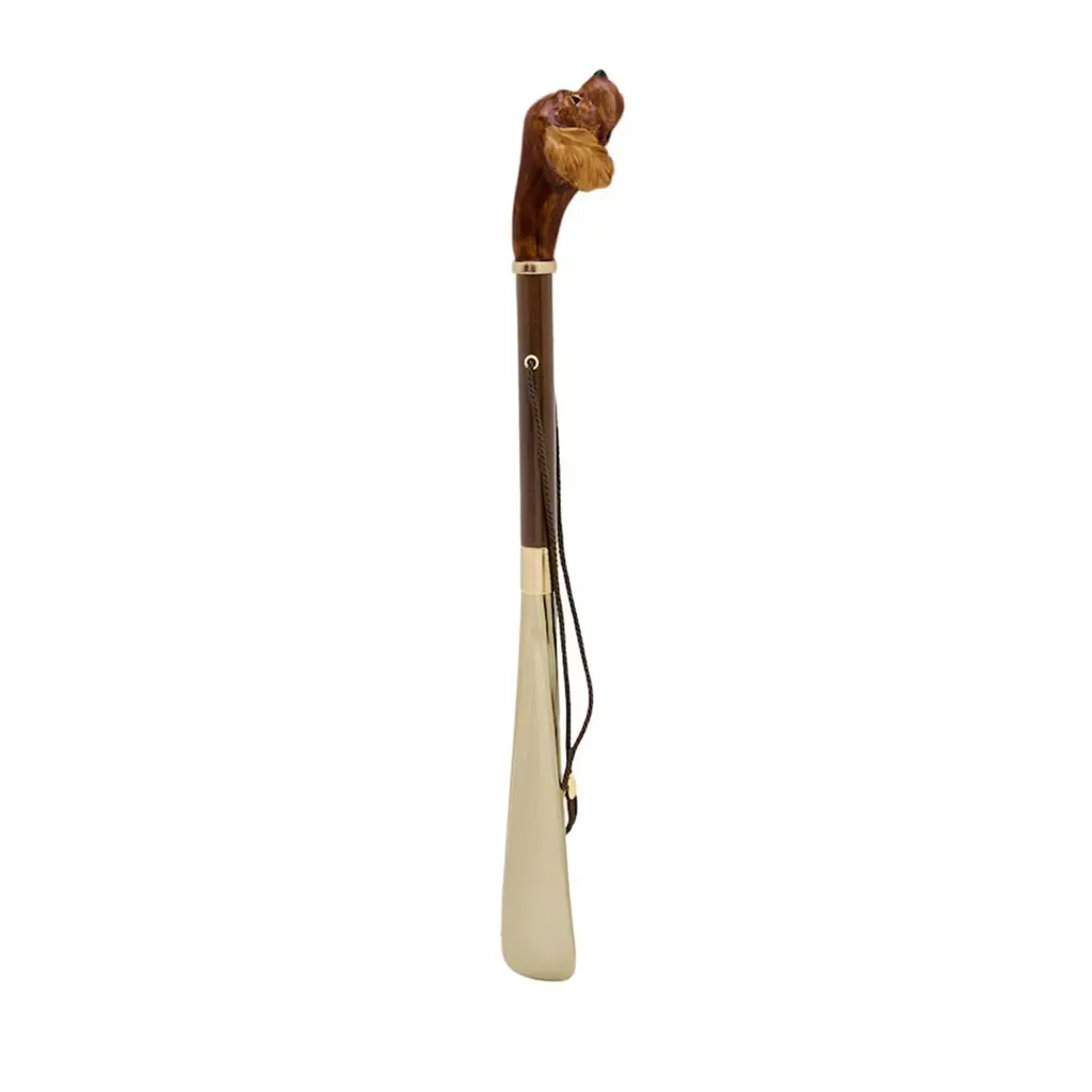 Whimsical actualization of a setter wearing a suit, this shoehorn is an artisan gem for hunting aficionados. A painstaking manual work leads to the detailed zoomorphic design and handmade decorations, which accent the Setter marble powder handle and the ABS paddle, respectively. Sealed by a hand-decorated brass ring, the piece comes in an exclusive box.