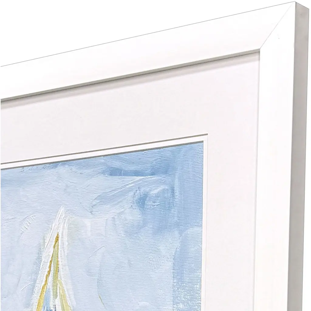 Blue and white sailboats have a playful tone. Double matted in white and blue and framed in a block profile moulding in a matte white finish.