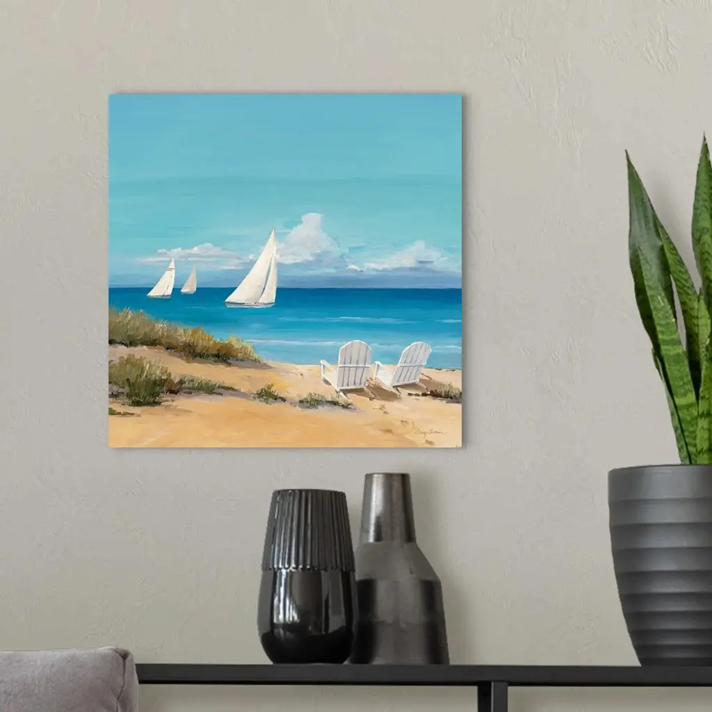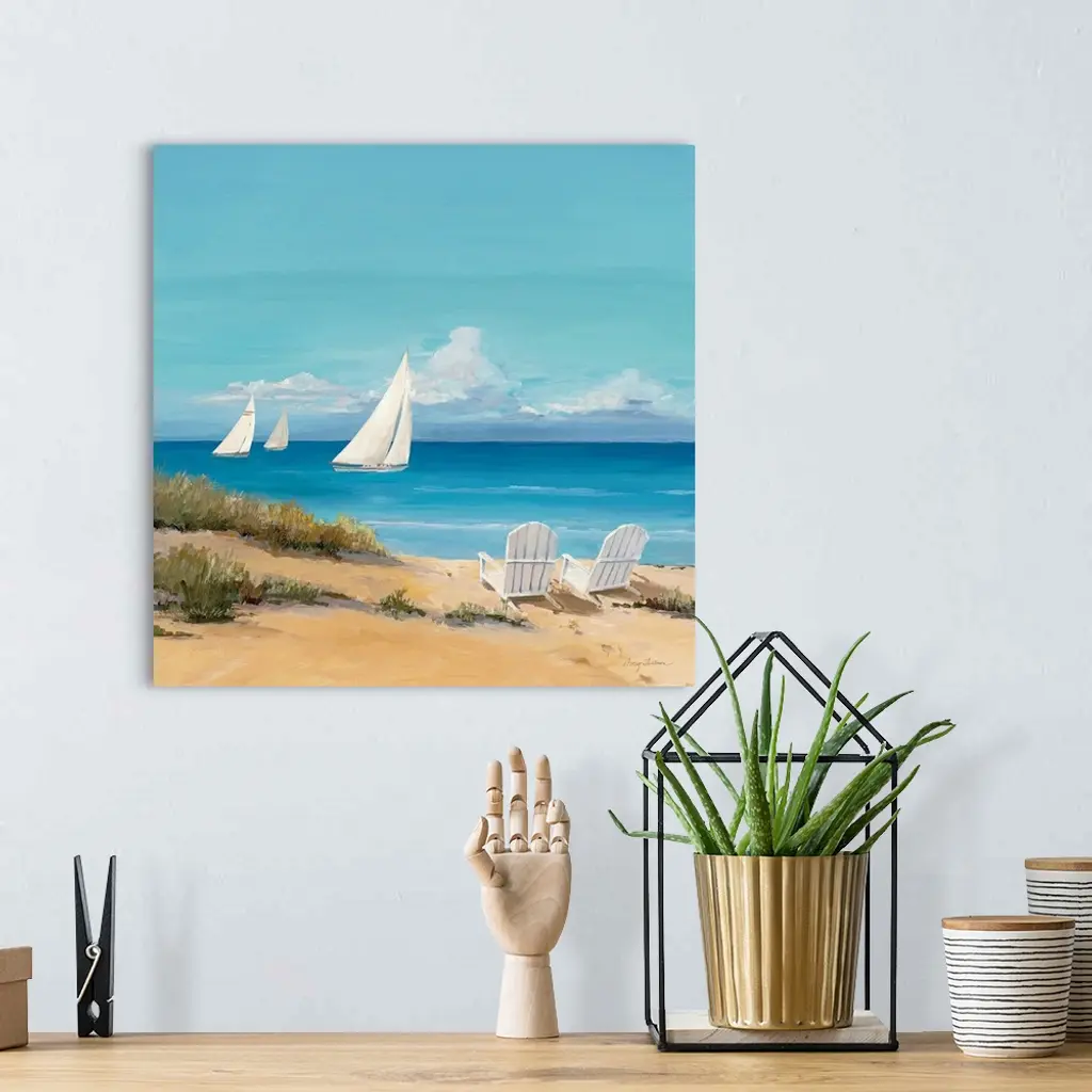 Large contemporary art shows a trio of sailboats traveling through the open waters of an ocean on a sunny day. Within the sandy shores in the foreground, a couple Adirondack chairs sit empty on a barren beach.