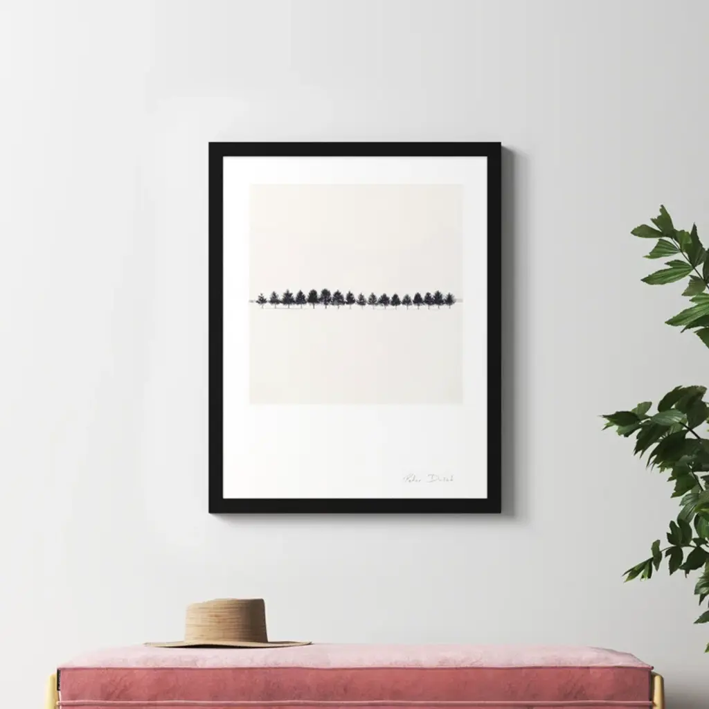 Seventeen Trees. Guided by Japanese aesthetic principles, award-winning photographer Peter Dusek creates intimate, surreal landscapes defined by their abstraction of color + form. This piece is printed on paper in the USA and arrives in a wooden frame.