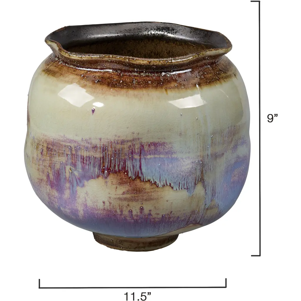 Individually crafted by master artisans, each of these ceramic vessels features softly rounded and dimpled shapes. Layers of blue, natural, and purple glazes are applied using a technique that reacts uniquely on each piece, ensuring that no two are completely identical. Their warmth and beauty complement a variety of fillerstry similar shades like feathers and reeds, or add brighter contrasting colors like florals and greenery.