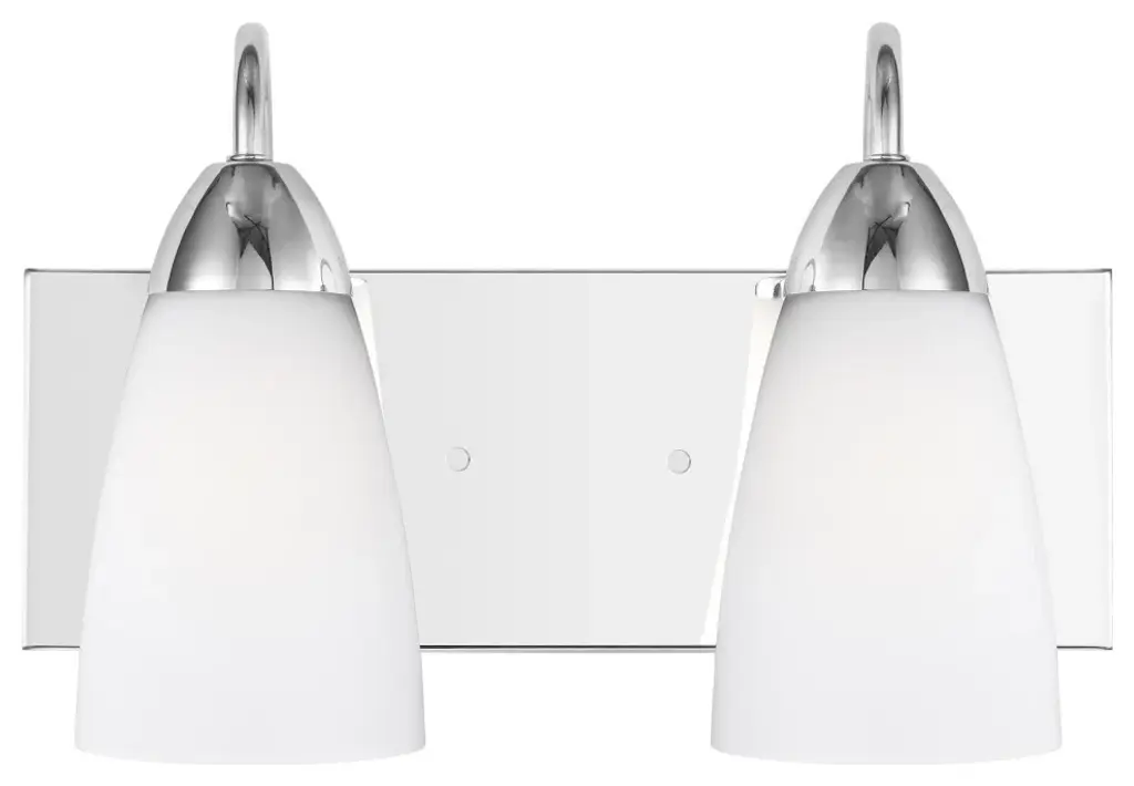 The Generation Lighting Lighting Seville two light vanity fixture in chrome is an ENERGY STAR qualified lighting fixture that uses fluorescent bulbs to save you both time and money. The Seville collection represents commitment to high style at a sharp price. The modernist design is epitomized by the teardrop curves in the arms tipped by etched glass diffusors throughout the chandeliers and bath fixtures. The collection offers a "whole home" lighting solution in every imaginable category. The assortment includes nine-light, five-light, and three-light chandeliers (either with up-light or down-light), pendants in four sizes as well as one-light, two-light, three-light, four-light and five-light wall/bath fixtures. Install a stylish and elegant addition to any room in the house. Seville is offered in Brushed Nickel and Burnt Sienna finishes.Lighting Information:Bulb type: 2 A19 Medium 9.3 watt light bulbsNumber of bulbs: 2Bulb(s) includedcETL Listed