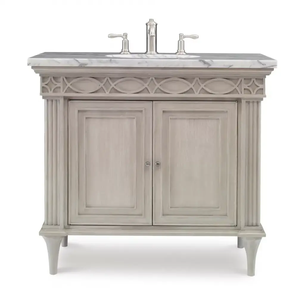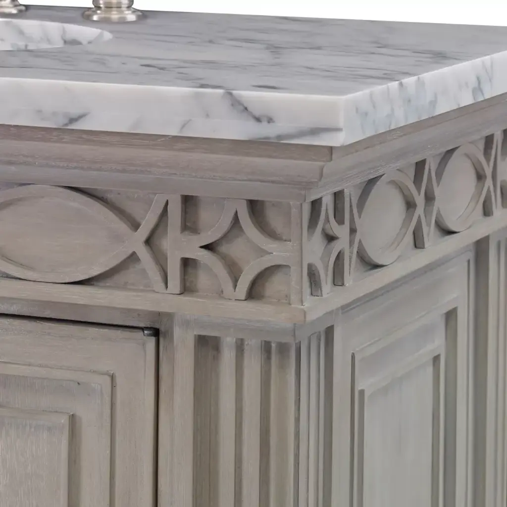 This intricate sink chest features a geometric tracery design which wraps the front and sides. Mahoni solids and veneer are finished in a French white. A Statuario Angel marble top includes an installed white porcelain sink bowl.