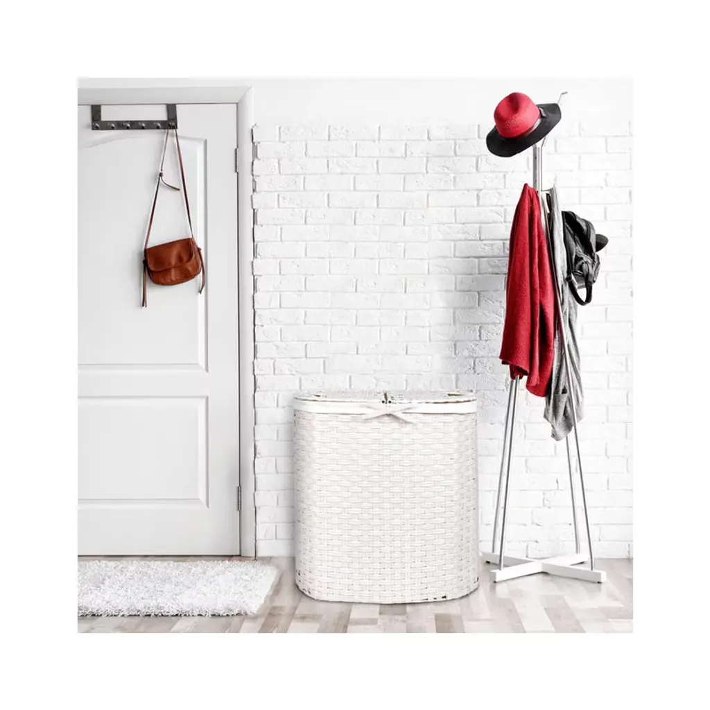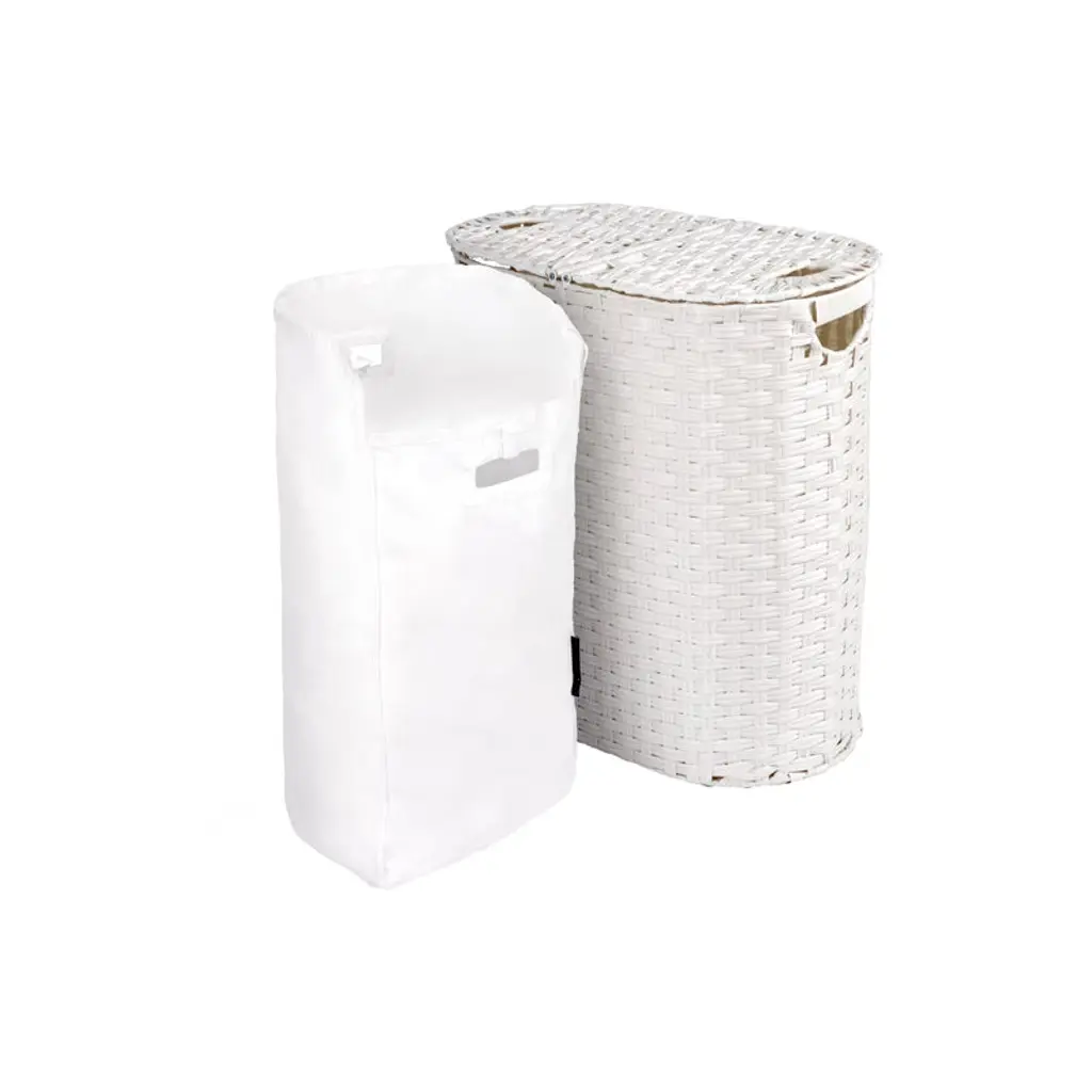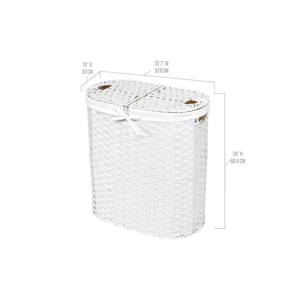 Seville Classics Handwoven Lidded Oval Double Laundry Hamper is a stylish and practical way to store laundry. The handwoven oval lidded hamper includes two removable bag liners (100% polyester). Made from woven synthetic strands wrapped around a study steel frame. Uniquely handwoven by local artisans, so there may be slight variations in size and imperfections. The oval hamper features two thick, removable, and machine washable 100% Polyester canvas liner, making it easy to transport your laundry. The hamper features two cut-out handles for easy carrying. No assembly required.