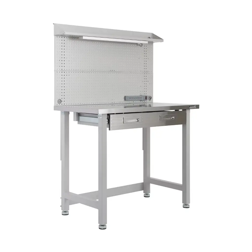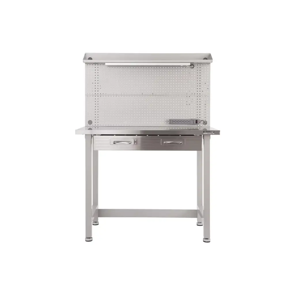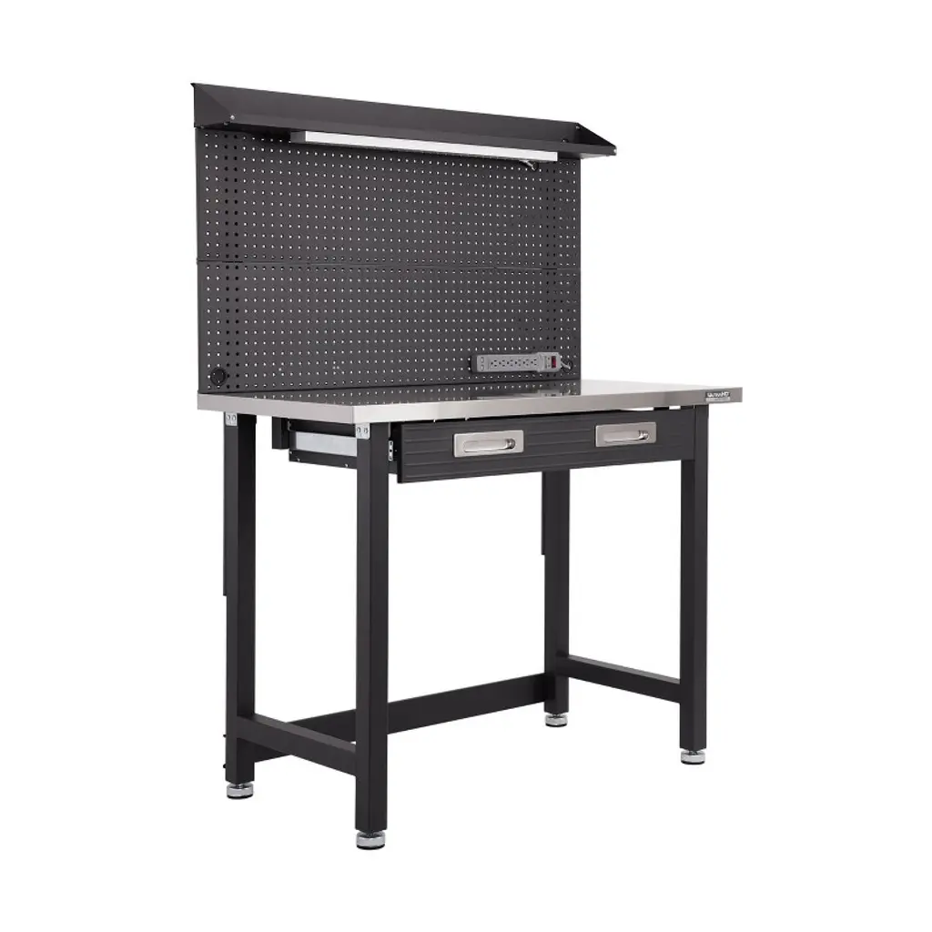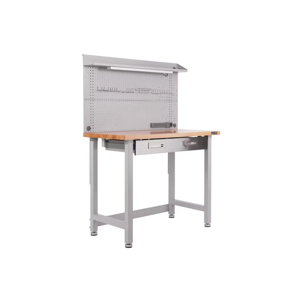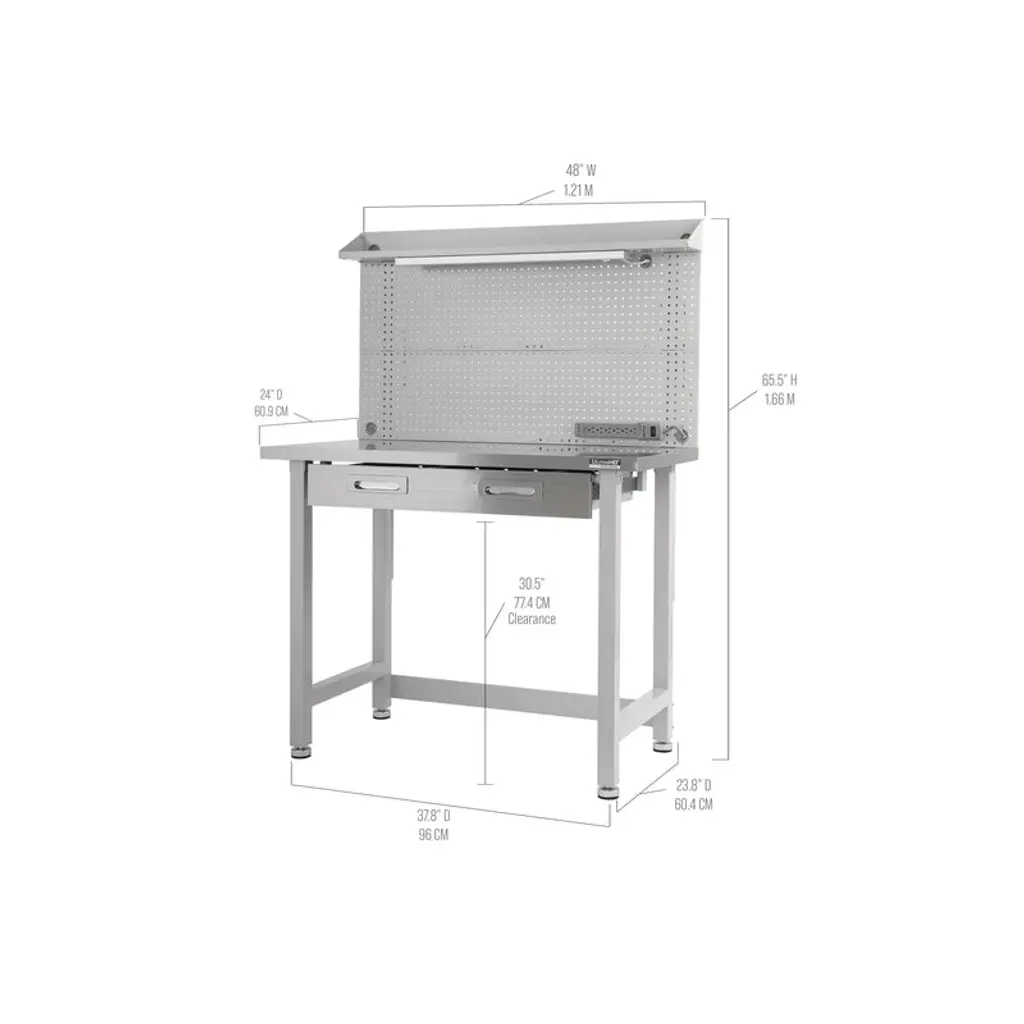 Upgrade your home or garage workshop with Seville Classics UltraHD lighted work center with steel pegboard. Enjoy a solid beech wood top (1.5" thick) mounted on a commercial-grade steel frame. Store tools and equipment on the large (24" x 48") steel pegboard which includes a 23-piece assortment of peg hooks, hangers, and holders. The table features a pull-out organizer drawer with adjustable dividers for sorting tools, gadgets, and supplies. Work into the night with a LED light beneath the cantilevered top shelf. The storage drawer features a stainless-steel front protected with UltraGuard fingerprint-resistant coating. All tools required for assembly are included for quick and easy setup. The assembled unit including the pegboard measures 48 inches wide by 24 inches deep and 65.5 inches high. The Table measures 48 inches wide by 24 inches deep and about 41.5 inches in height.
